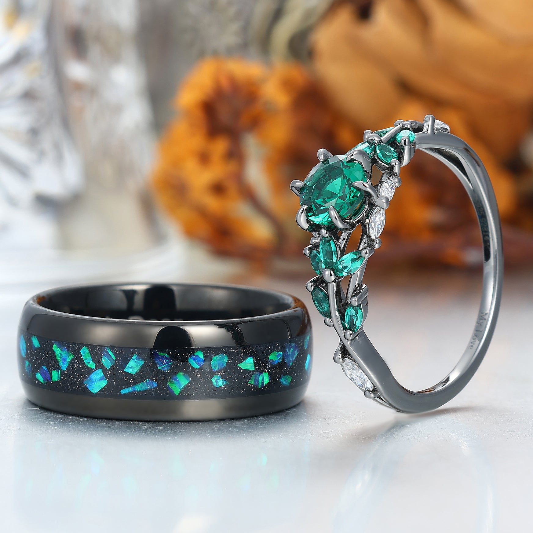 Emerald Engagement Couples Ring Set And Peacock Opal Tungsten Matching Ring His and Hers Ring Set