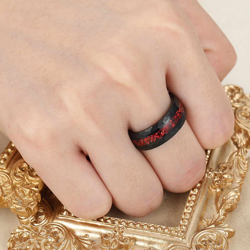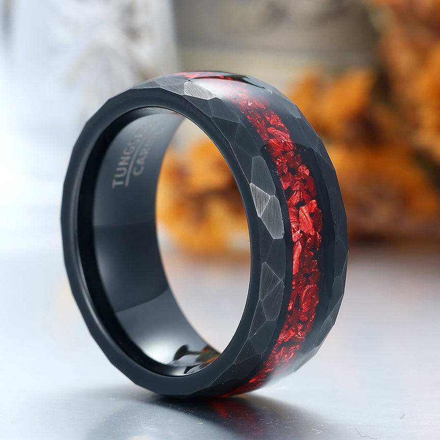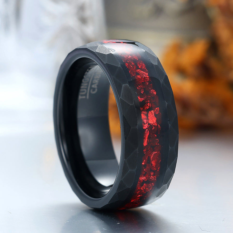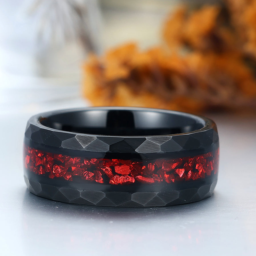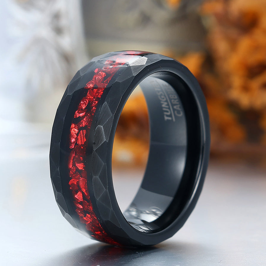 8mm Crushed Ruby Tungsten Wedding Band Red Gemstone Mens Tungsten Ring Black Hammered Promise Ring