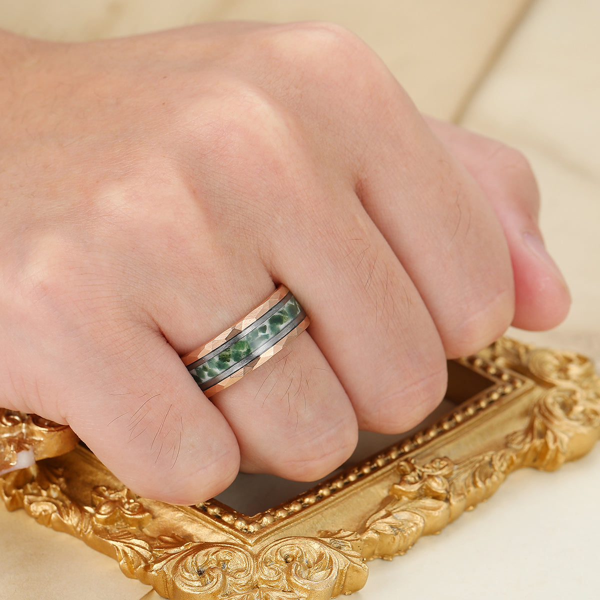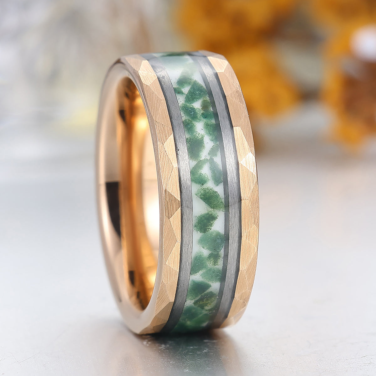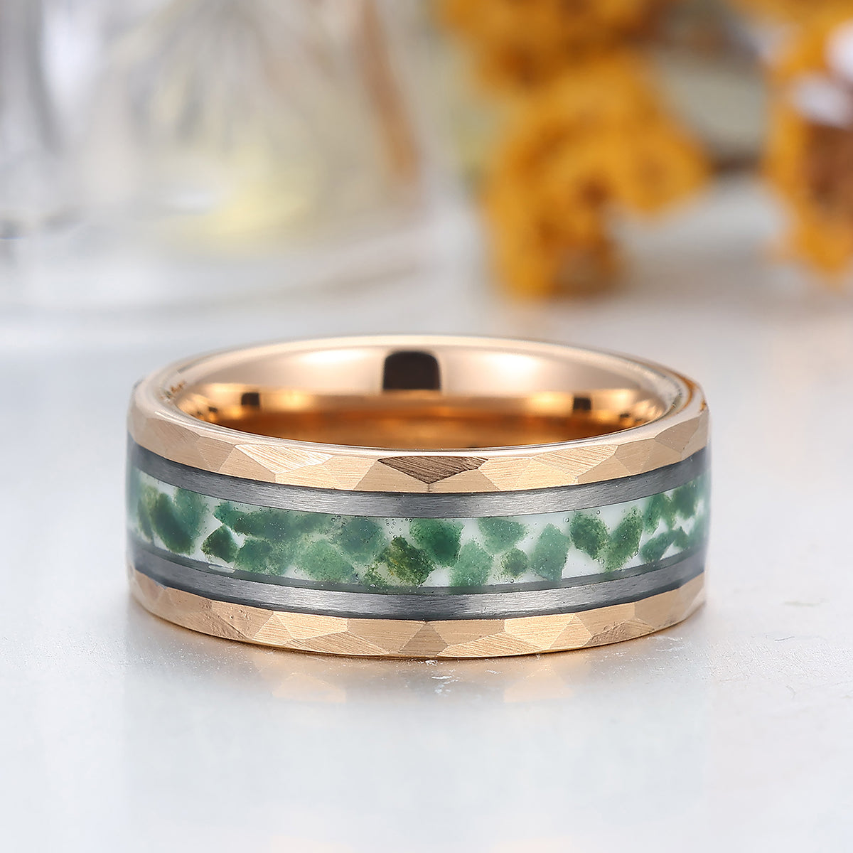 8mm Moss Agate Tungsten Men’ s Band Rose Gold Hammered Ring Green Gemstone Ring