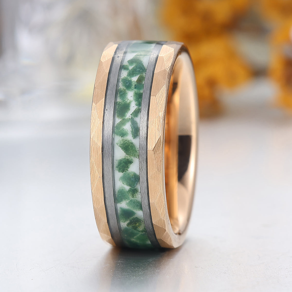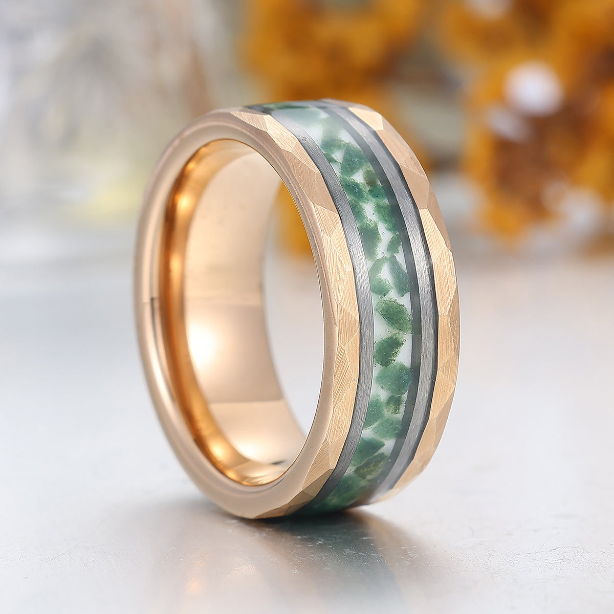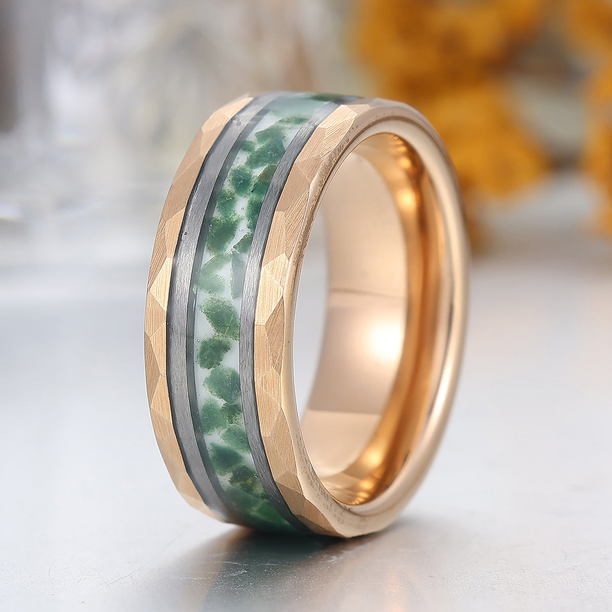 8mm Moss Agate Tungsten Men’ s Band Rose Gold Hammered Ring Green Gemstone Ring
