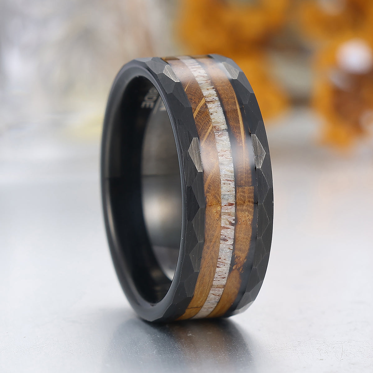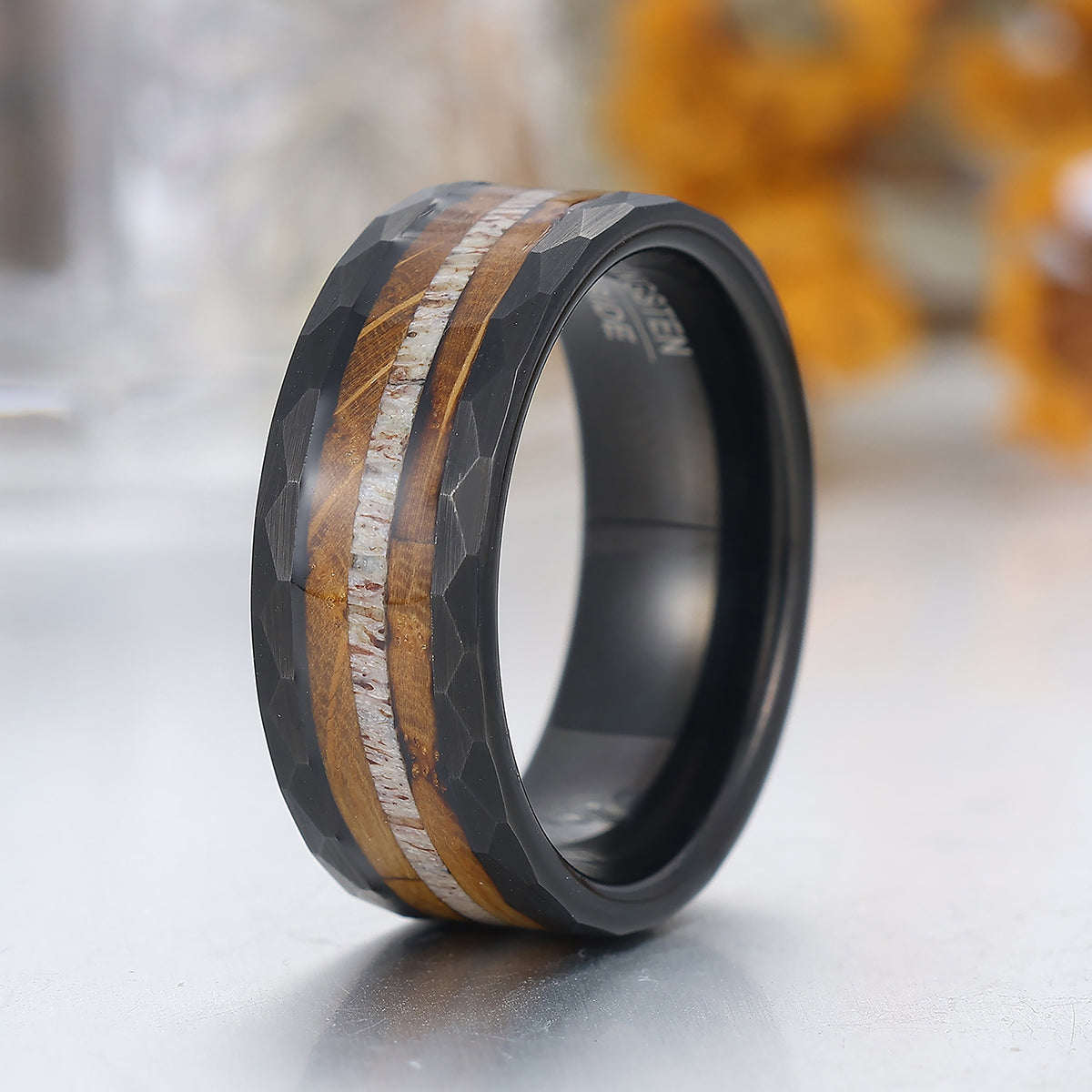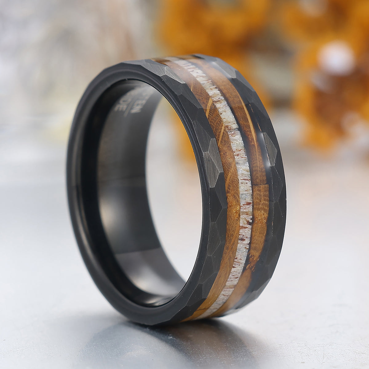 8mm Wood Strips Inlay Tungsten Ring Mens Wooden Wedding Band Hammered Black Ring
