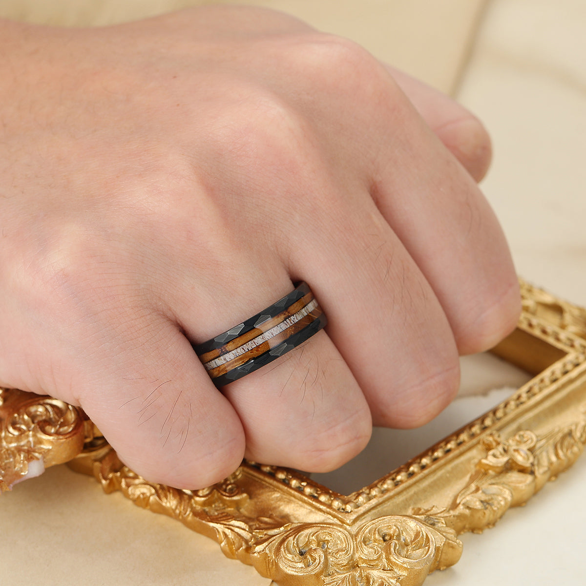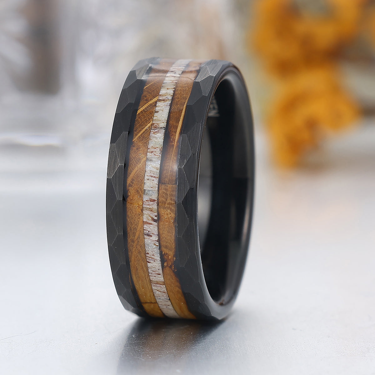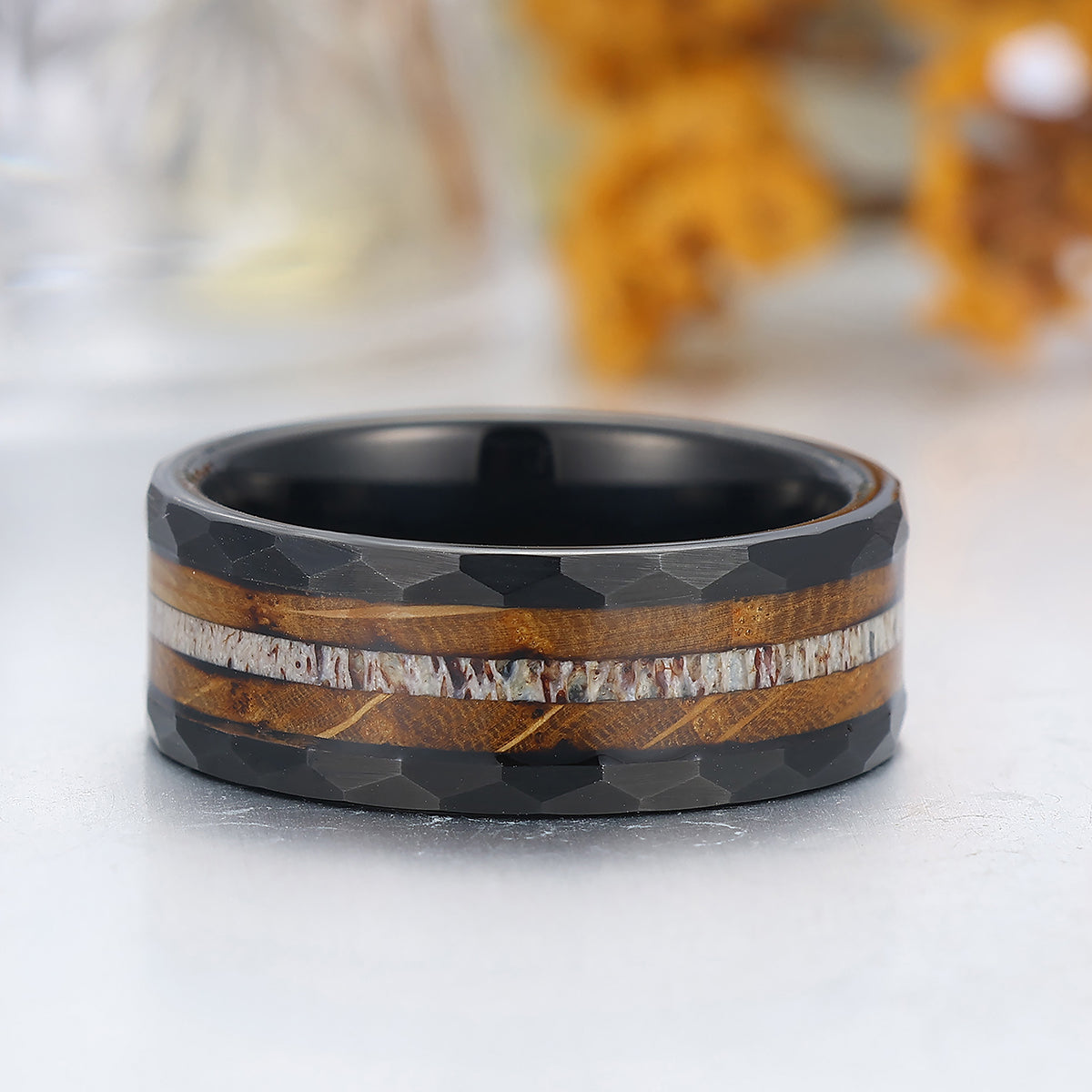 8mm Wood Strips Inlay Tungsten Ring Mens Wooden Wedding Band Hammered Black Ring