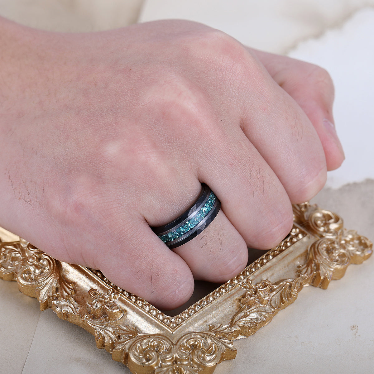 Metal Type: Tungsten Carbide - Crushed Lab Aquamarine and Two Silver Lines Inlay - Hypoallergenic