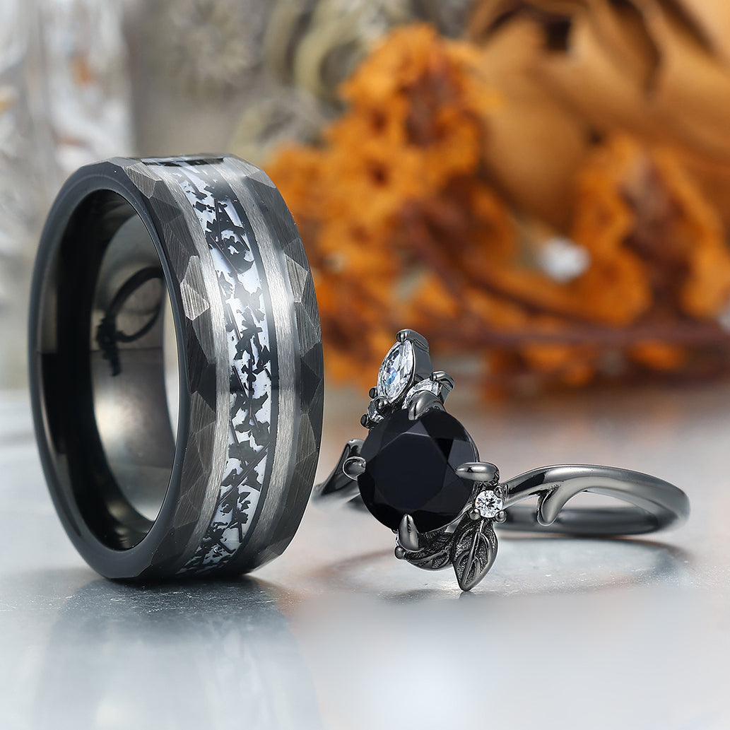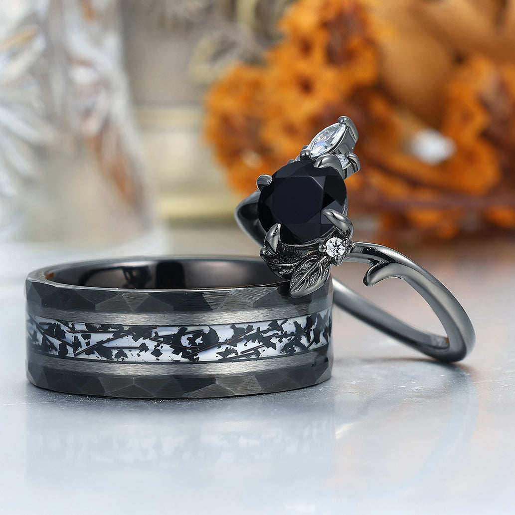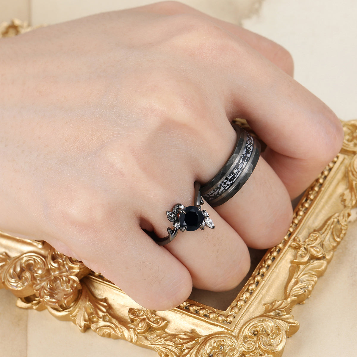 Art Deco Black Onyx Twig Engagement Couple Rings Unique S925 And Tungsten Marriage Ring