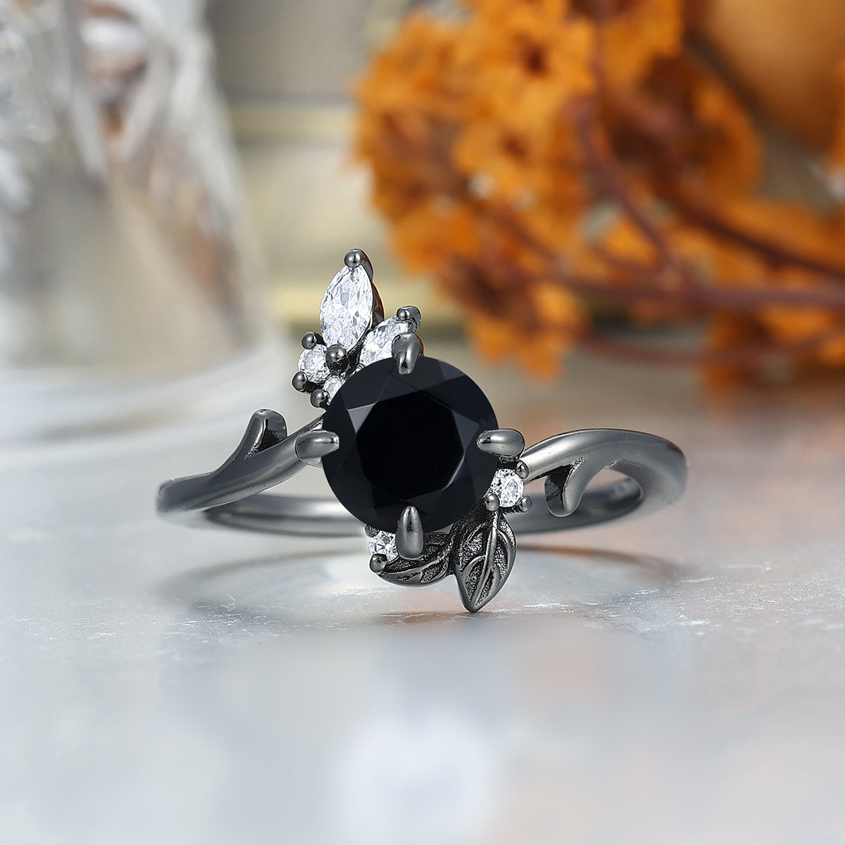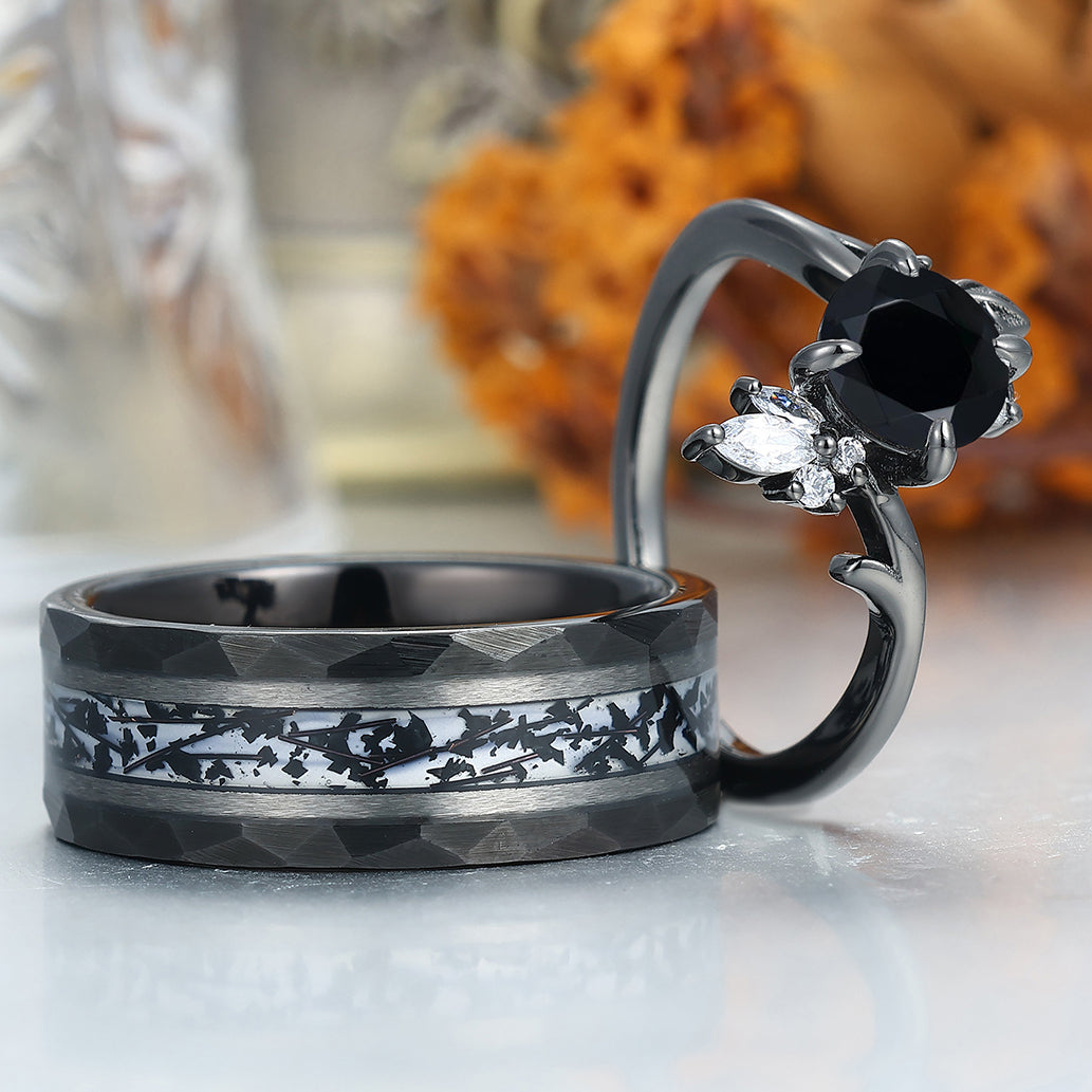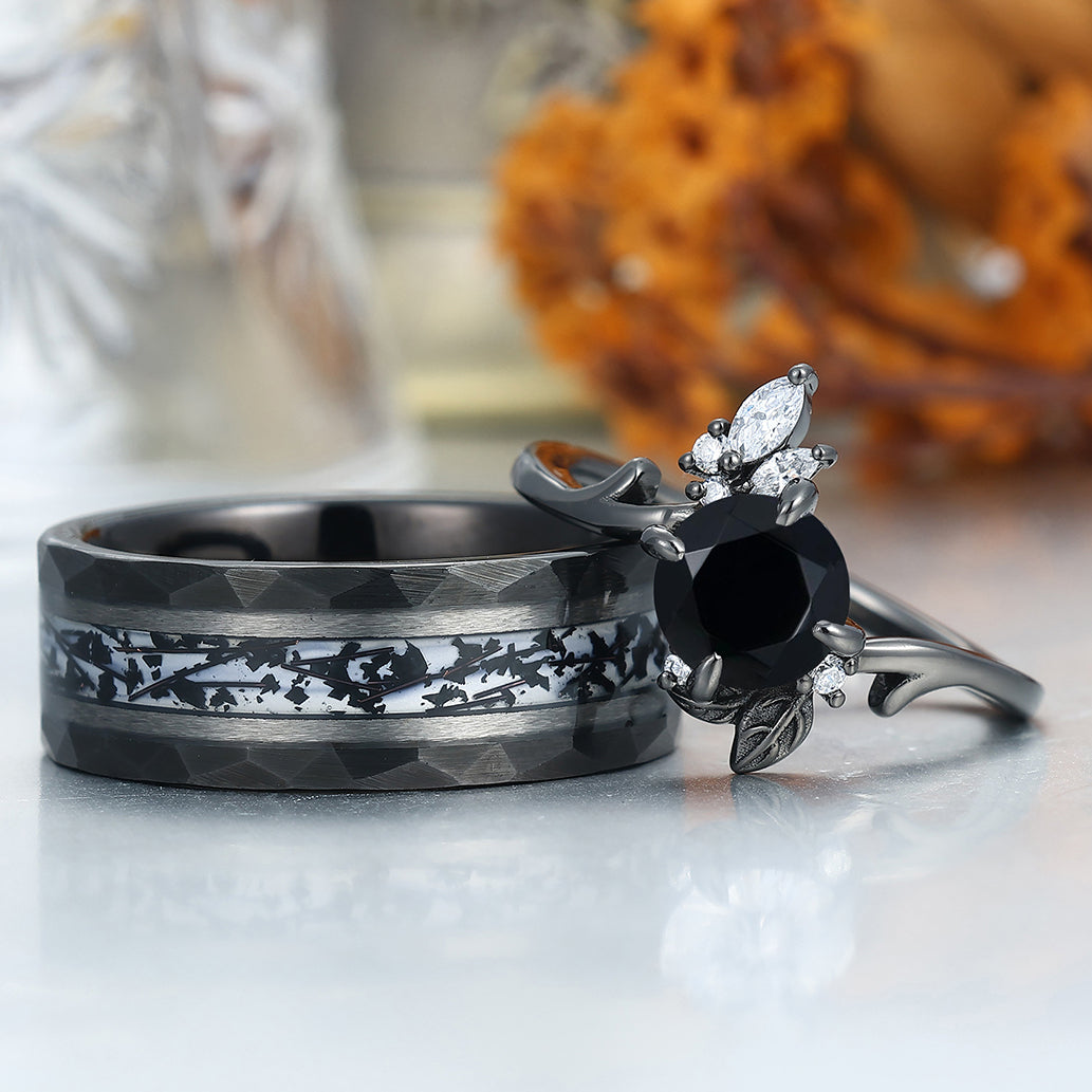 Art Deco Black Onyx Twig Engagement Couple Rings Unique S925 And Tungsten Marriage Ring