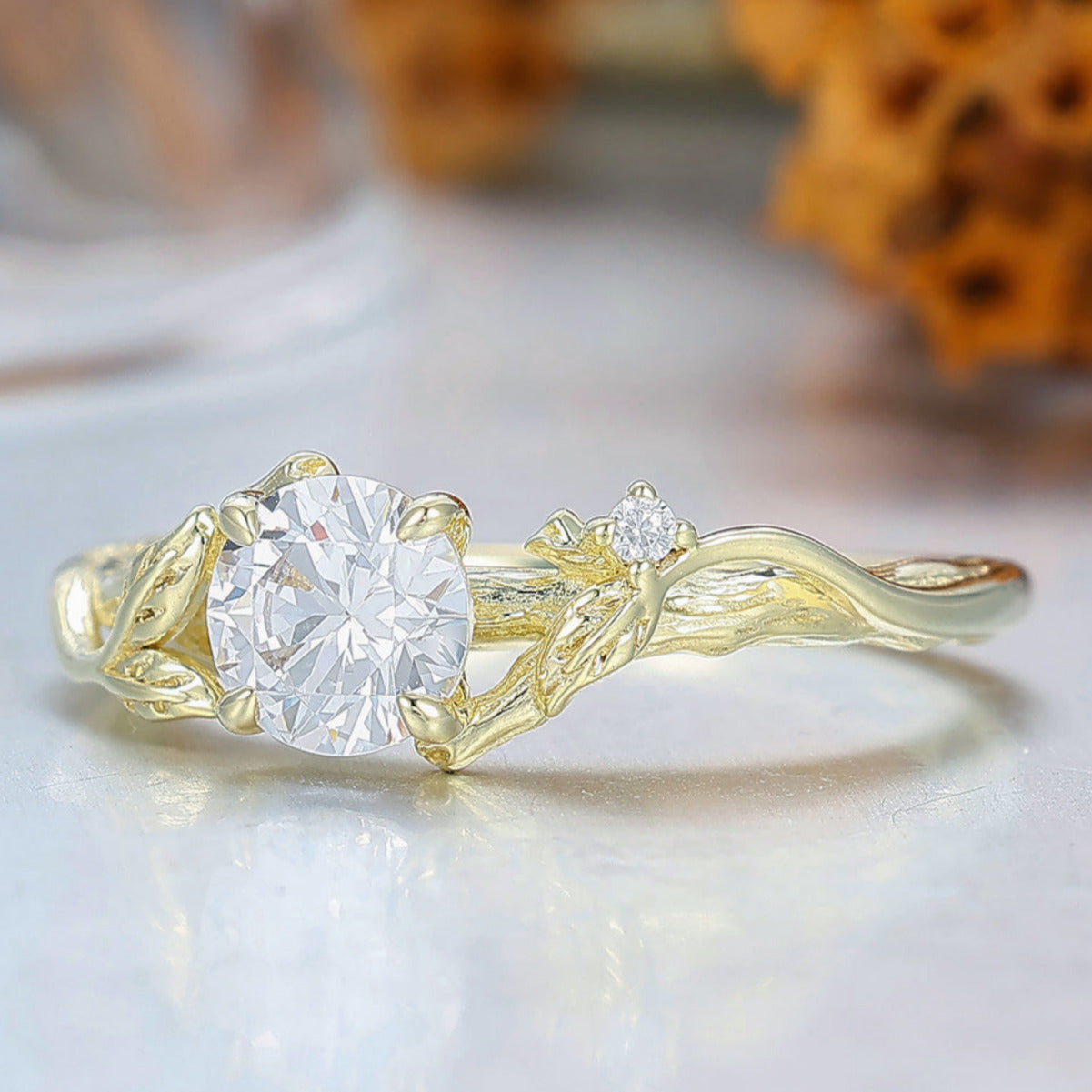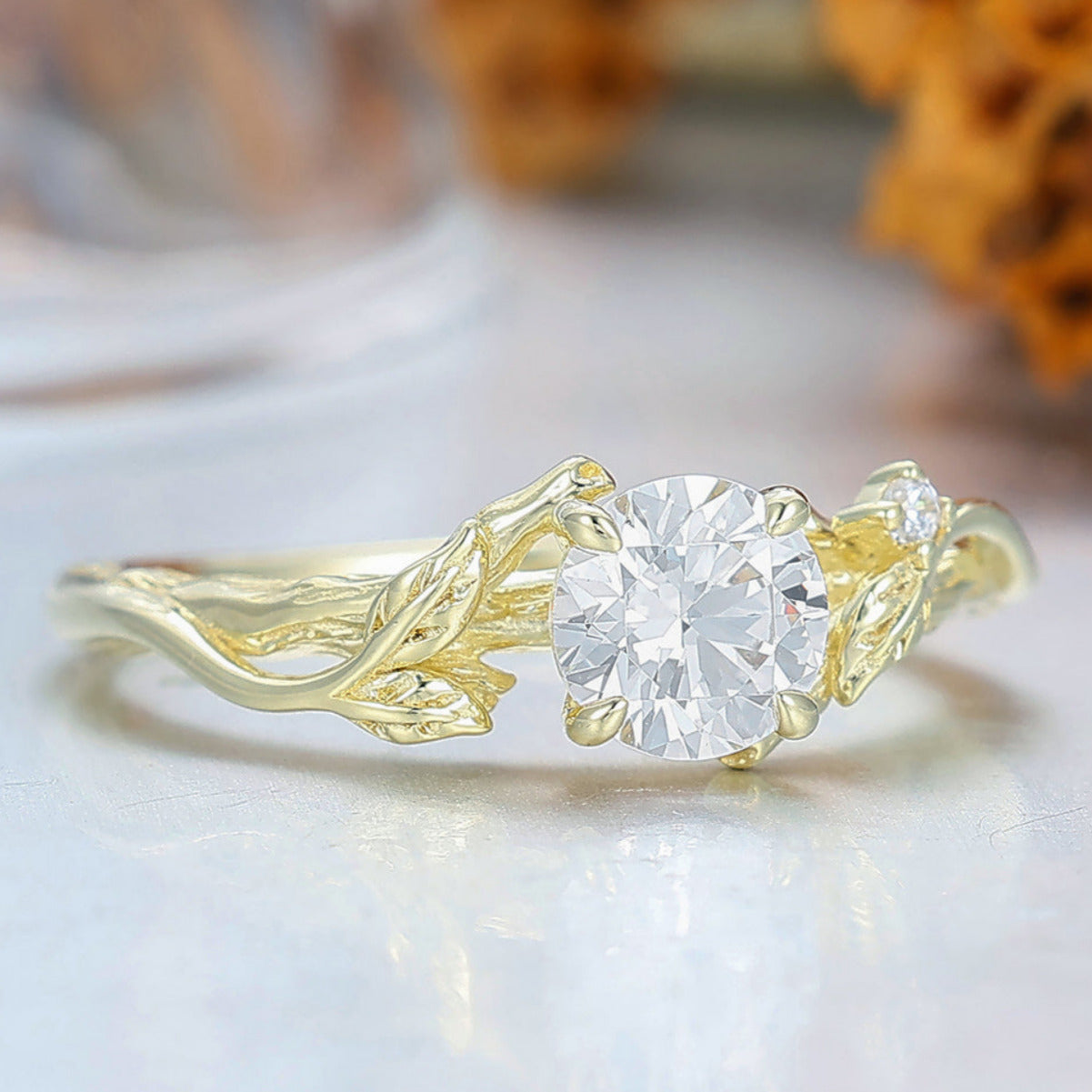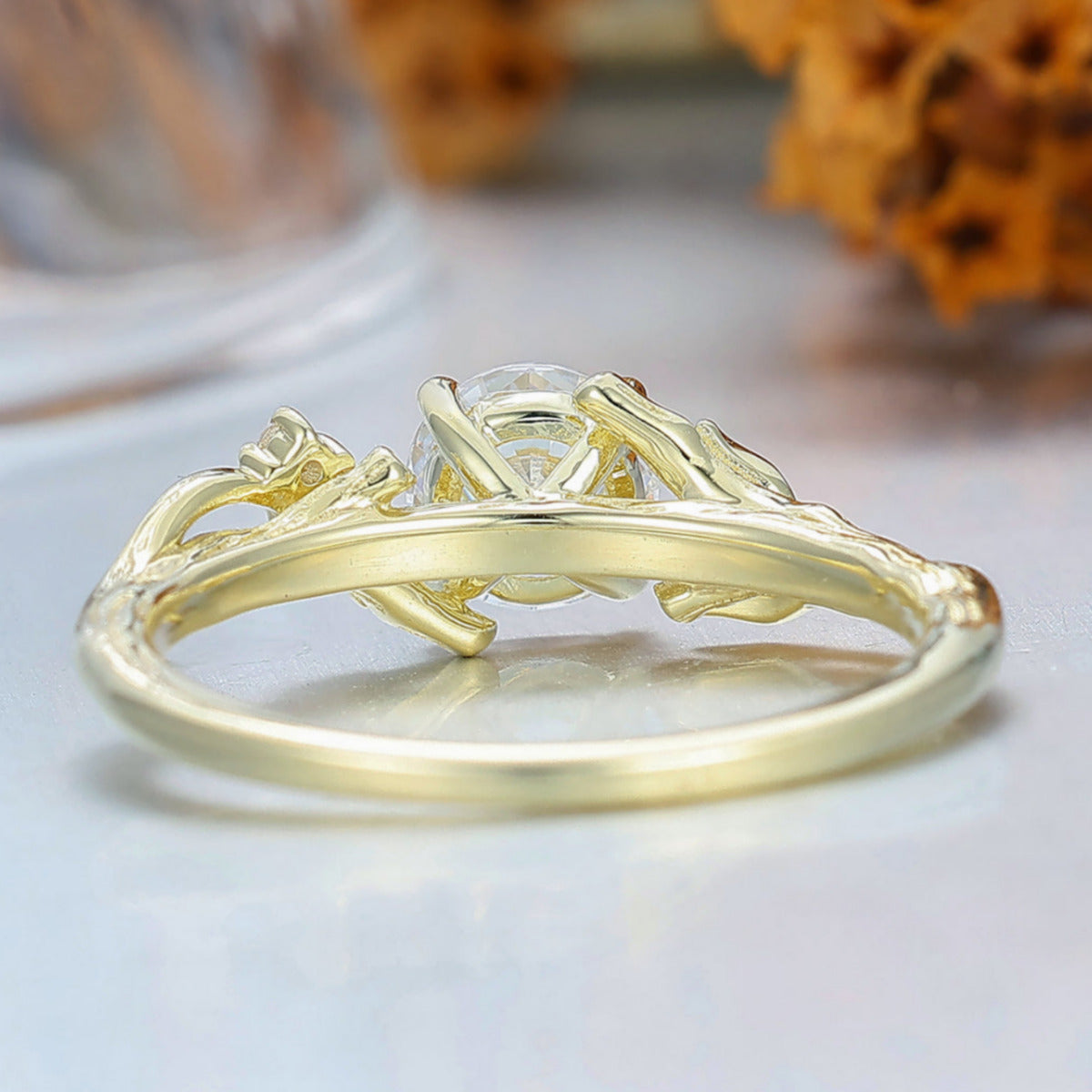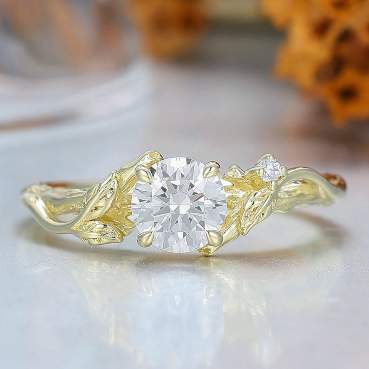 Art Deco Branch Leaf Style Round Cut Moissanite Engagement Ring 4 Prongs Anniversary Bridal Ring