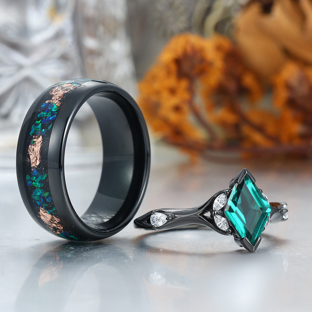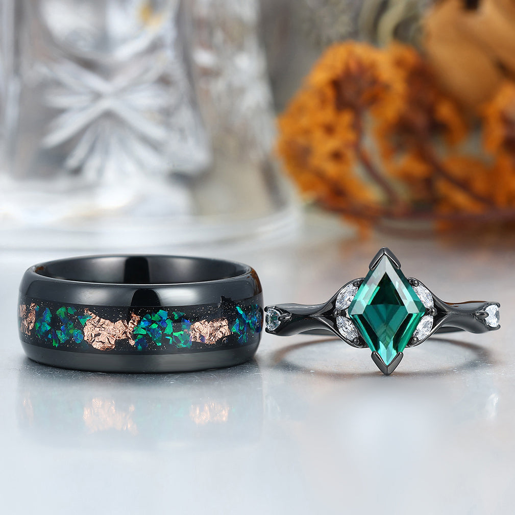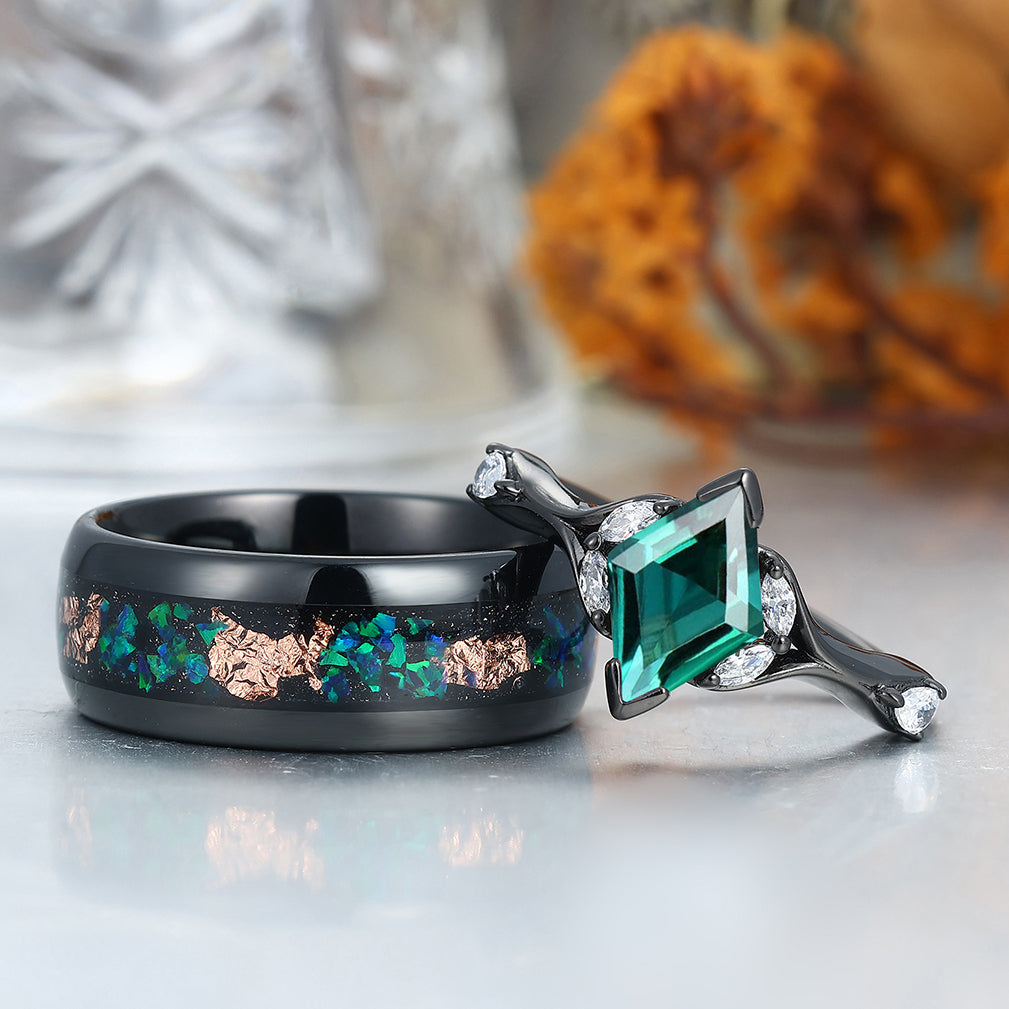 Art Deco Emerald Engagement Couples Rings Matching Green Gemstone Hammered Tungsten Matching Rings for Couples