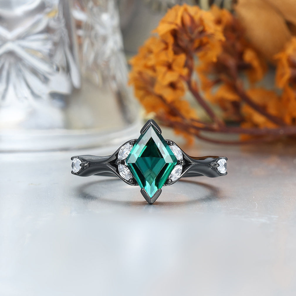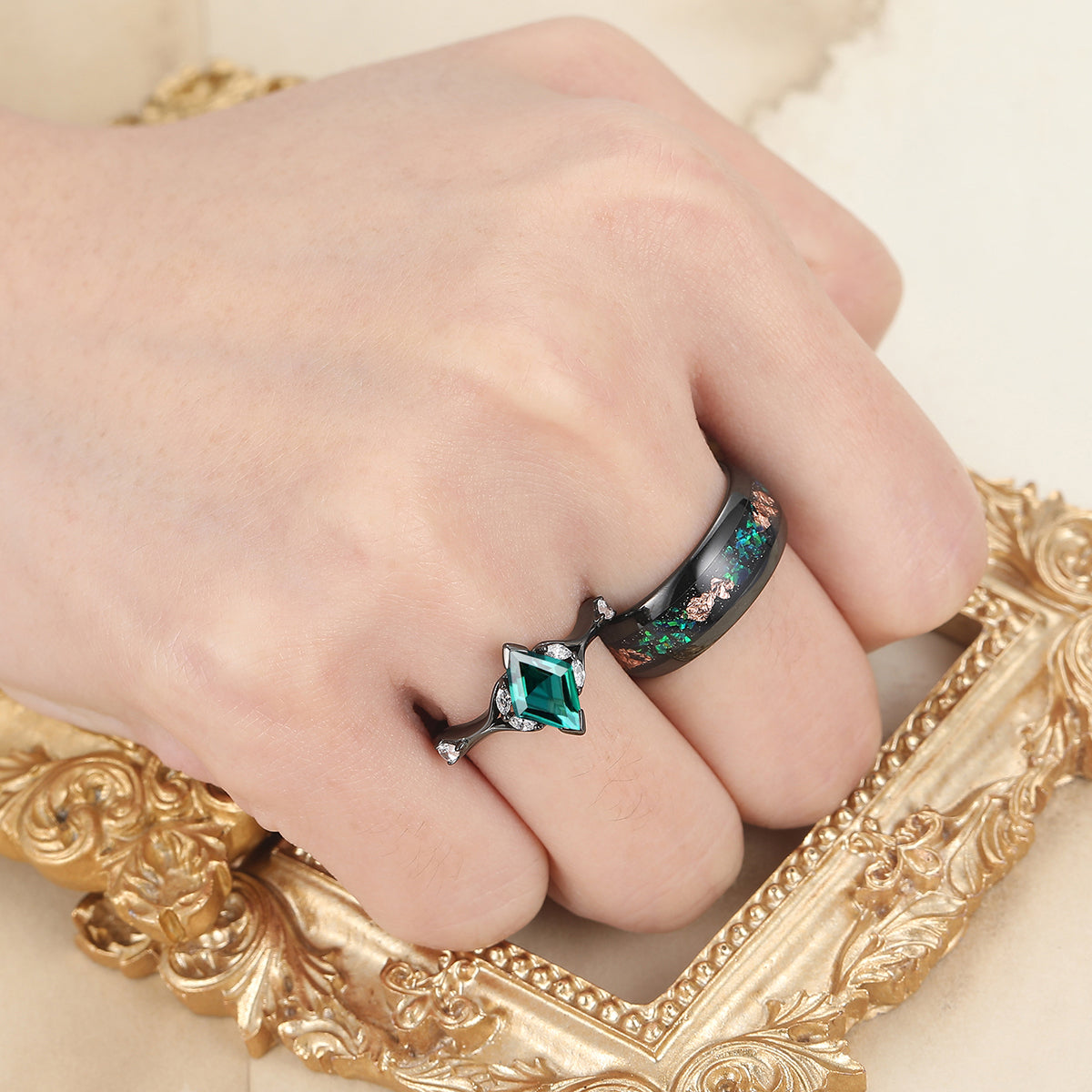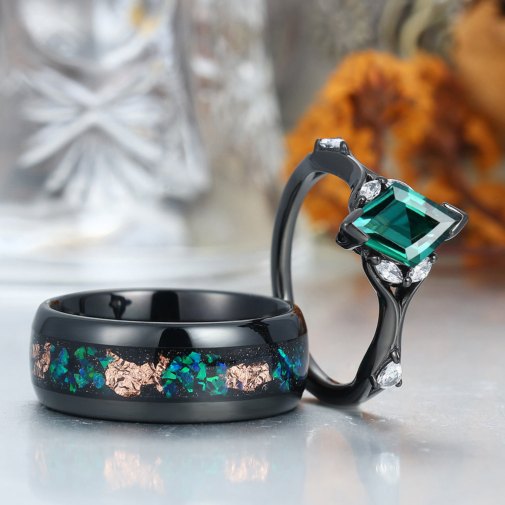 Art Deco Emerald Engagement Couples Rings Matching Green Gemstone Hammered Tungsten Matching Rings for Couples