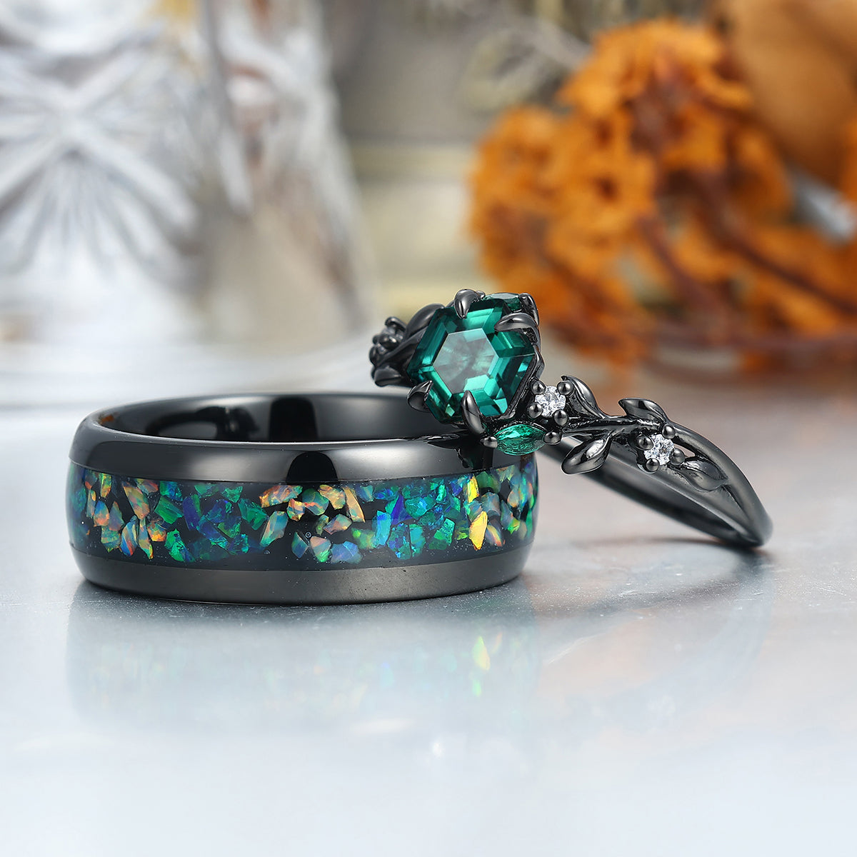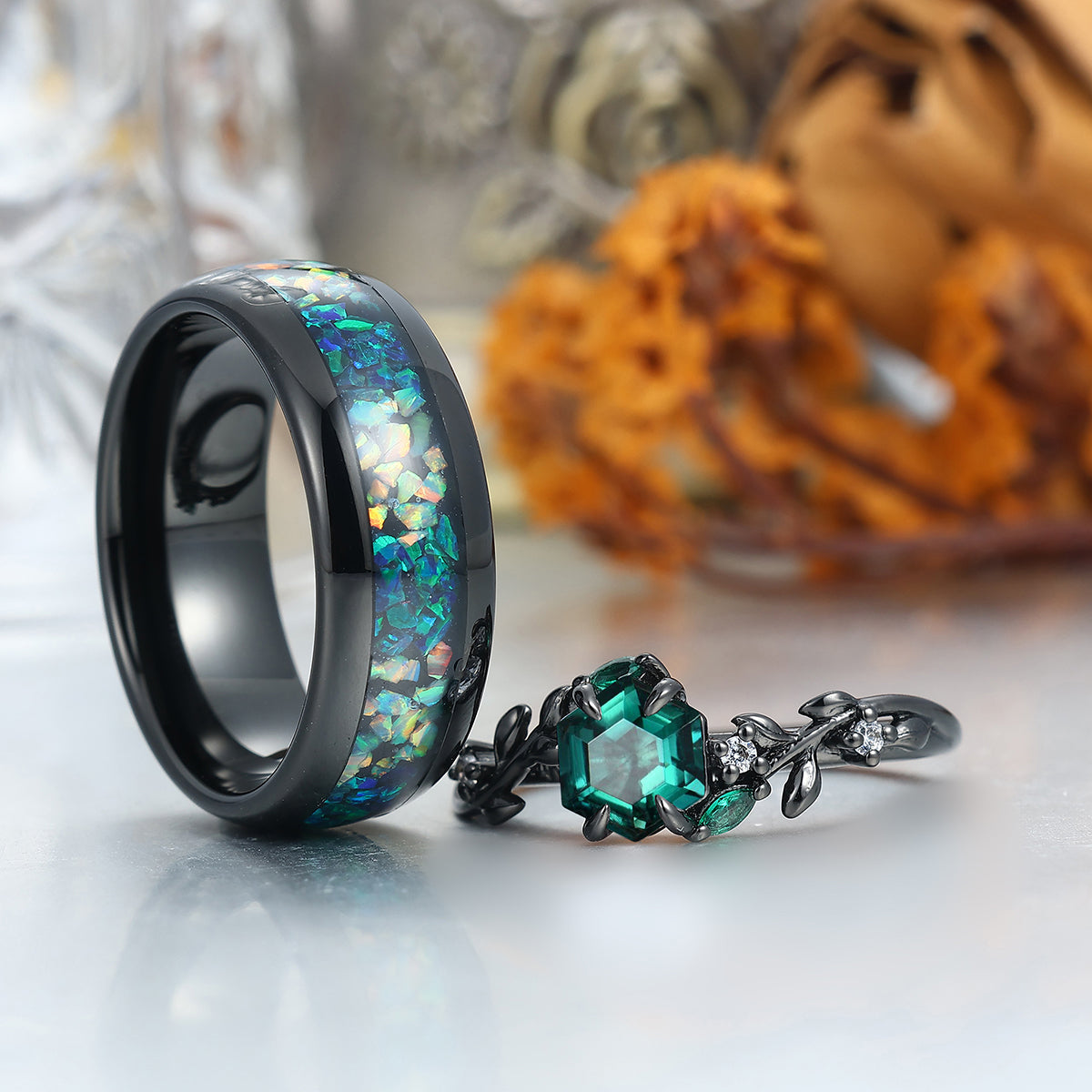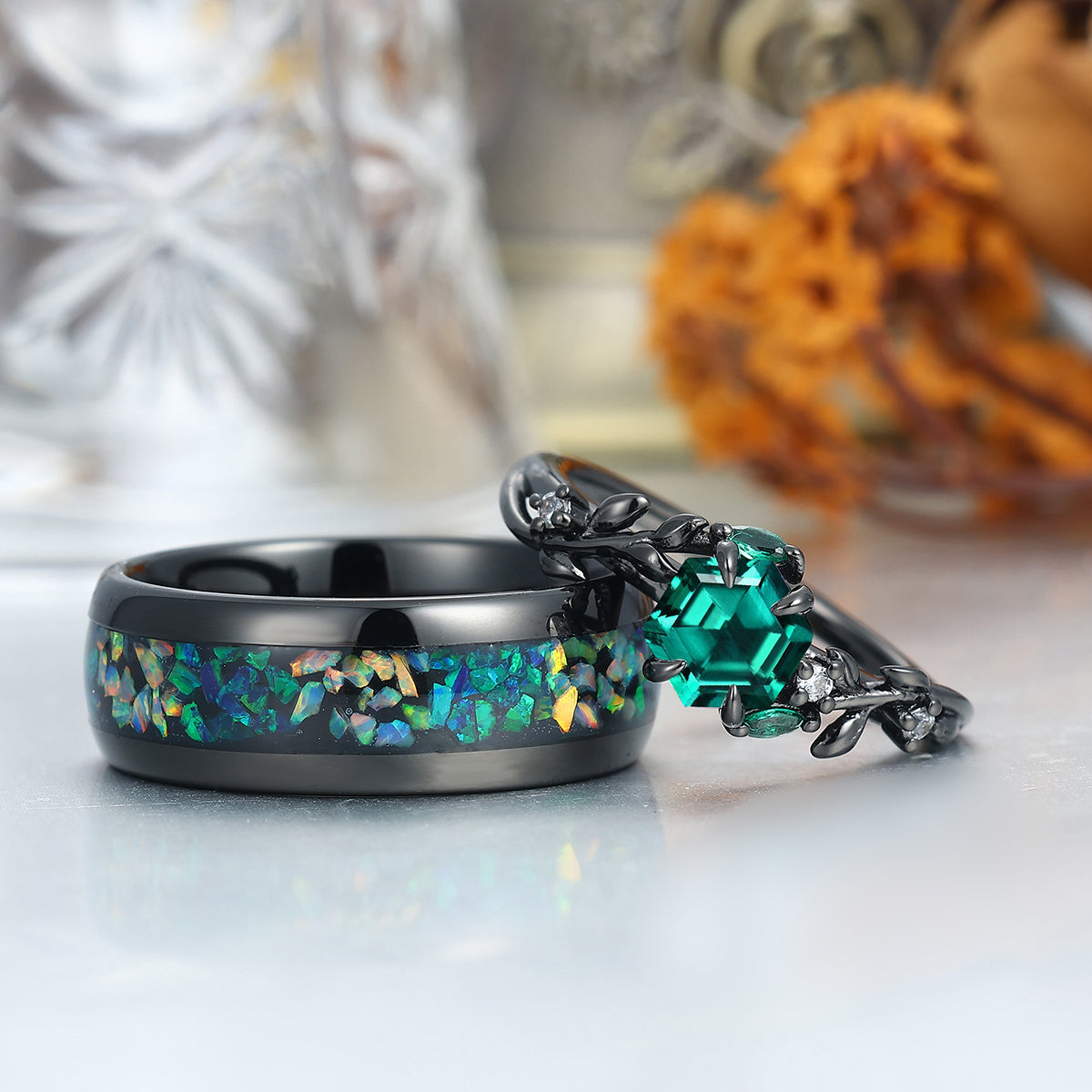 Art Deco Emerald Leaves His And Hers Wedding Band Matching Green Tungsten Couple Rings