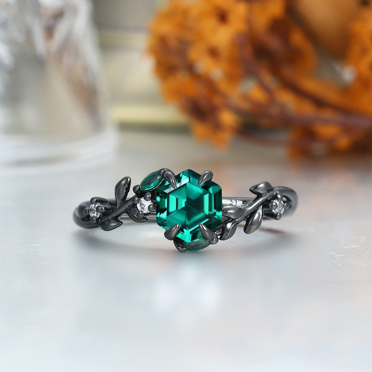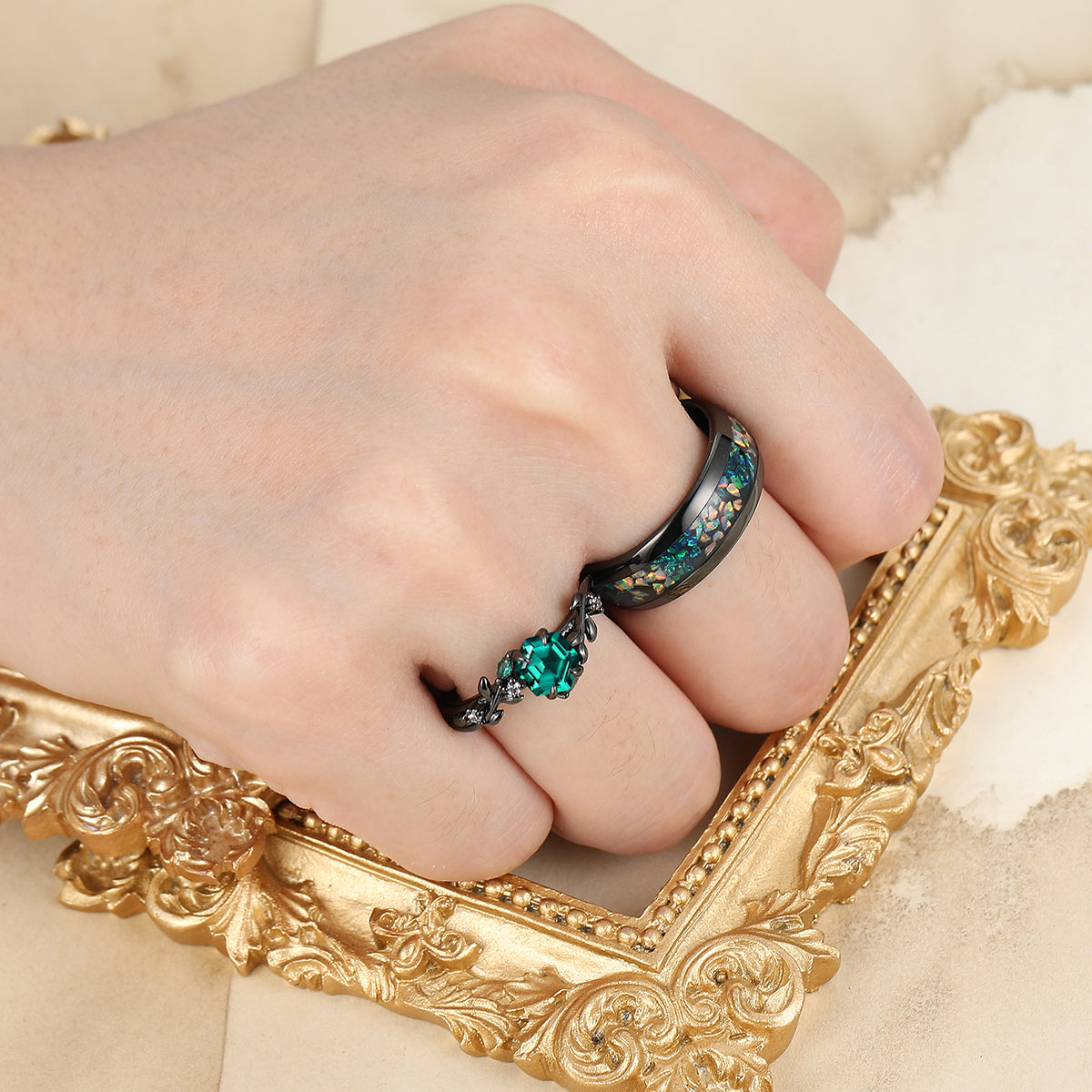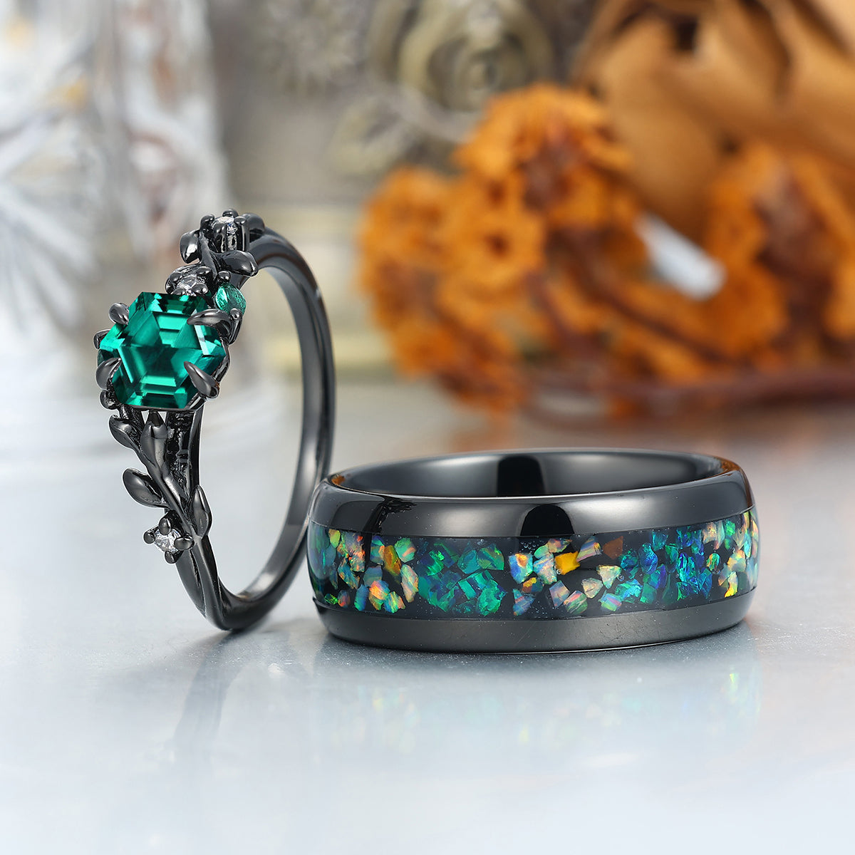 Art Deco Emerald Leaves His And Hers Wedding Band Matching Green Tungsten Couple Rings