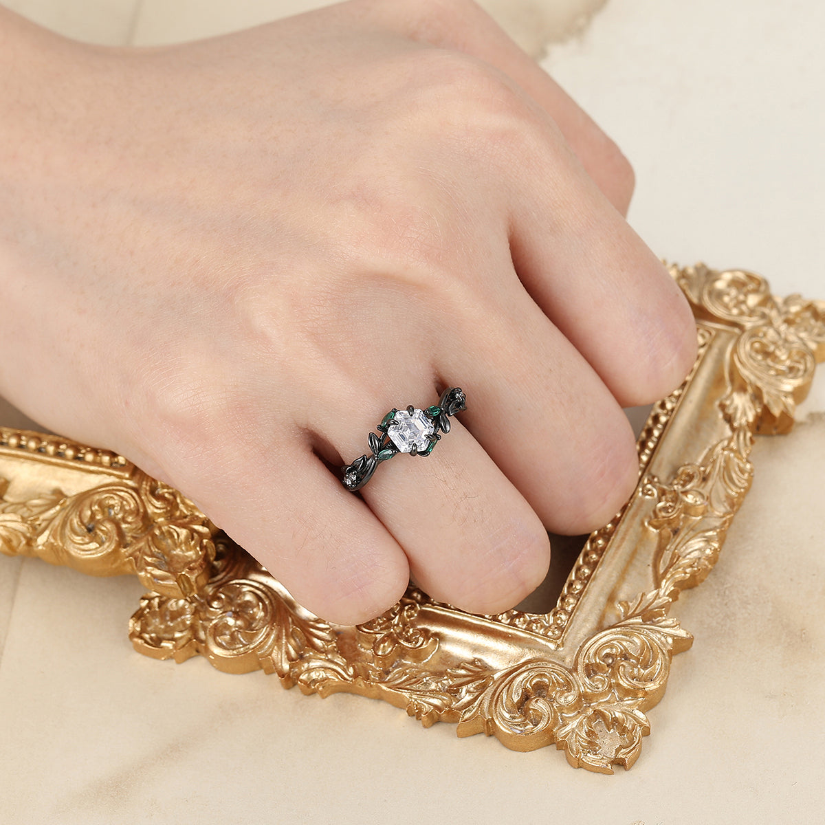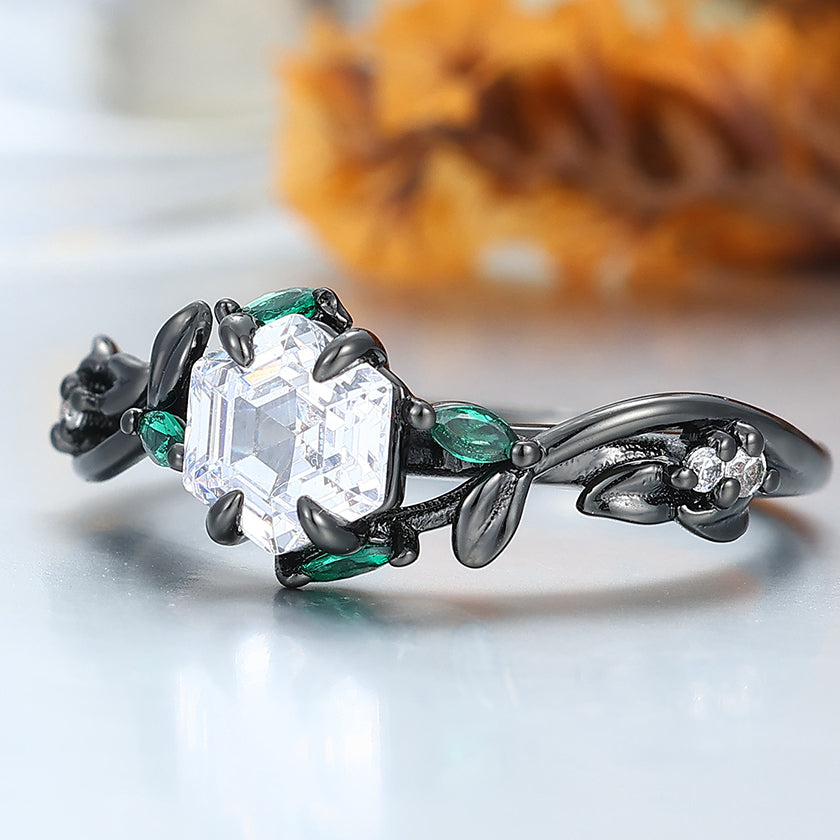 Art Deco Hexagonal Moissanite Twig Engagement Ring Emerald Accents Bridal Ring