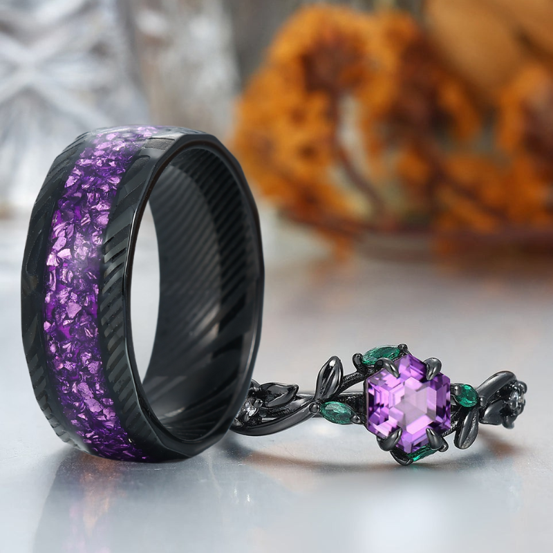 Metal Type: Hammered Damascus Steel - Natural Crushed Amethyst Inlay