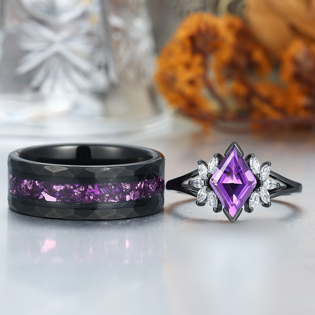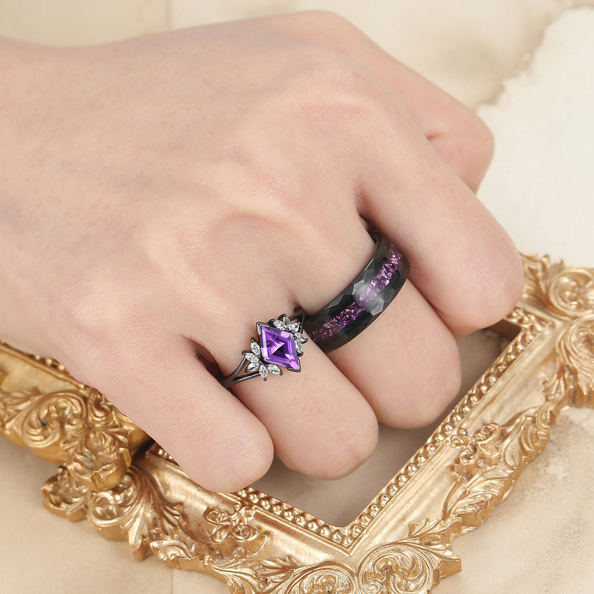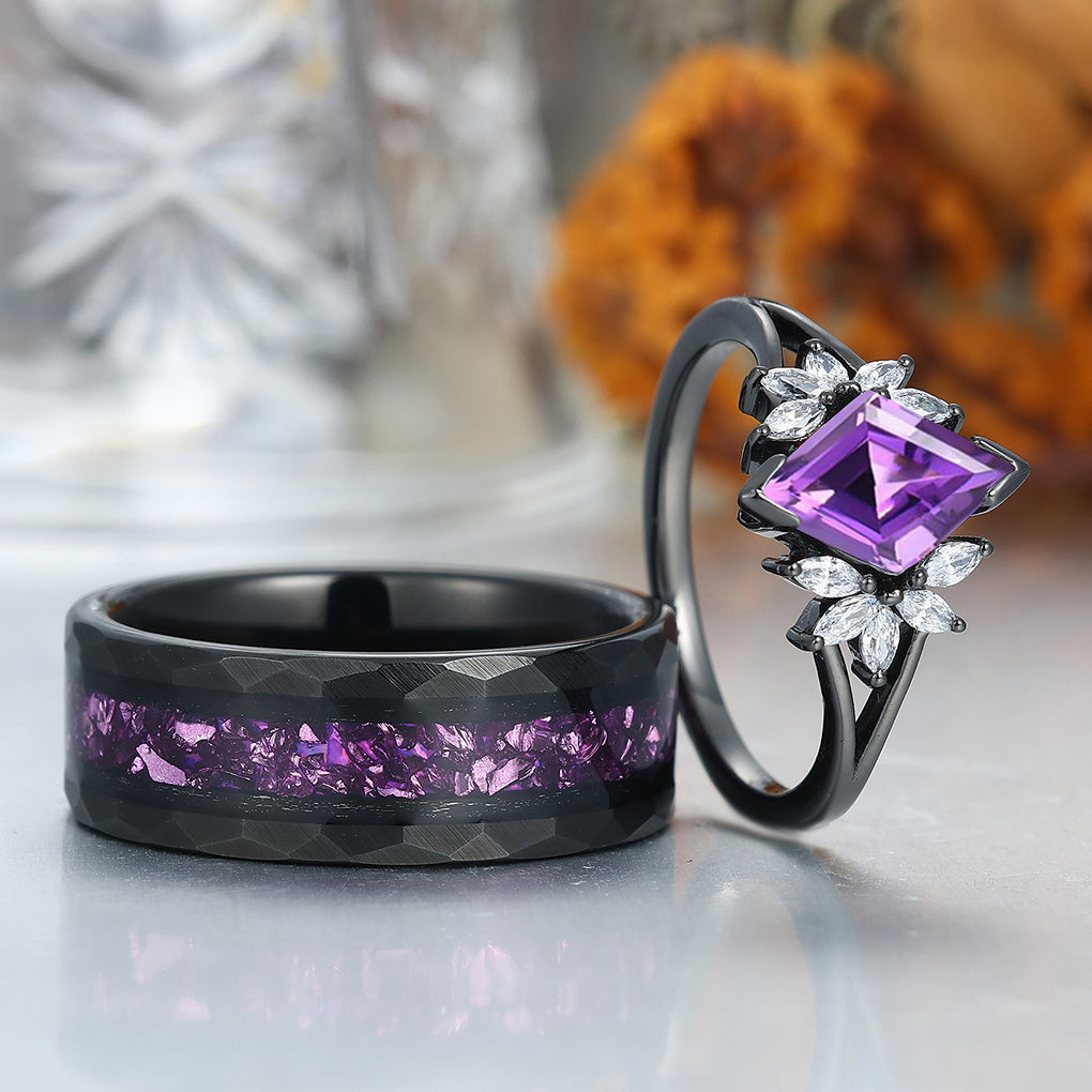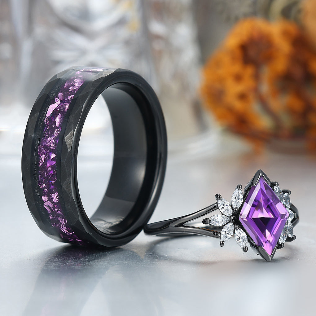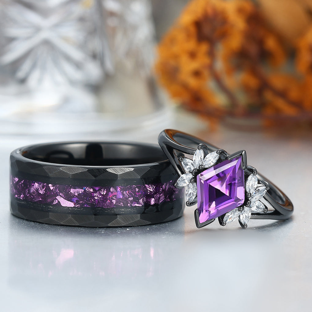 Artsy Amethyst Milgrain Ring Set For Couples Promise Blue Tungsten His and Hers Wedding Bands