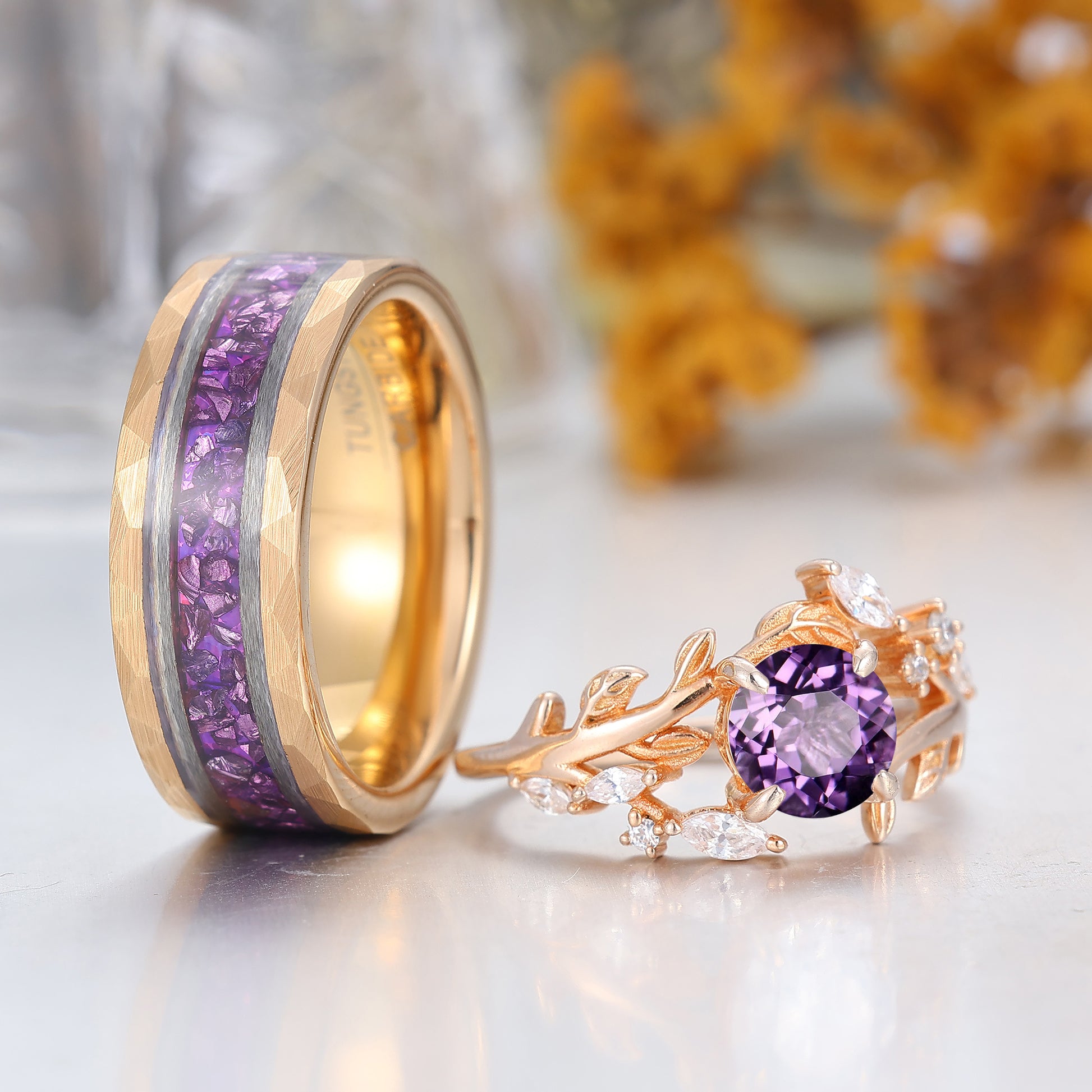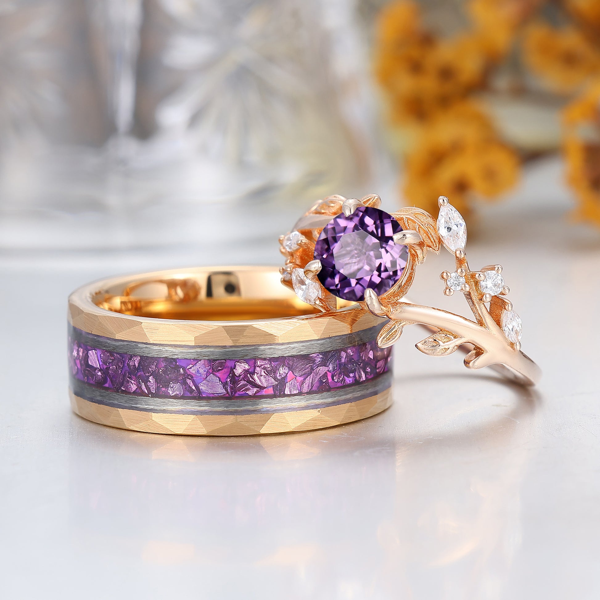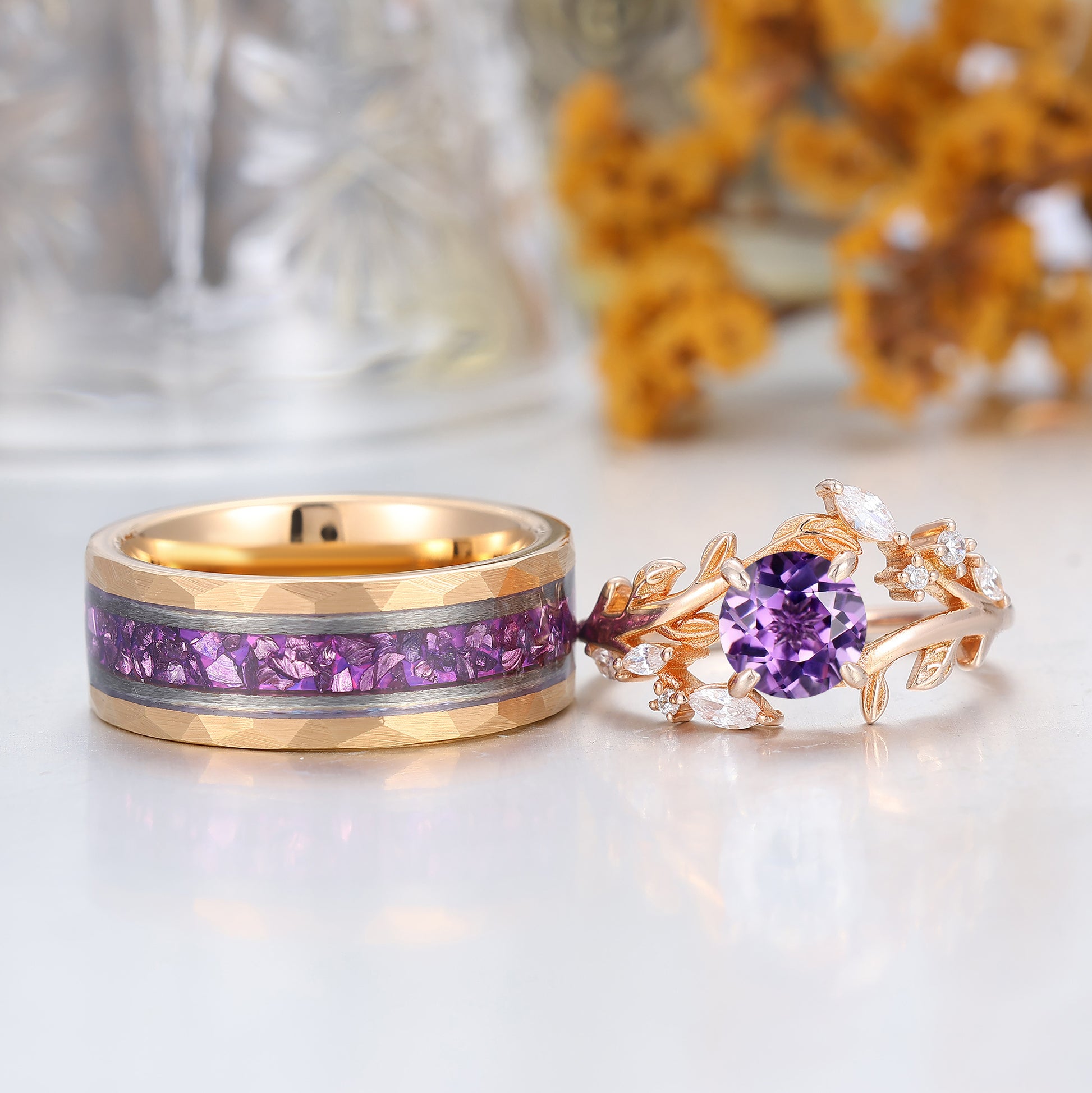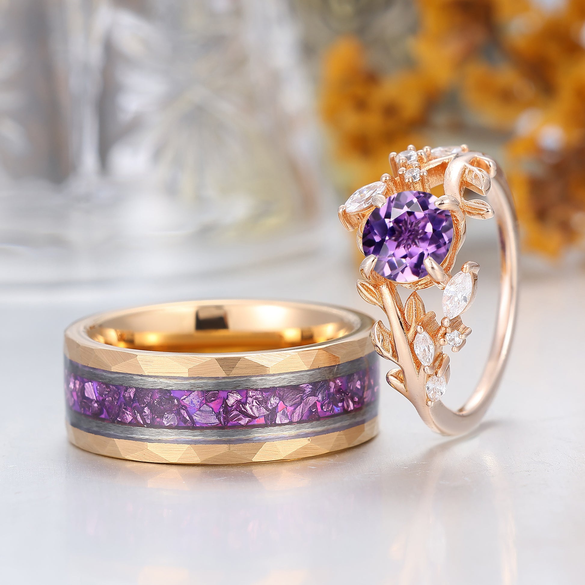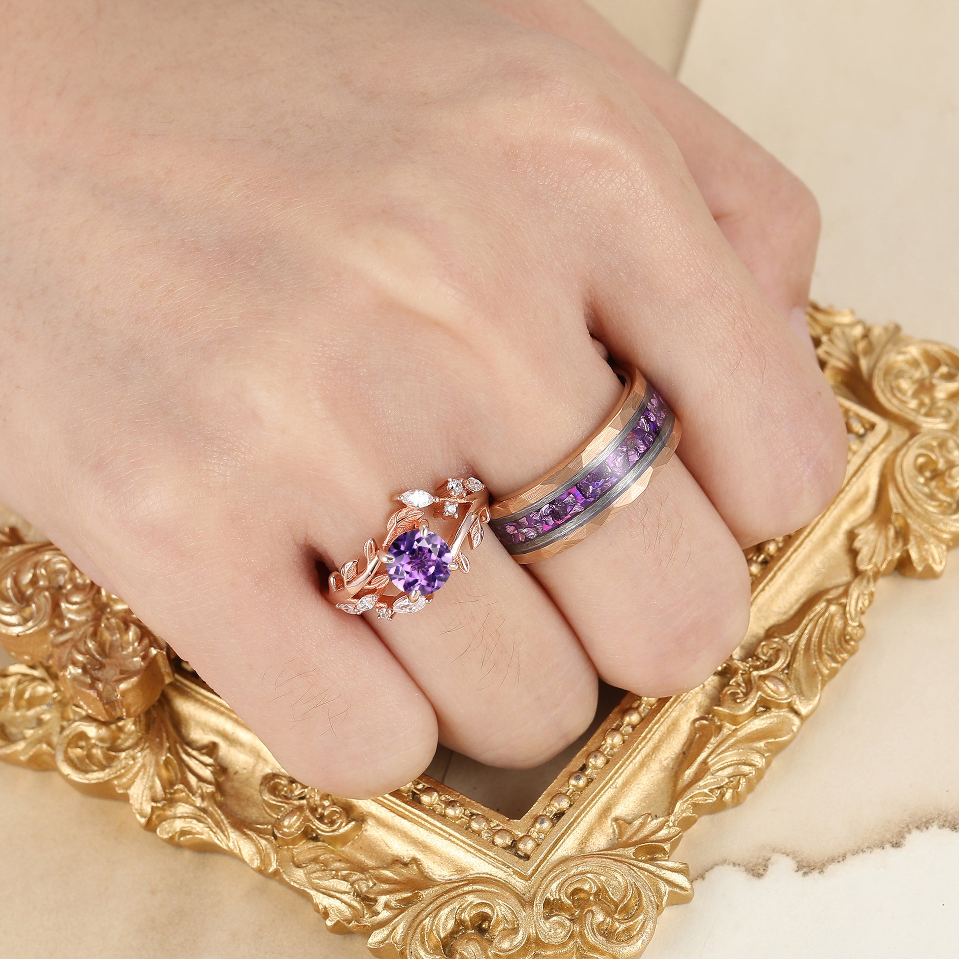 Artsy Purple Amethyst Leaf Floral Couples Ring Set Nature Inspired Matching Rings For Women And Men