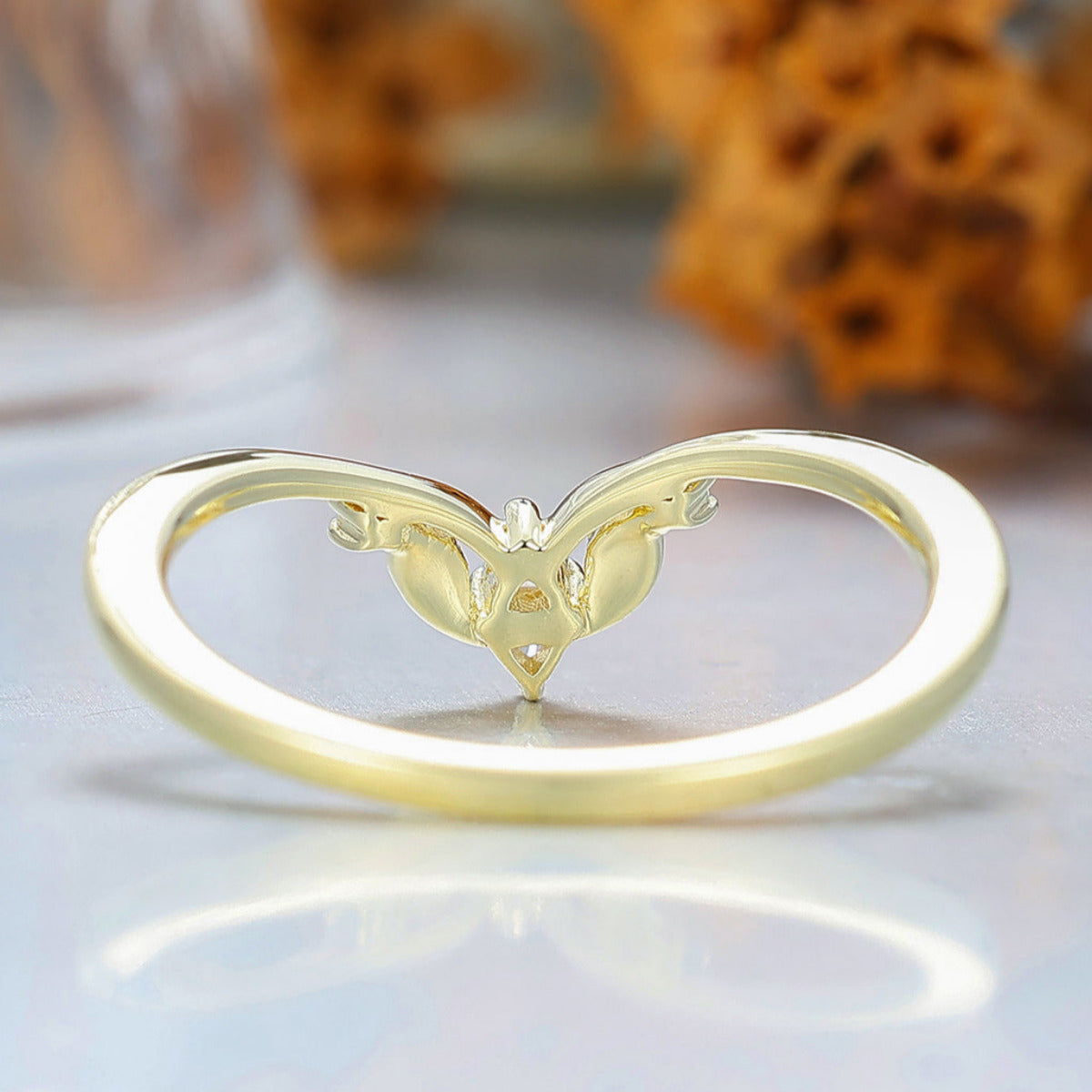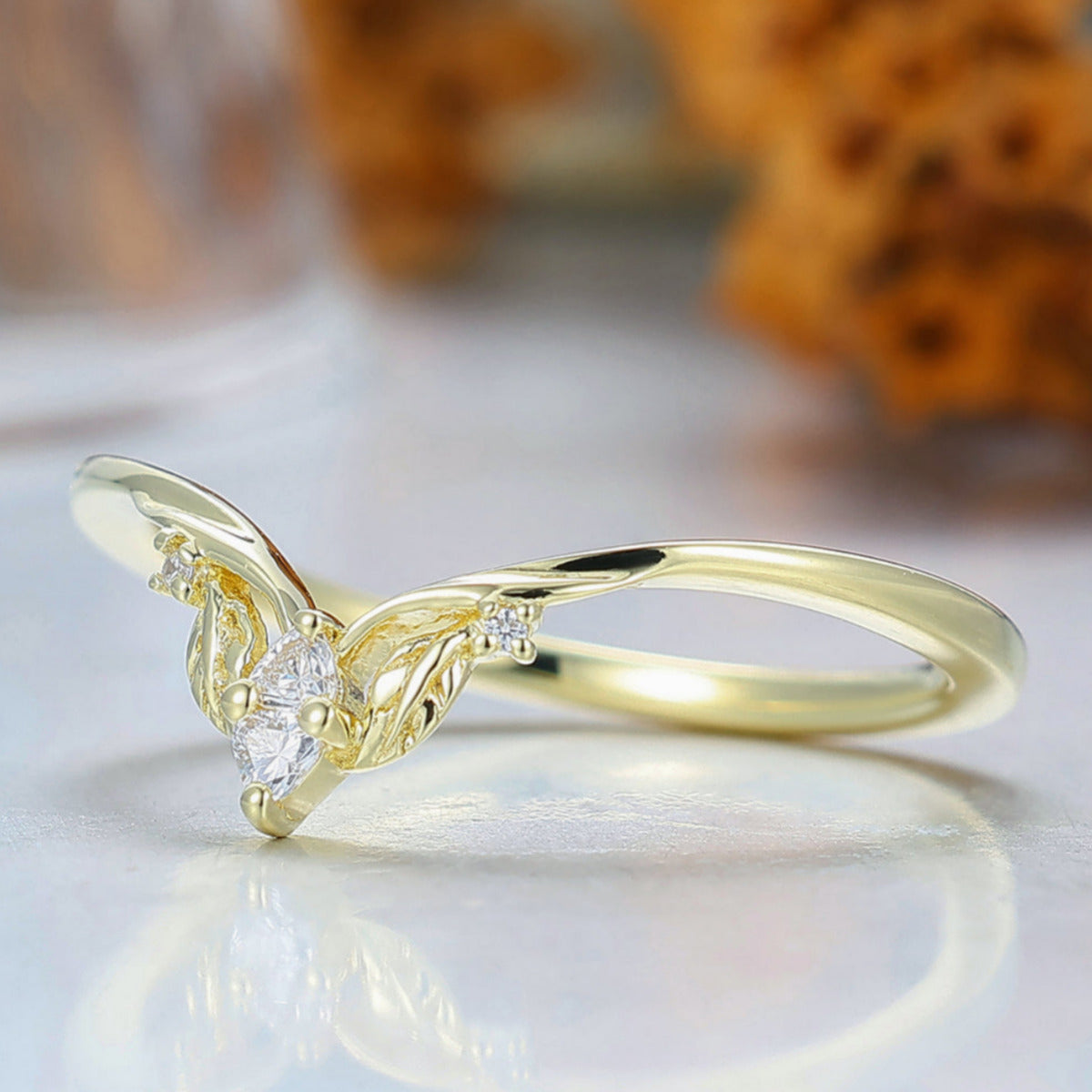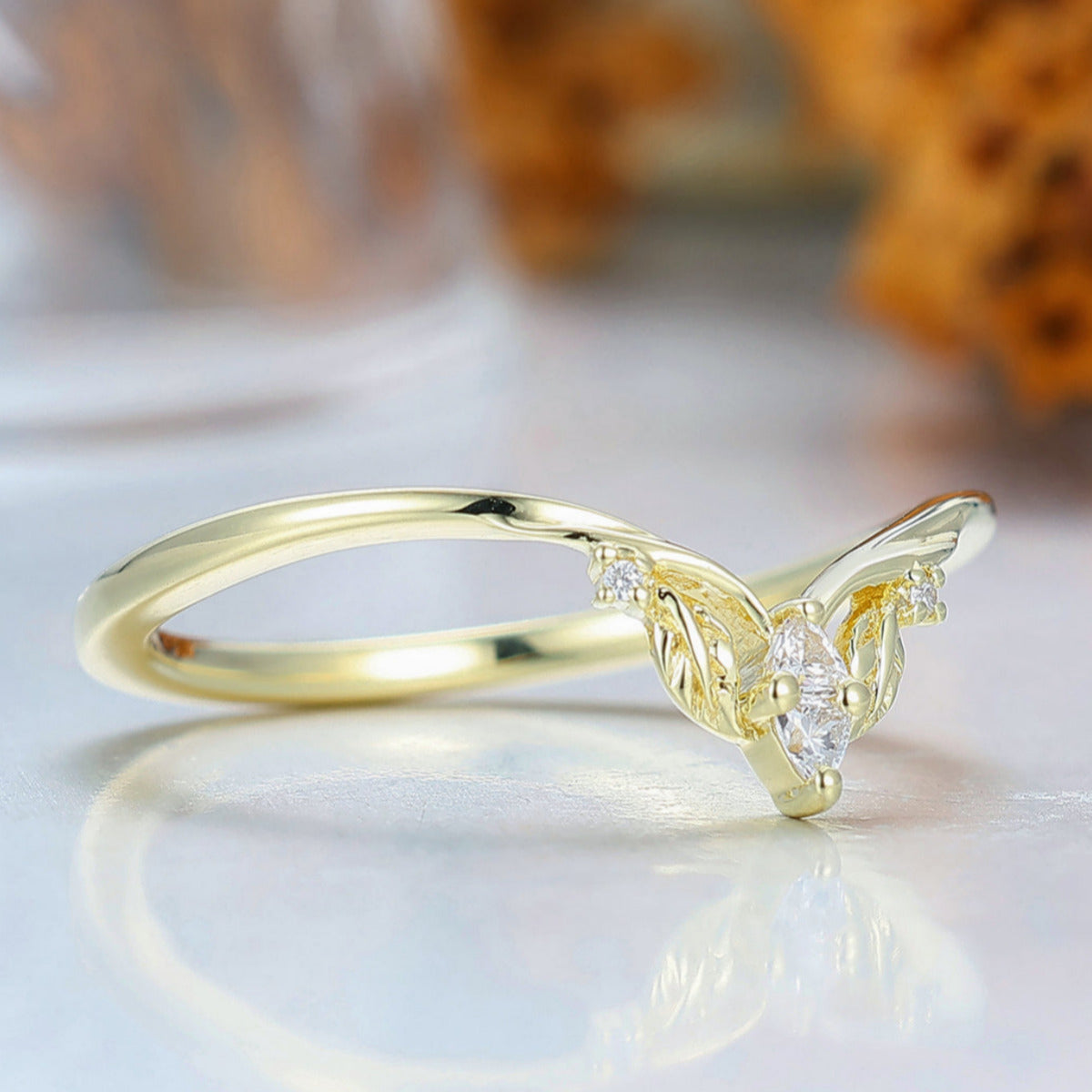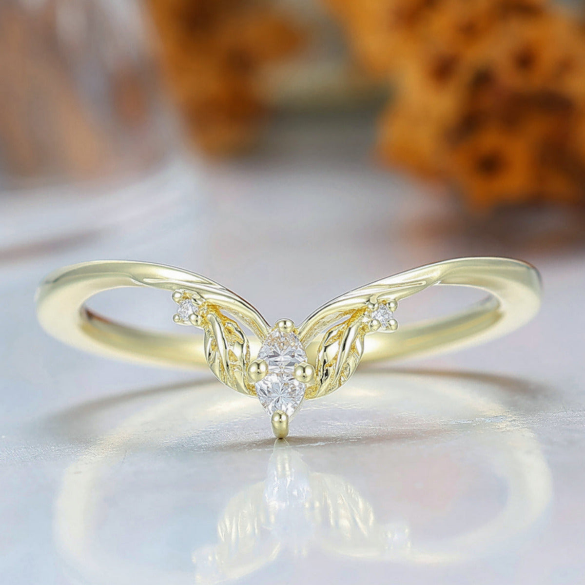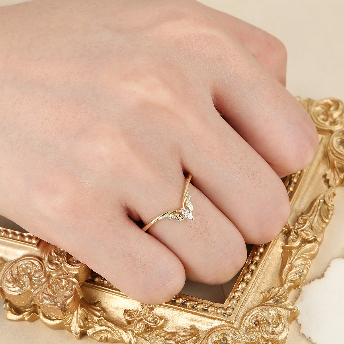 Artsy V Shape Moissanite Women Band Leaf Design Moissanite Inlay 14k Solid Gold Wedding Band
