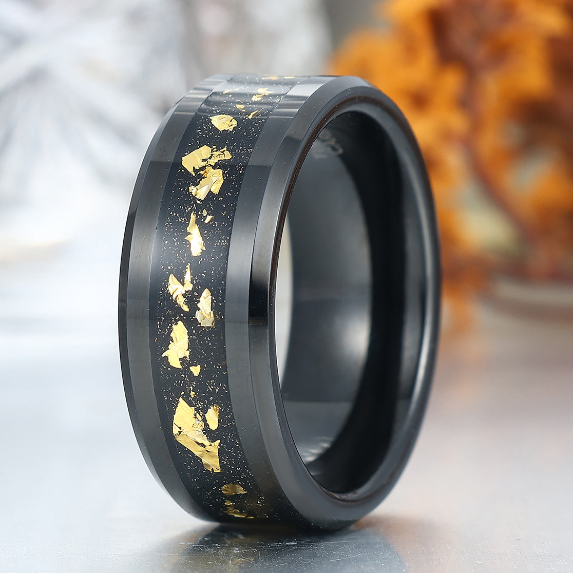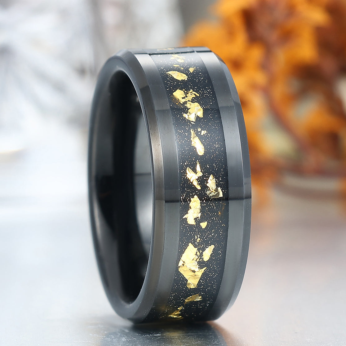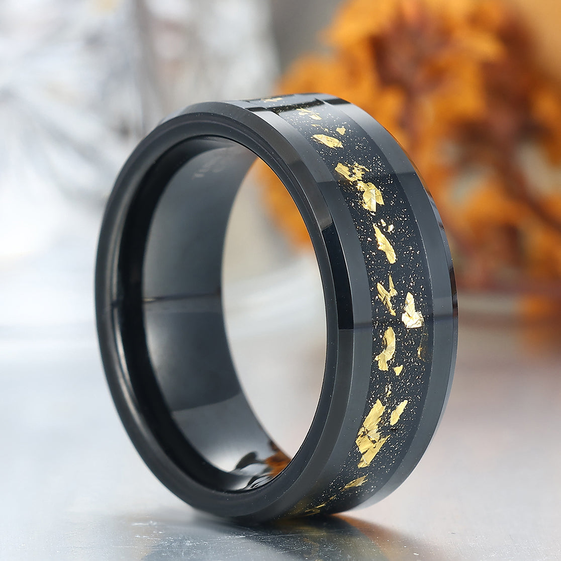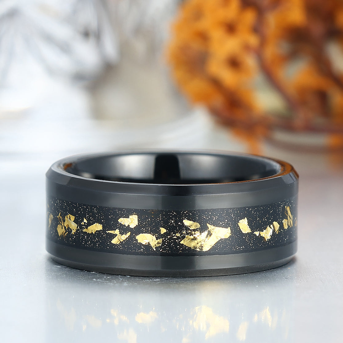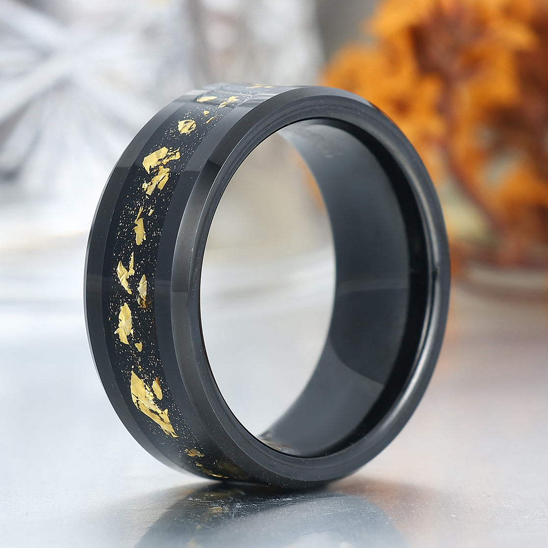Balck Beveled Edge Gold Foils Inlay Tungsten Men's Band Unisex Anniversary Ring