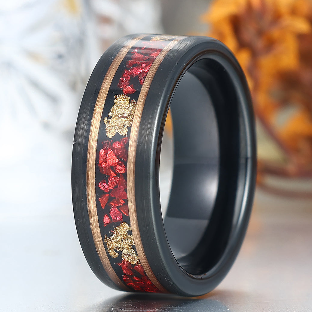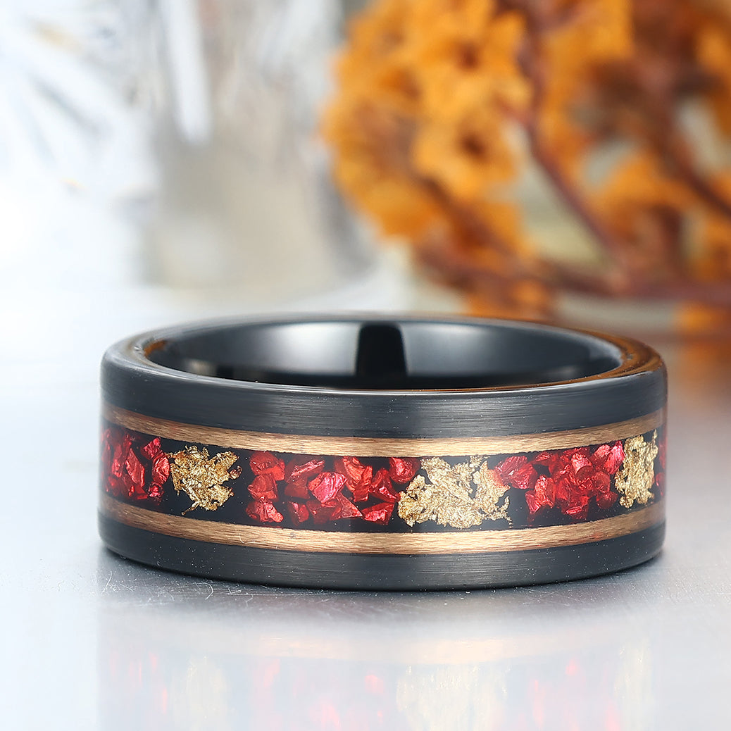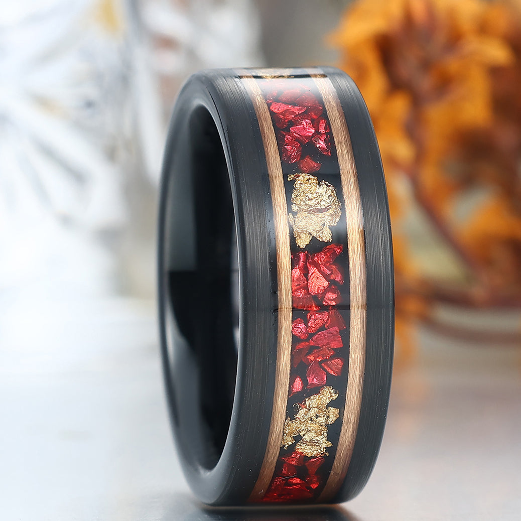 Metal Type: Tungsten Carbide - Crushed Lab Grown Ruby and Gold Foils Inlay - Hypoallergenic