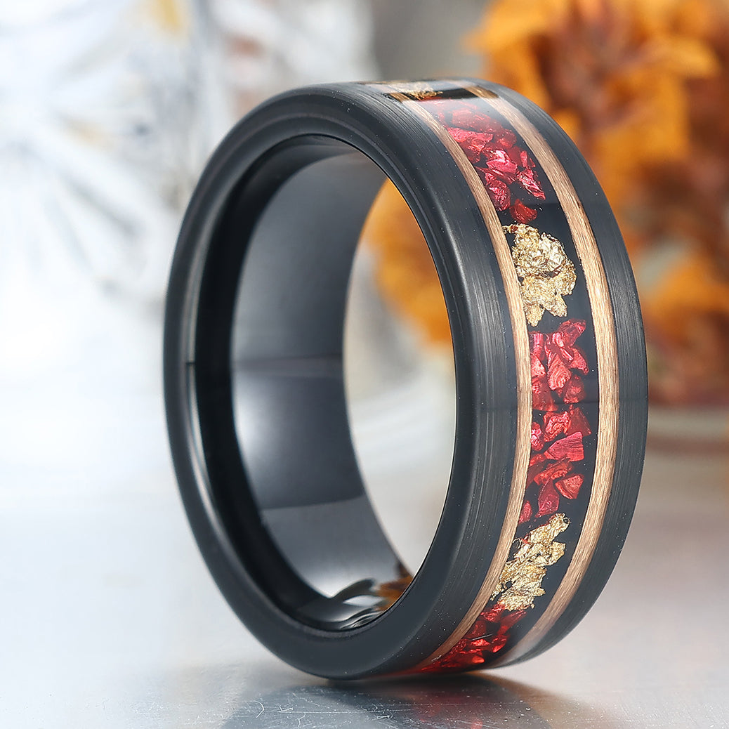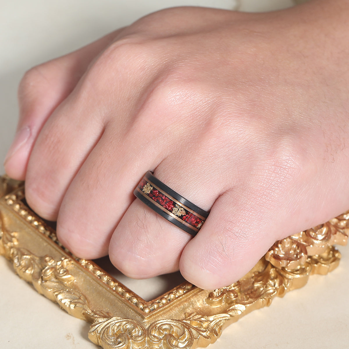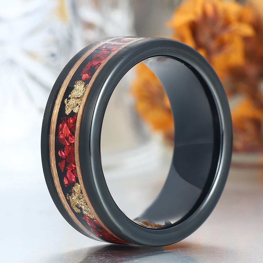 Metal Type: Tungsten Carbide - Crushed Lab Grown Ruby and Gold Foils Inlay - Hypoallergenic