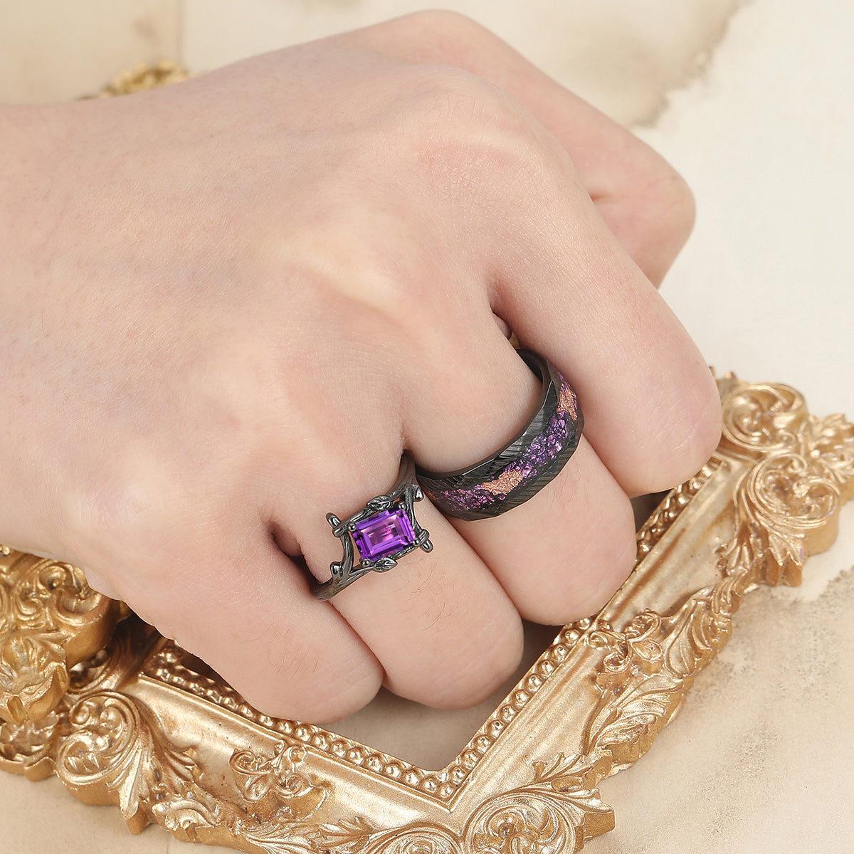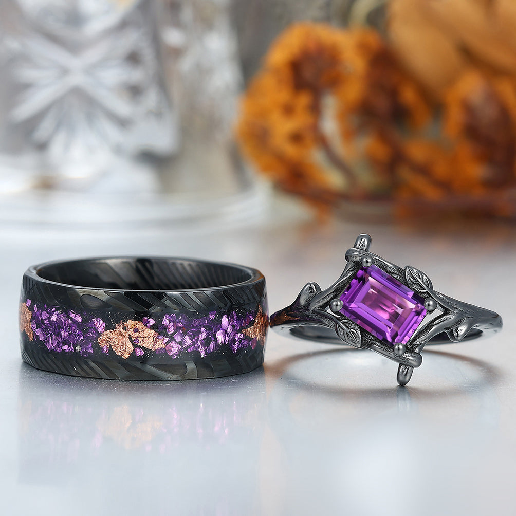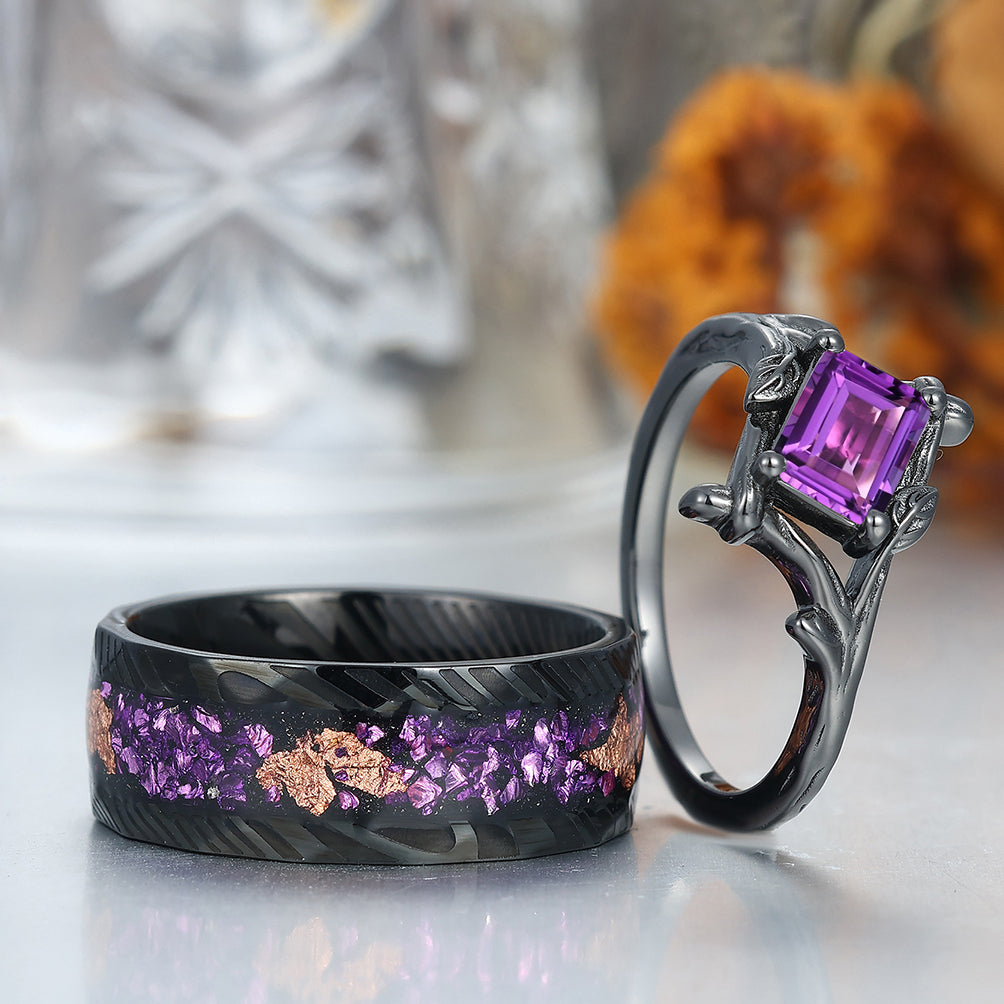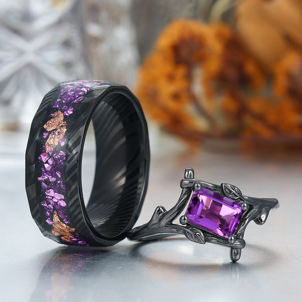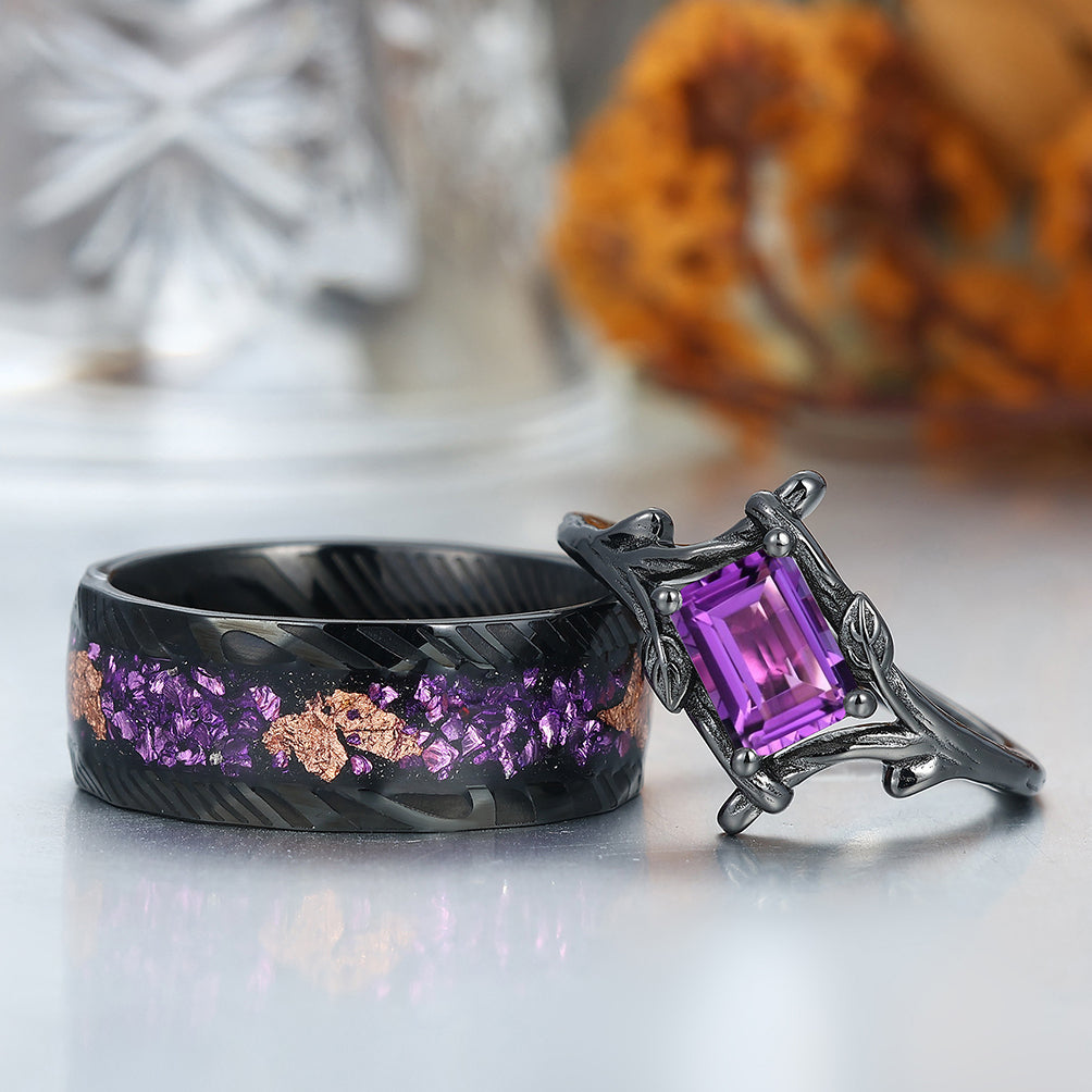 Branch Inspired Amethyst Embracing Engagement Couple Rings Purple His and Hers Ring Set