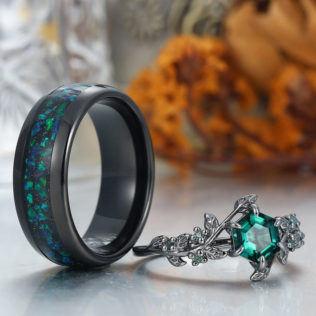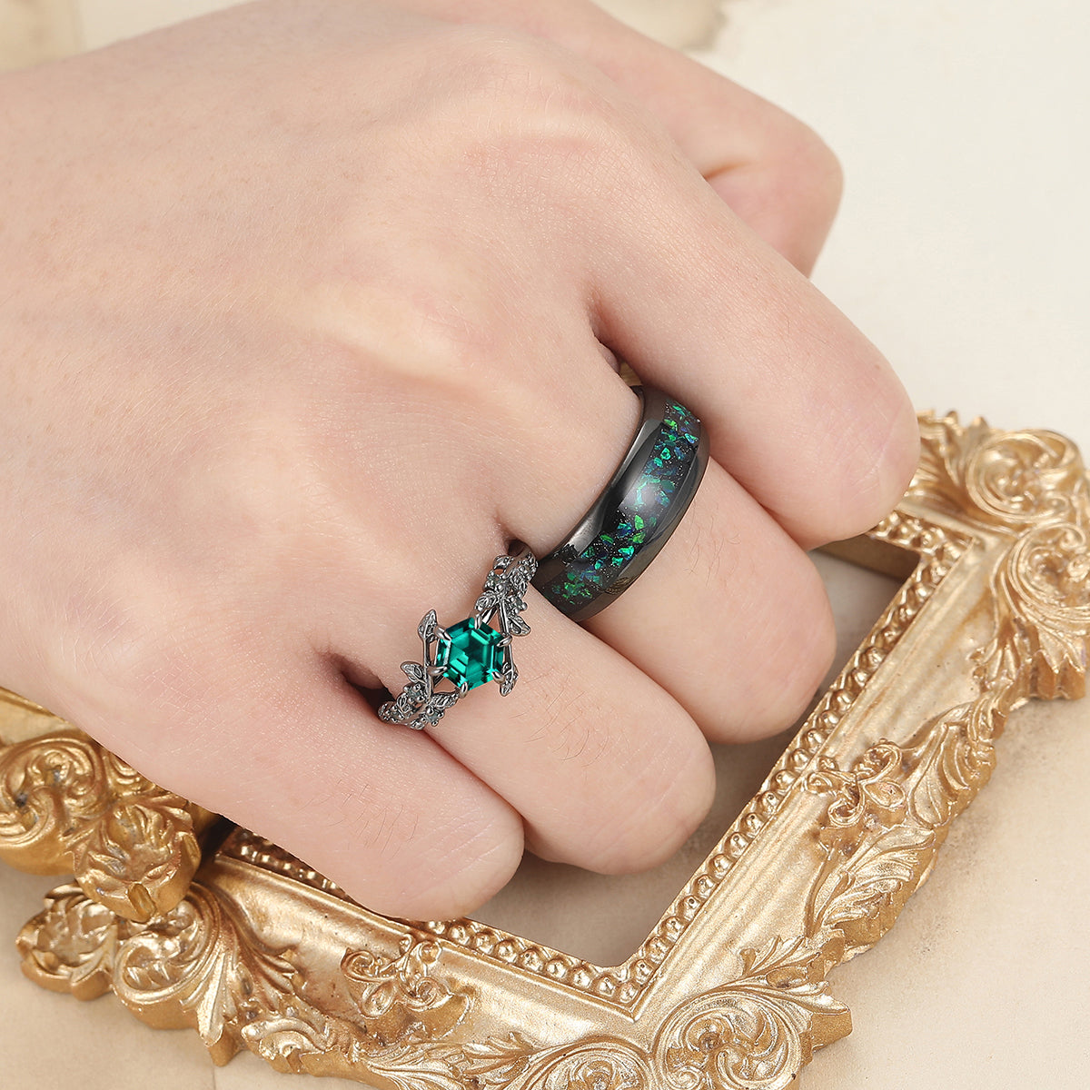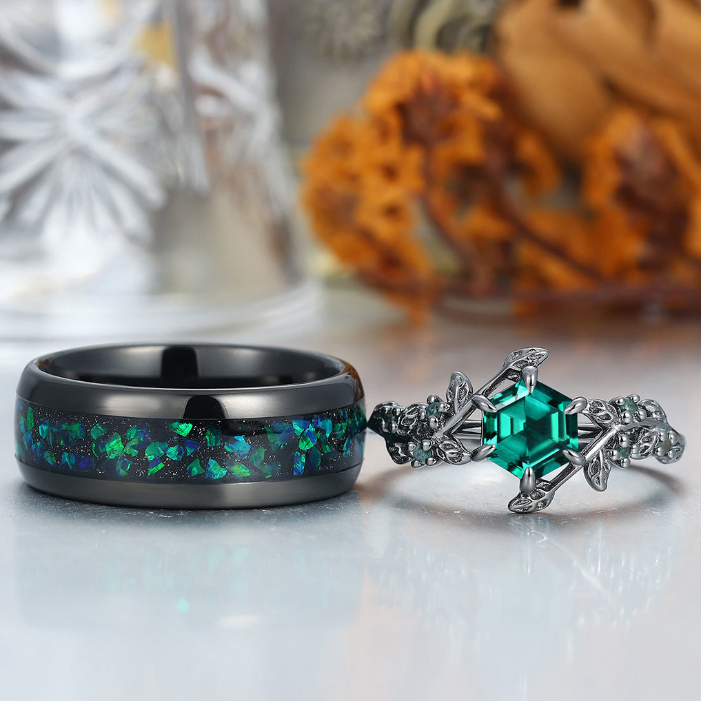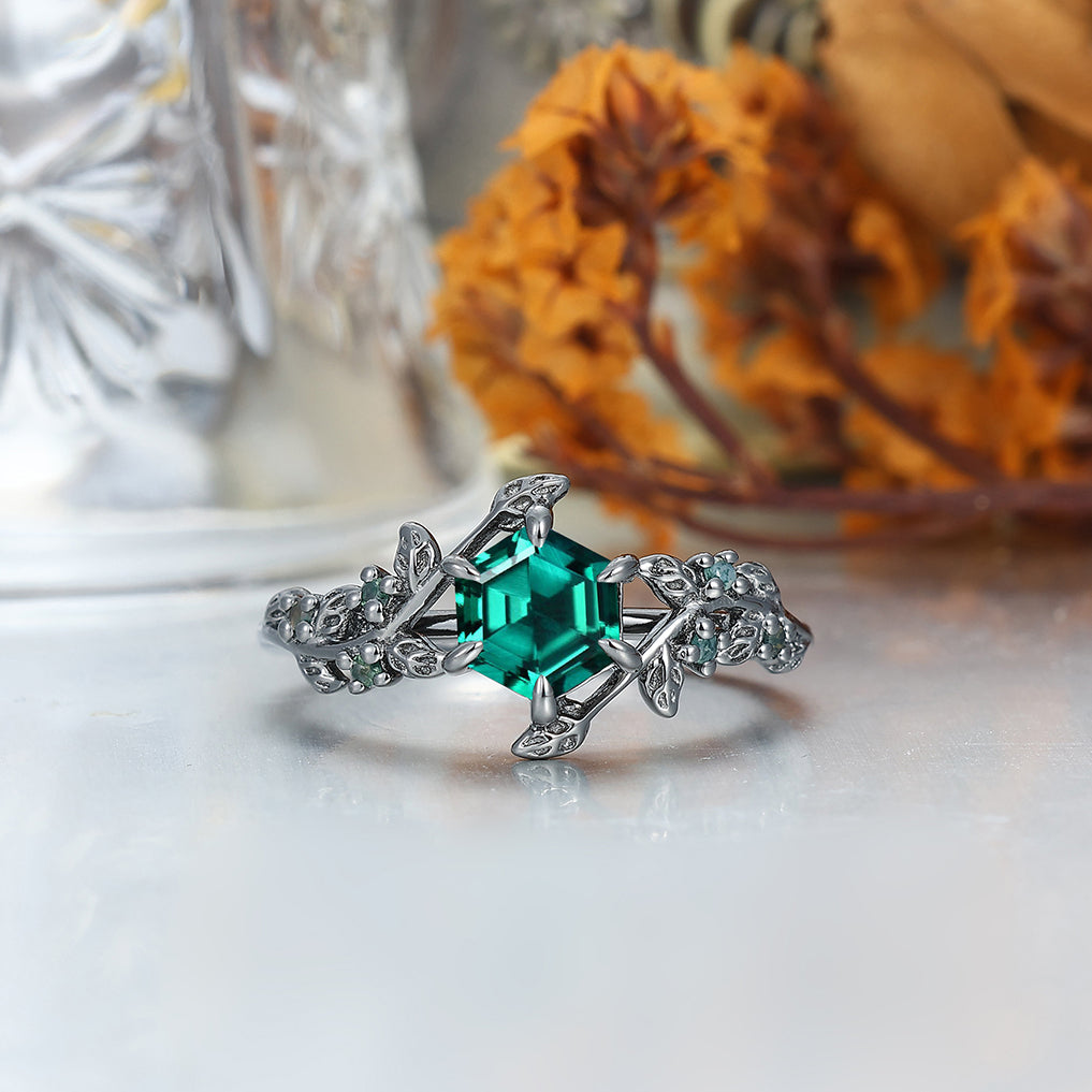 Brilliant Hexagon Cut Emerald Engagement Leaf Ring Set S925 And Tungsten Matching Ring