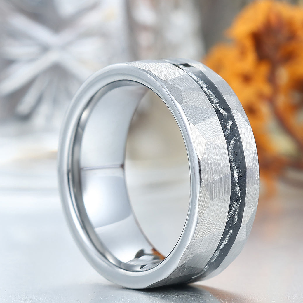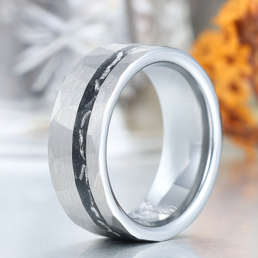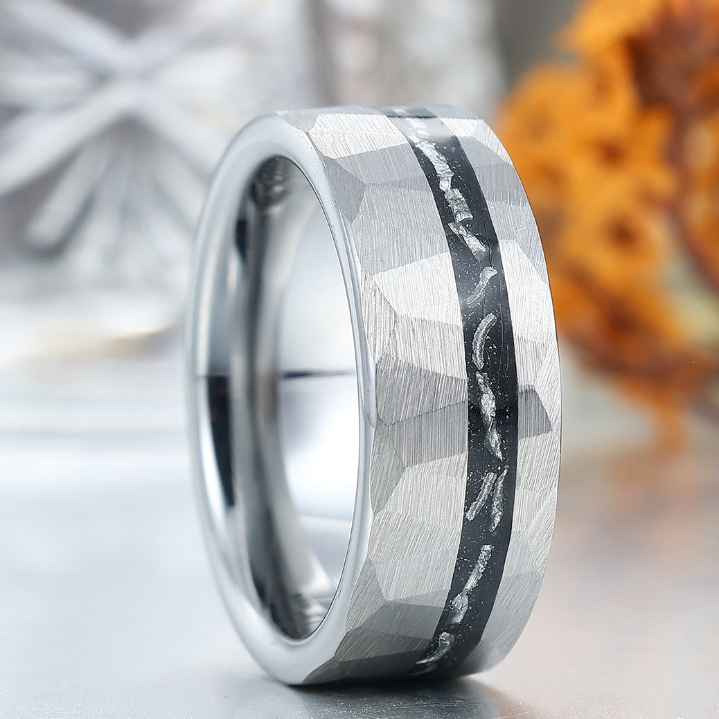 Crushed Meteorite Men's Wedding Band Silver Hammered Tungsten Promise Unisex Ring
