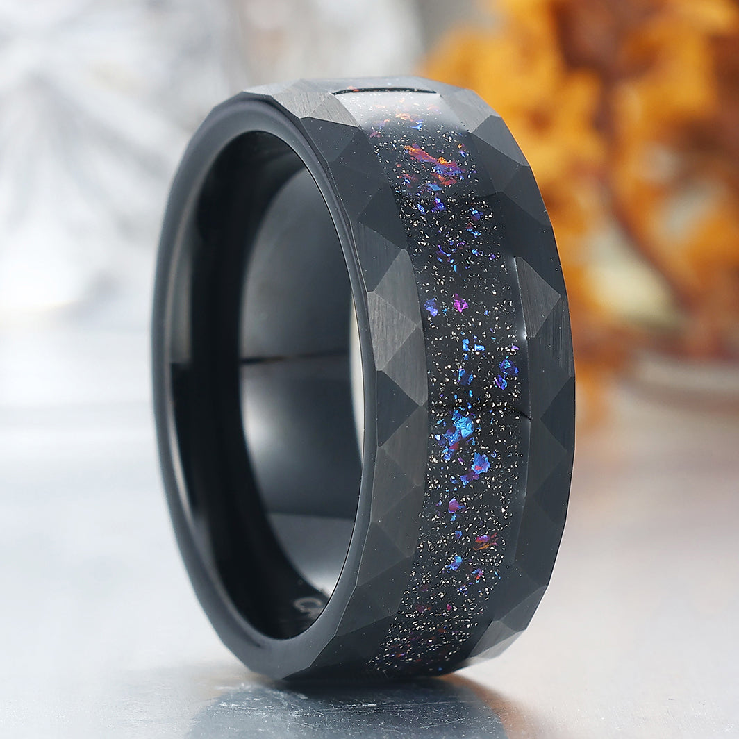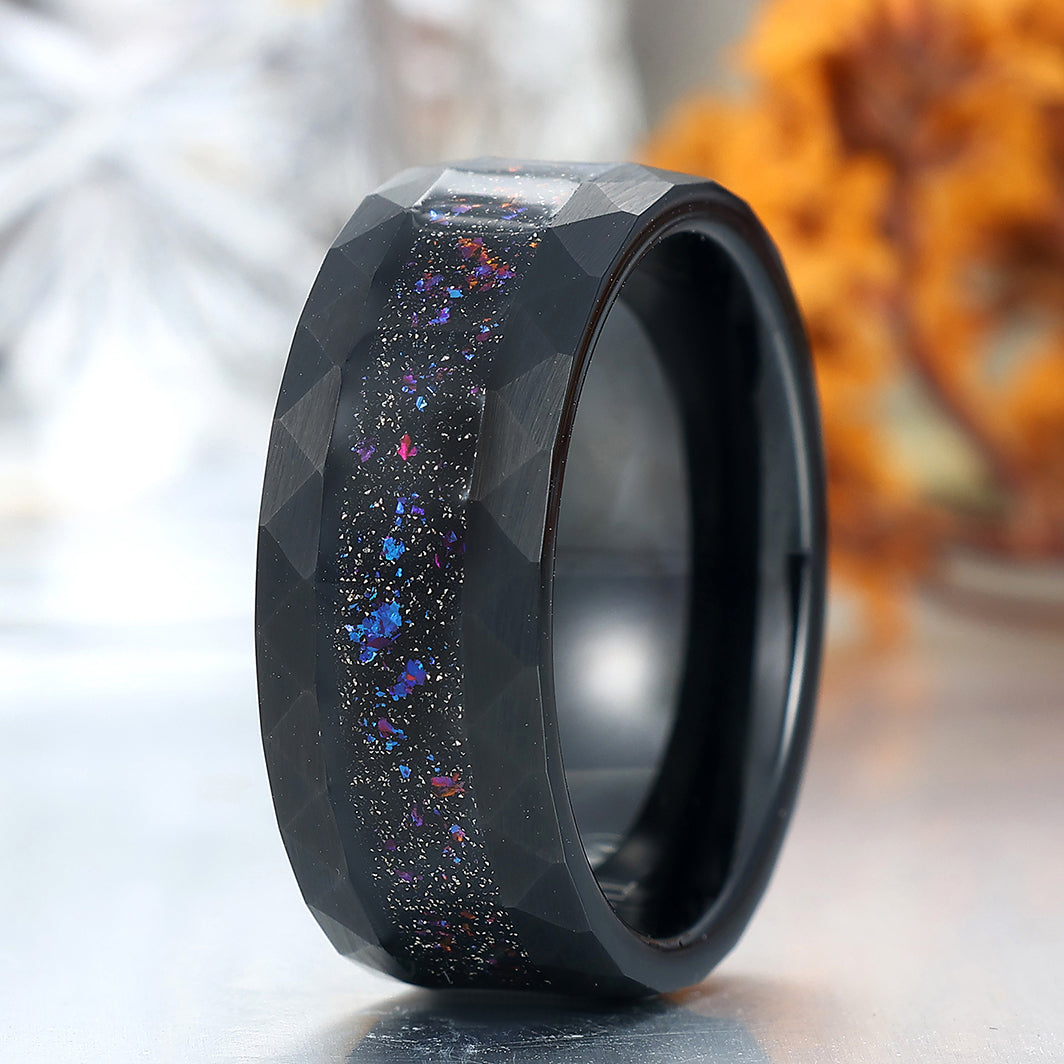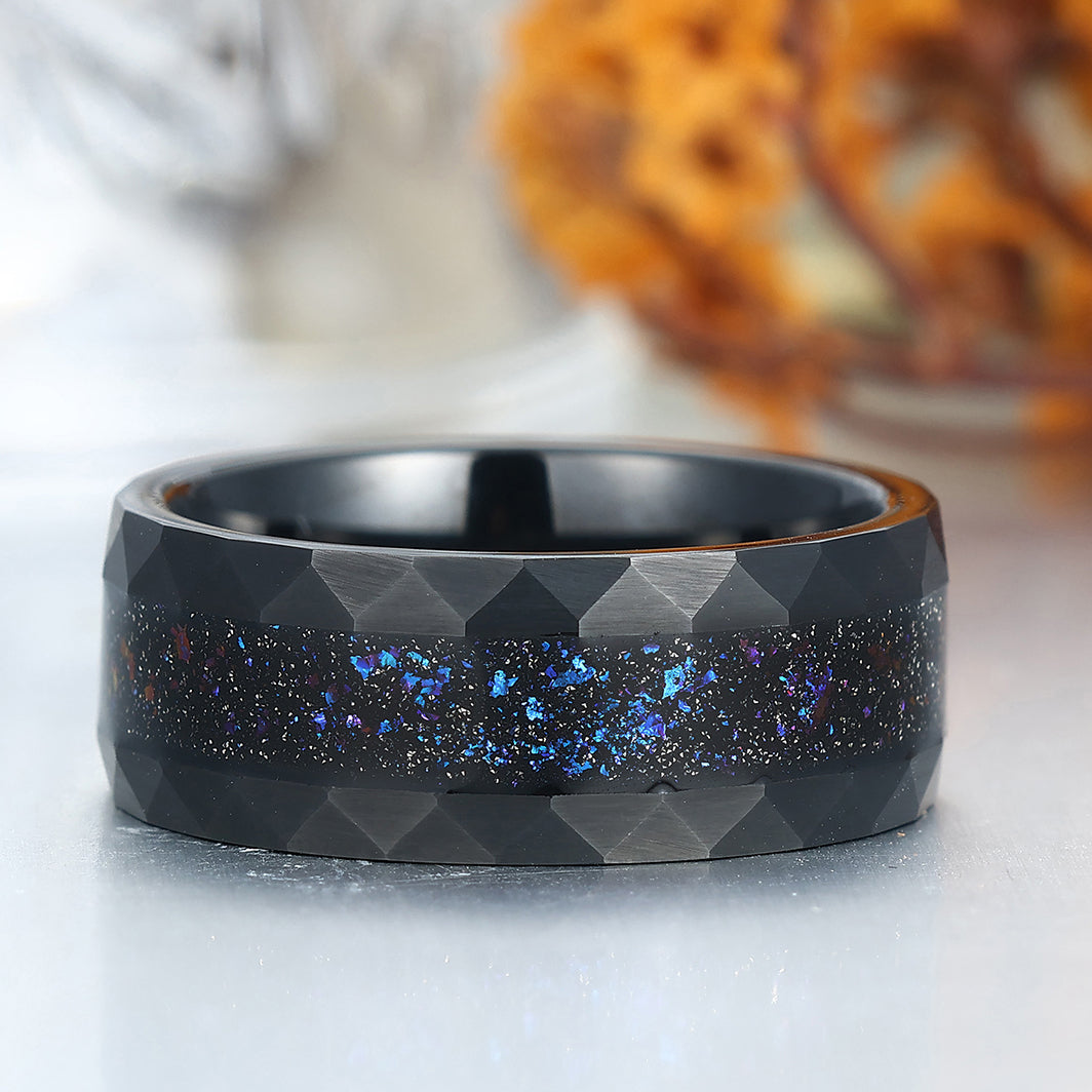 Crushed Meteorites and Blue Opal Tungsten Band 8mm Balck Plated Men's Anniversary Ring