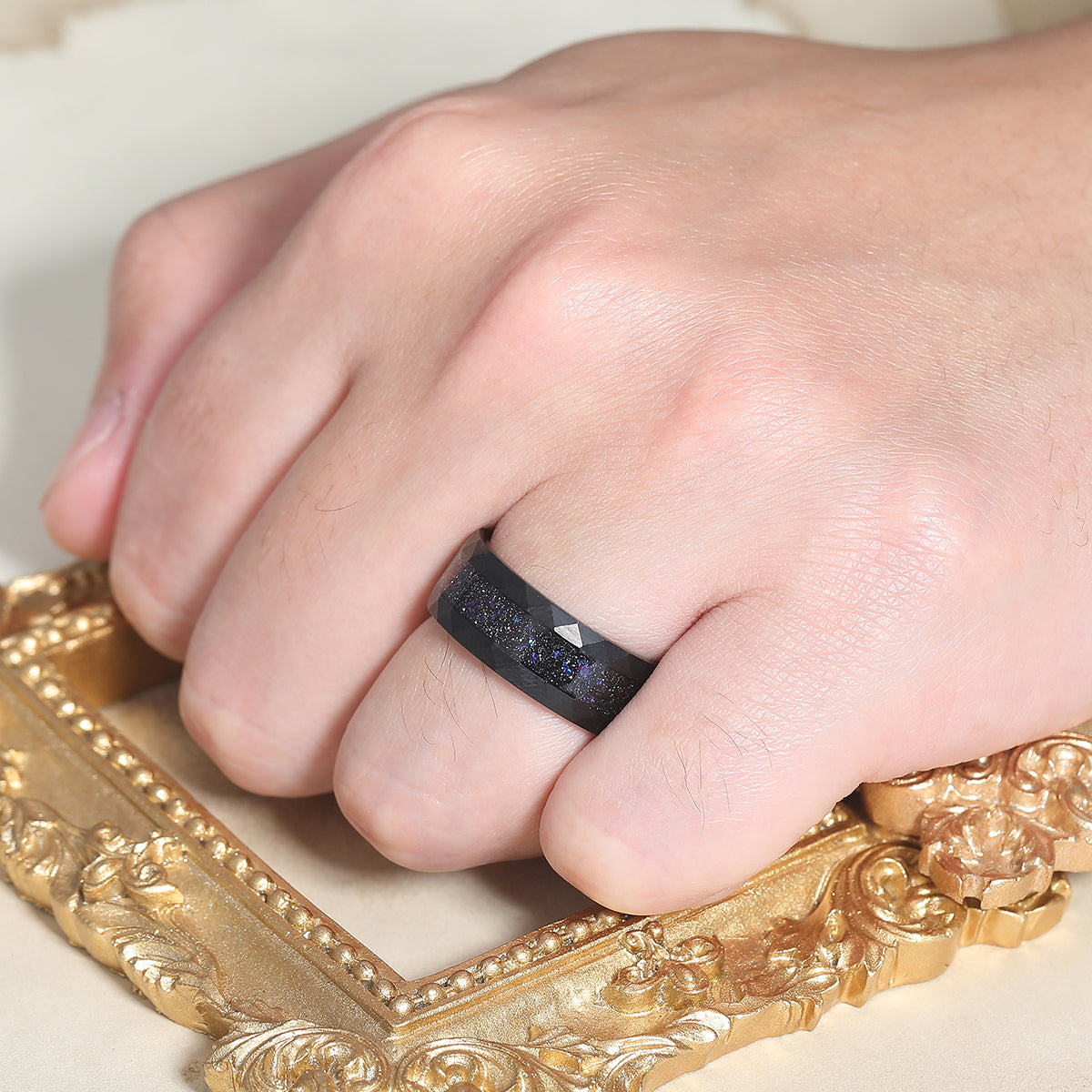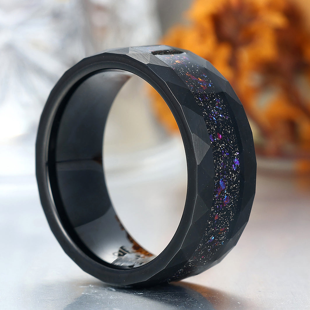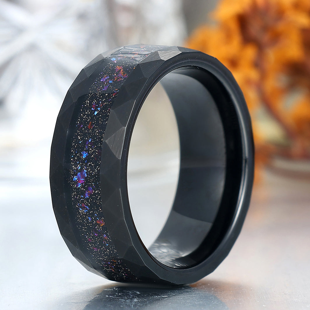 Crushed Meteorites and Blue Opal Tungsten Band 8mm Balck Plated Men's Anniversary Ring