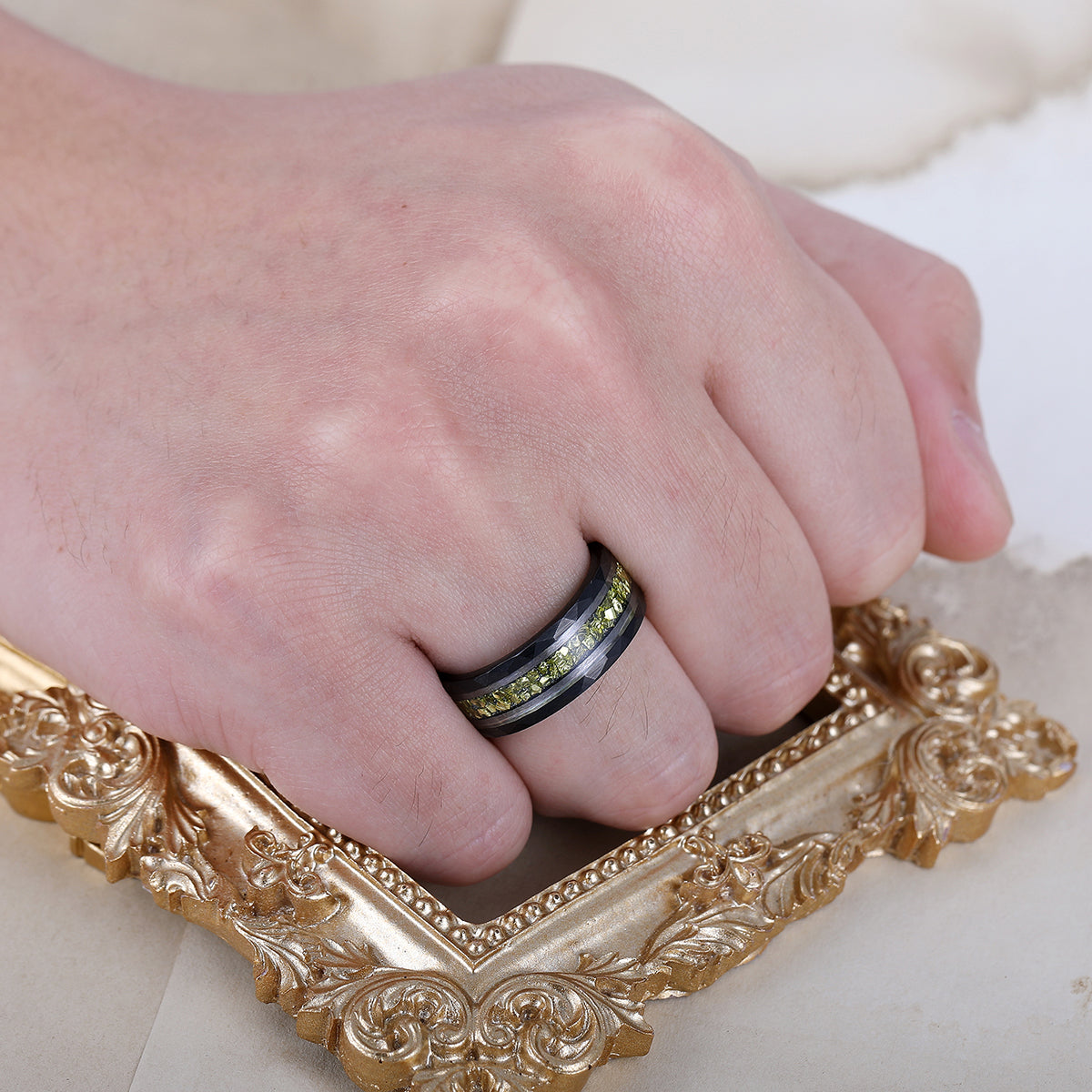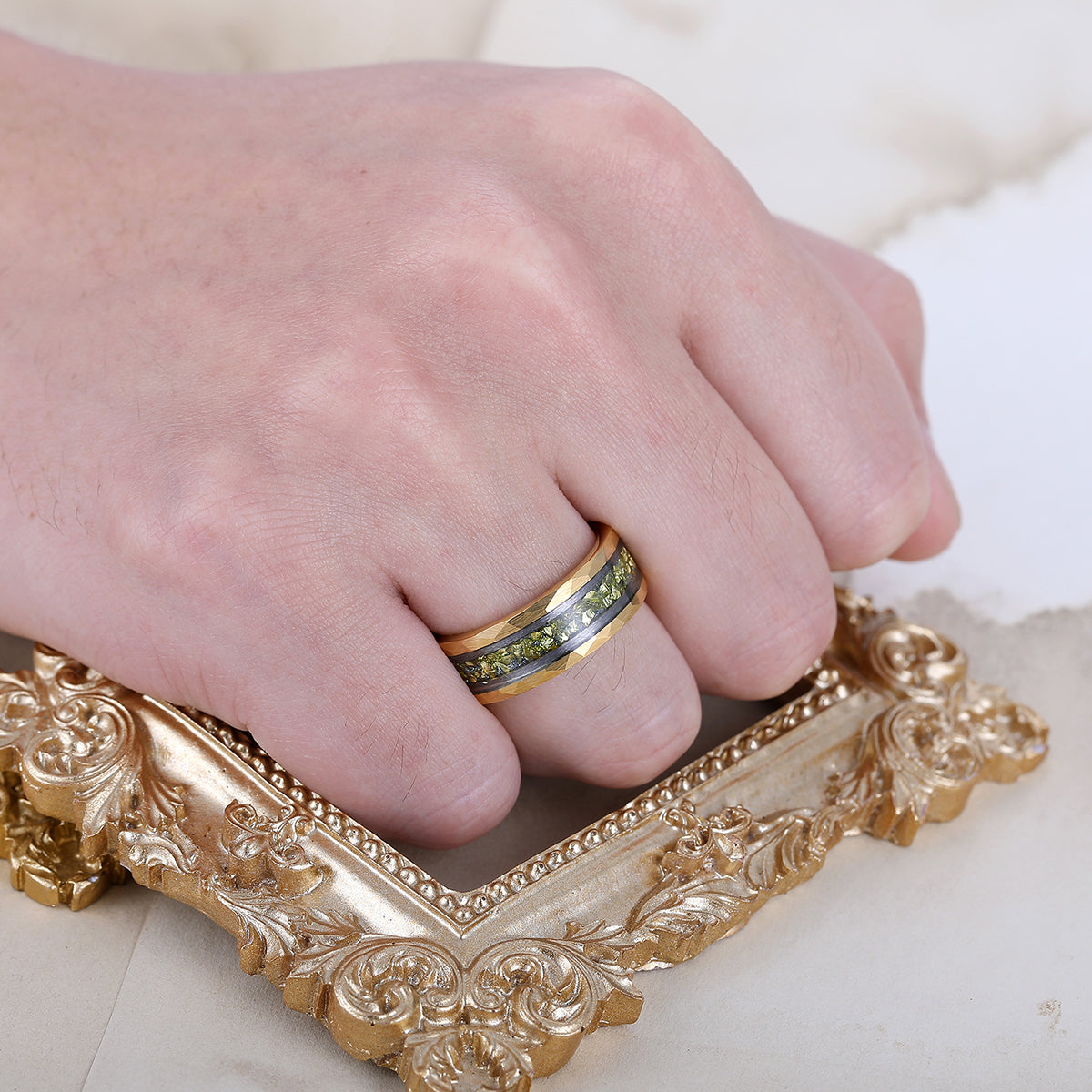 Crushed Peridot Wedding Band Yellow Green Mens Tungsten Ring Promise Statement Ring