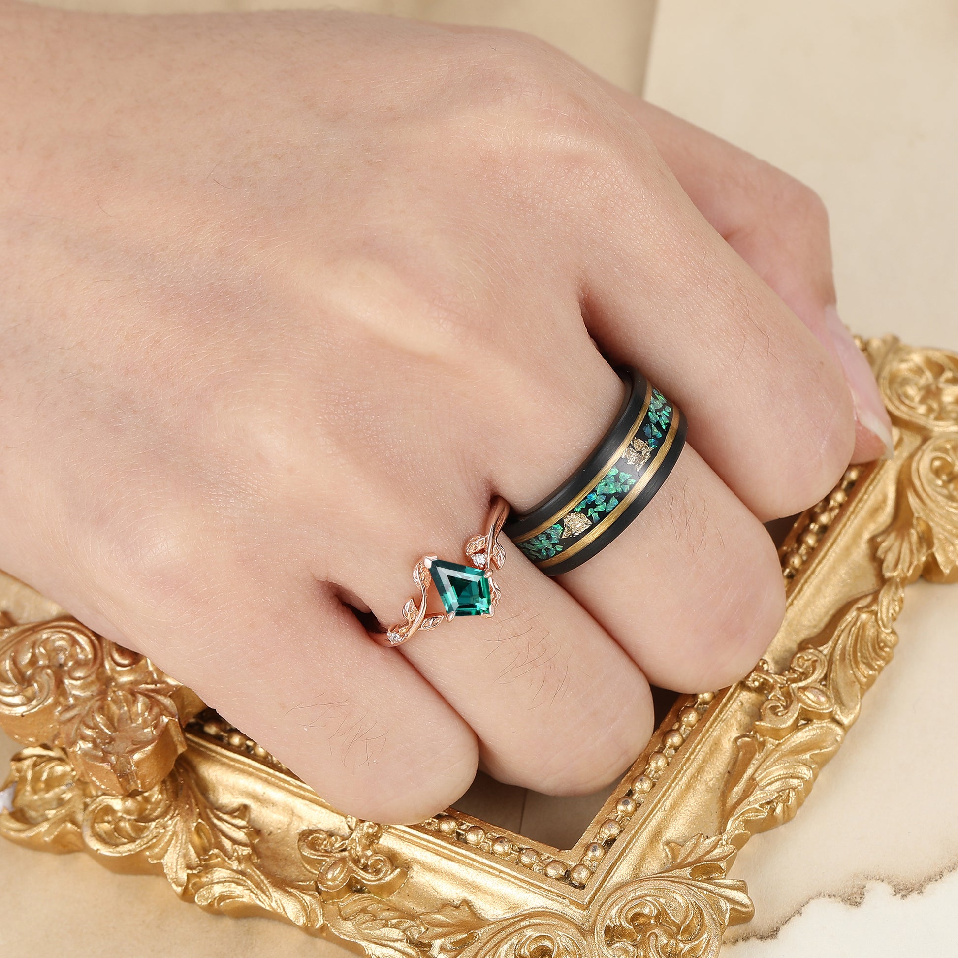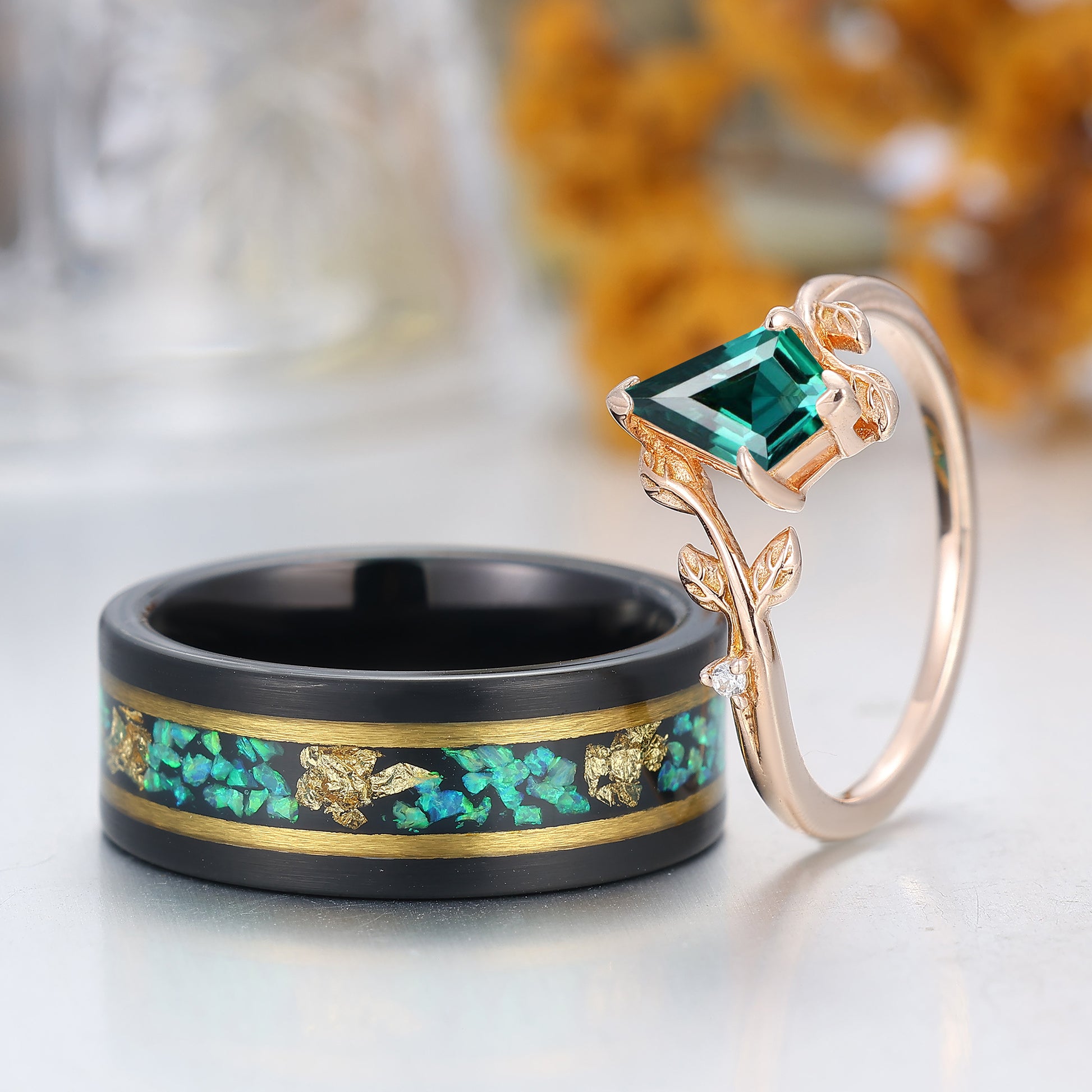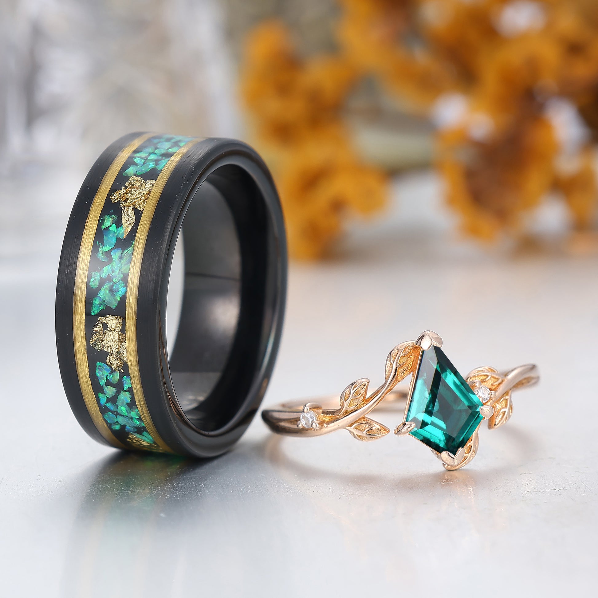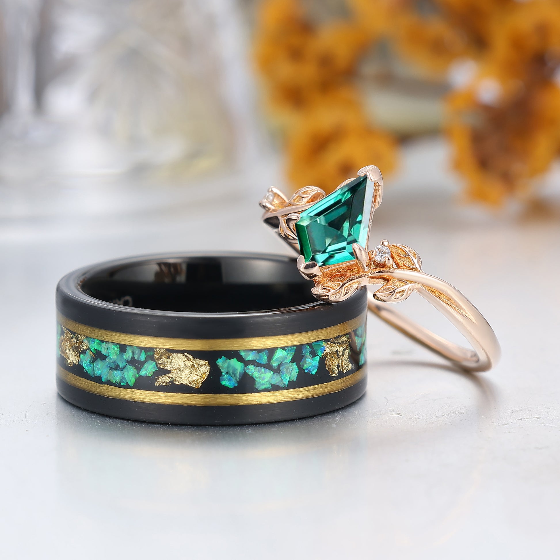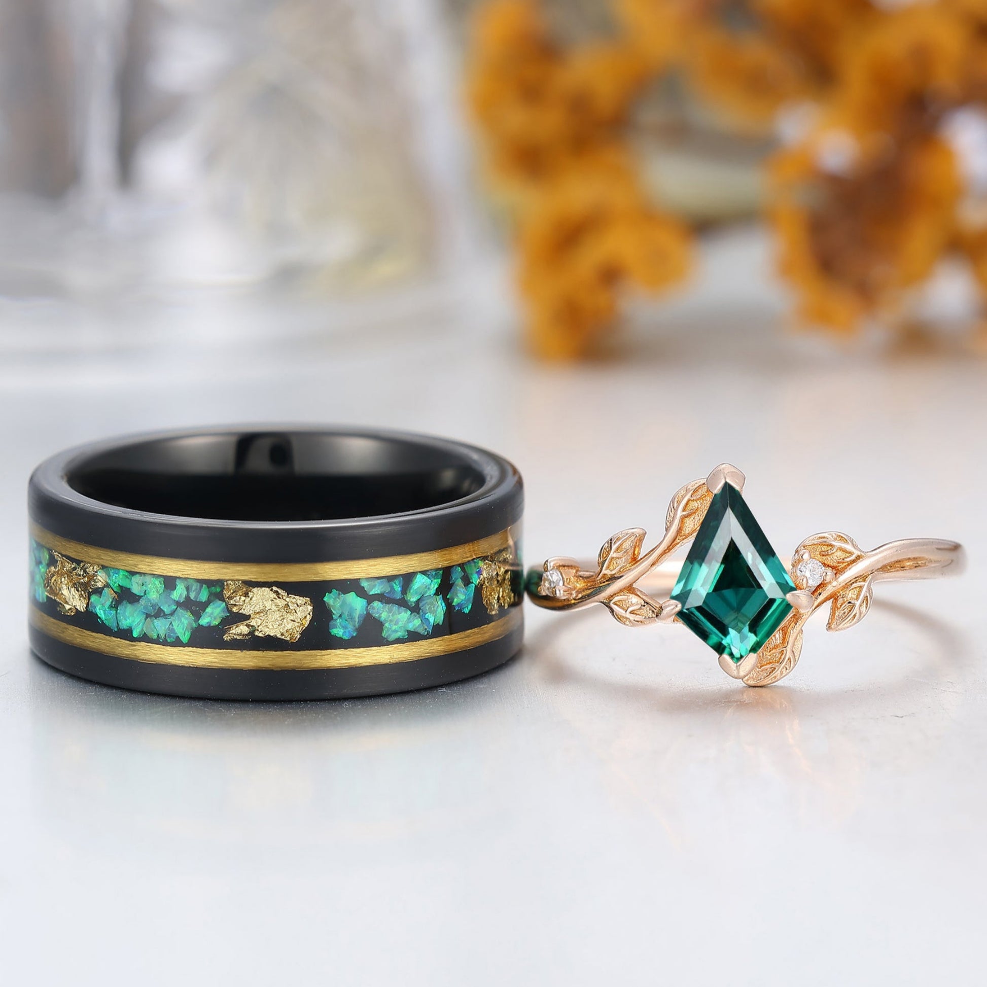 Dainty Kite Cut Emerald His And Hers Rings Green Emerald Leaf Twigs Style Couple Ring