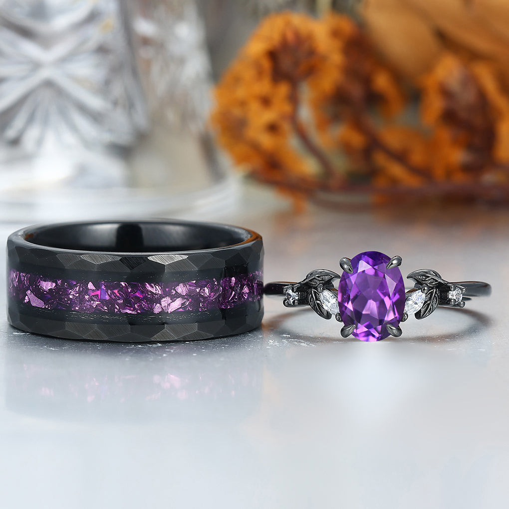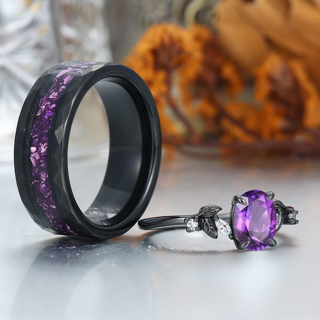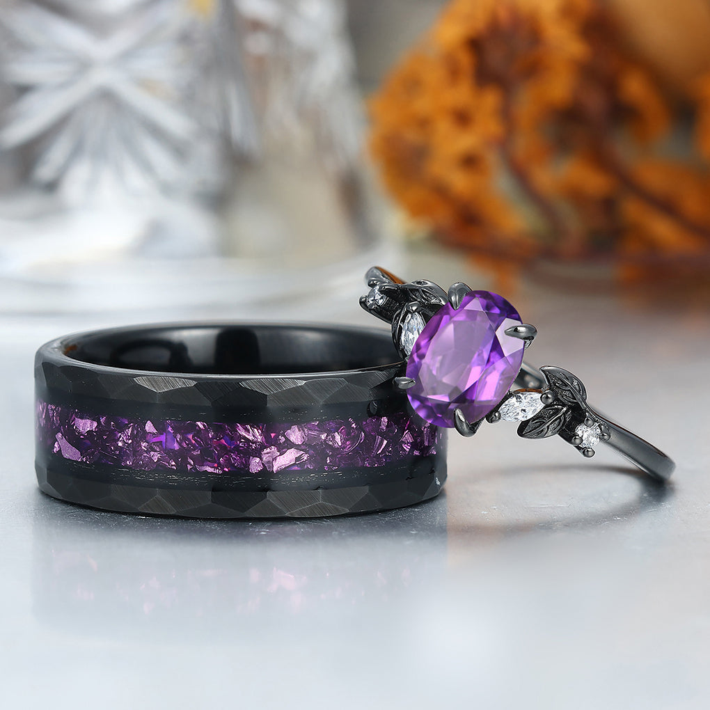 Dainty Natural Amethyst Leaves Couples Ring Set Amethyst Tungsten Inlay Matching Ring