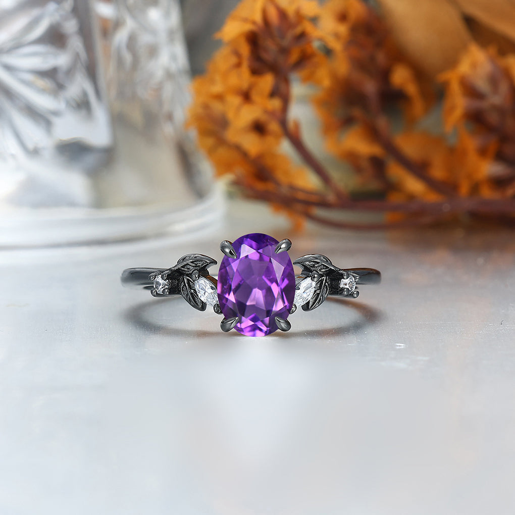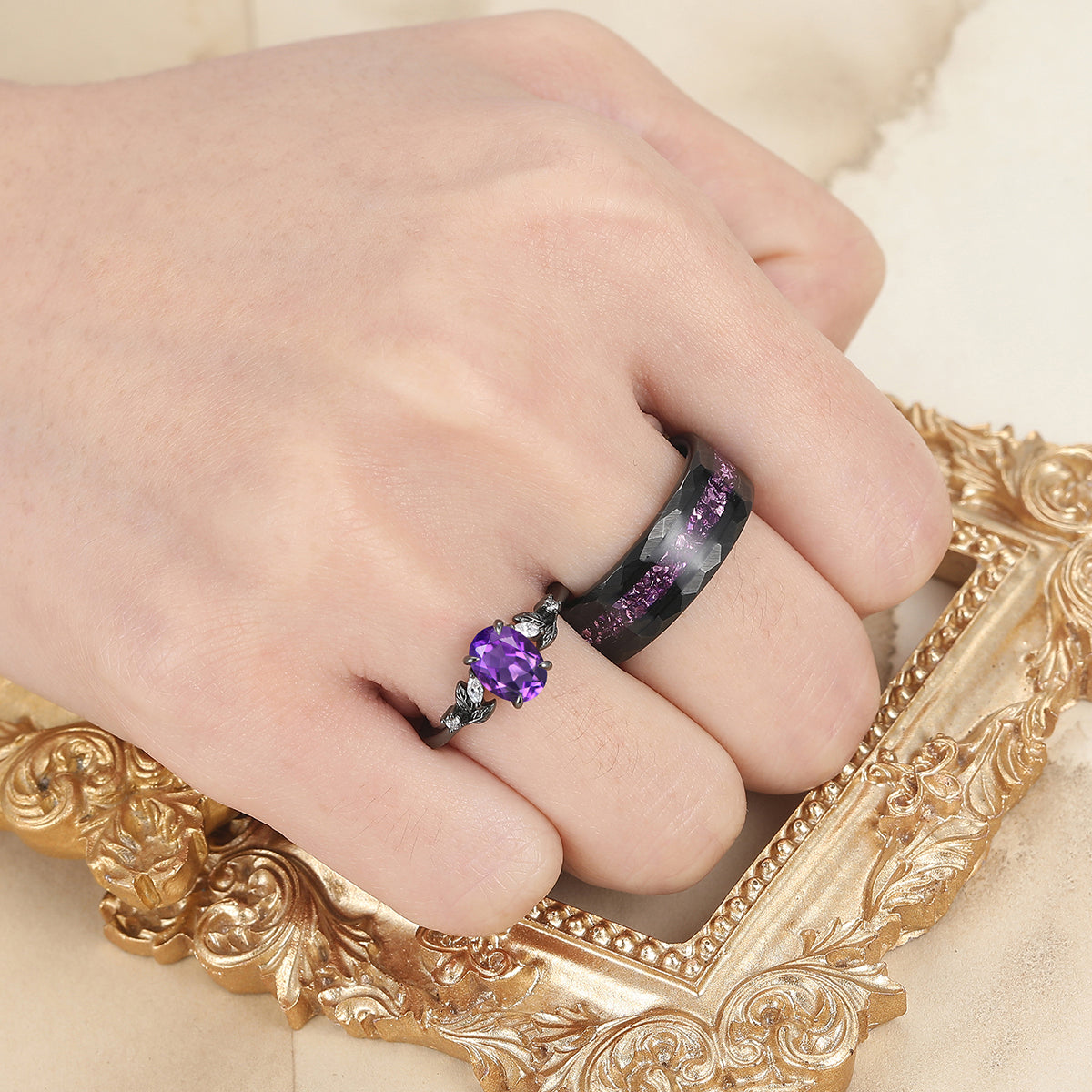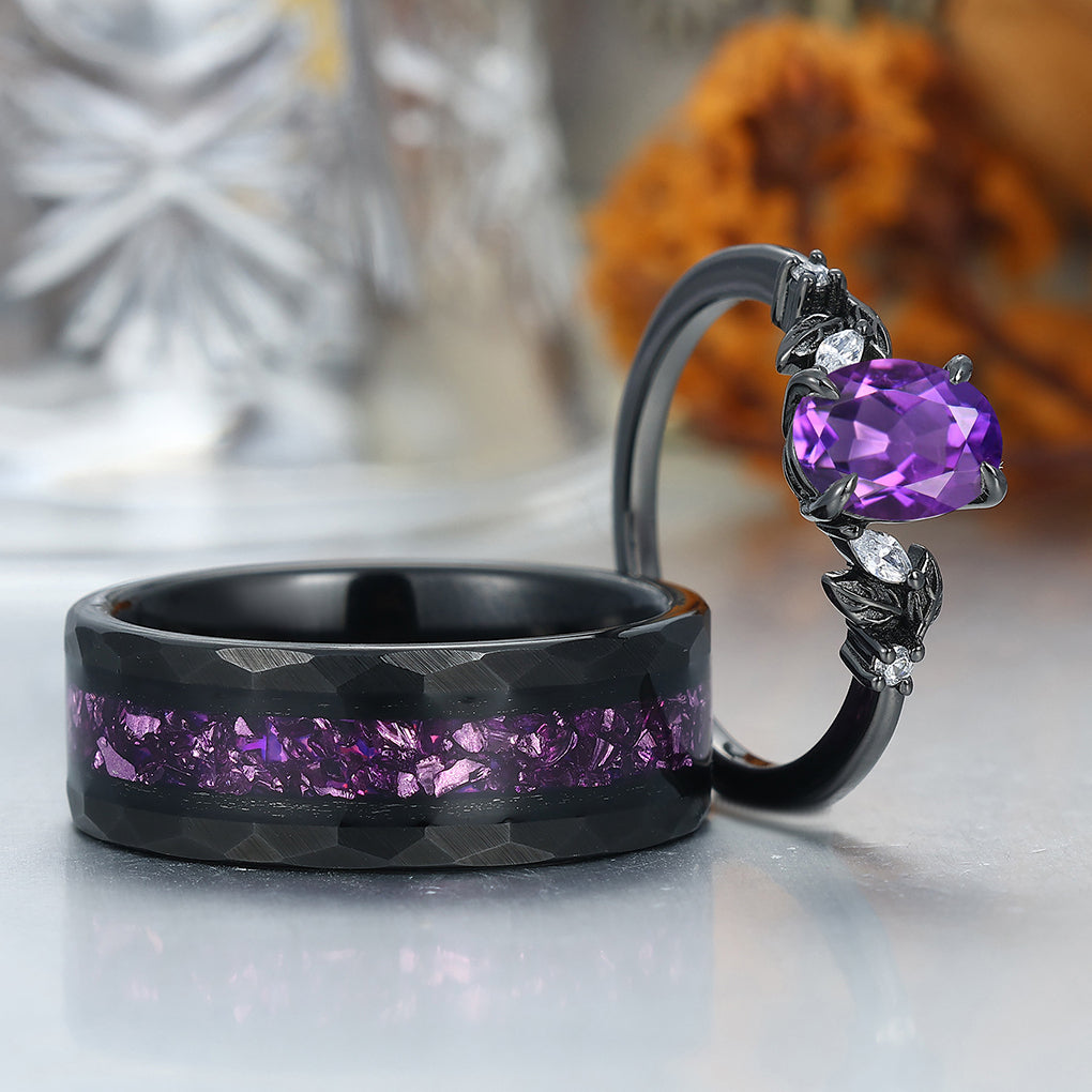 Dainty Natural Amethyst Leaves Couples Ring Set Amethyst Tungsten Inlay Matching Ring