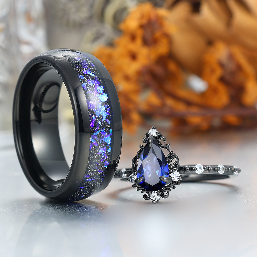 Dainty Pear Cut Sapphire Engagement Couple Rings 925 Sterling Silver And Tungsten Matching Ring