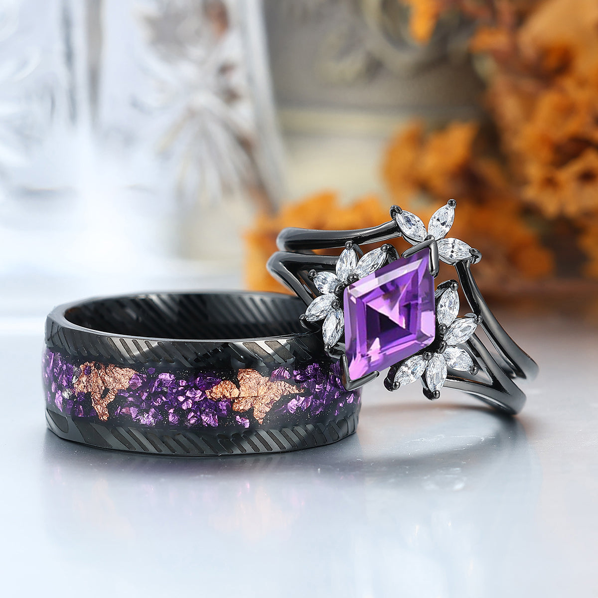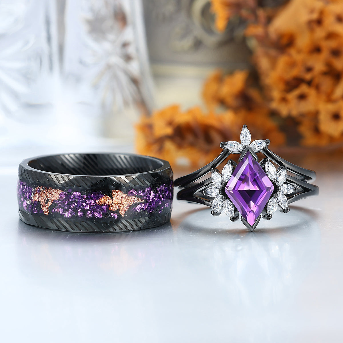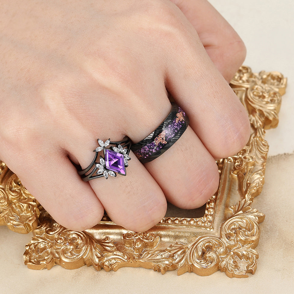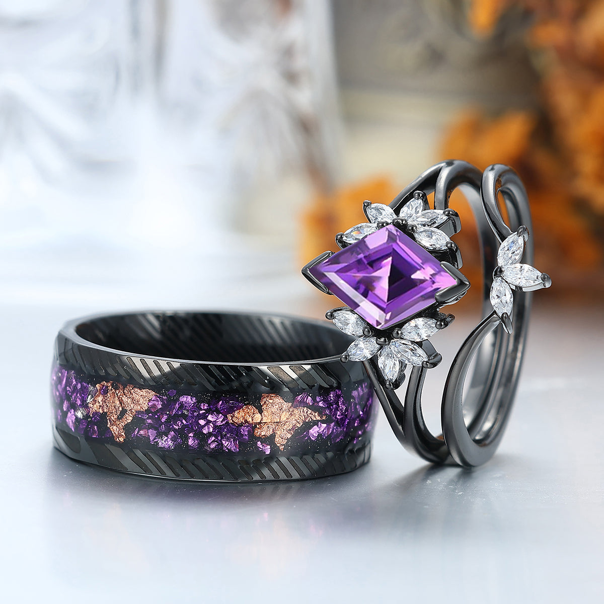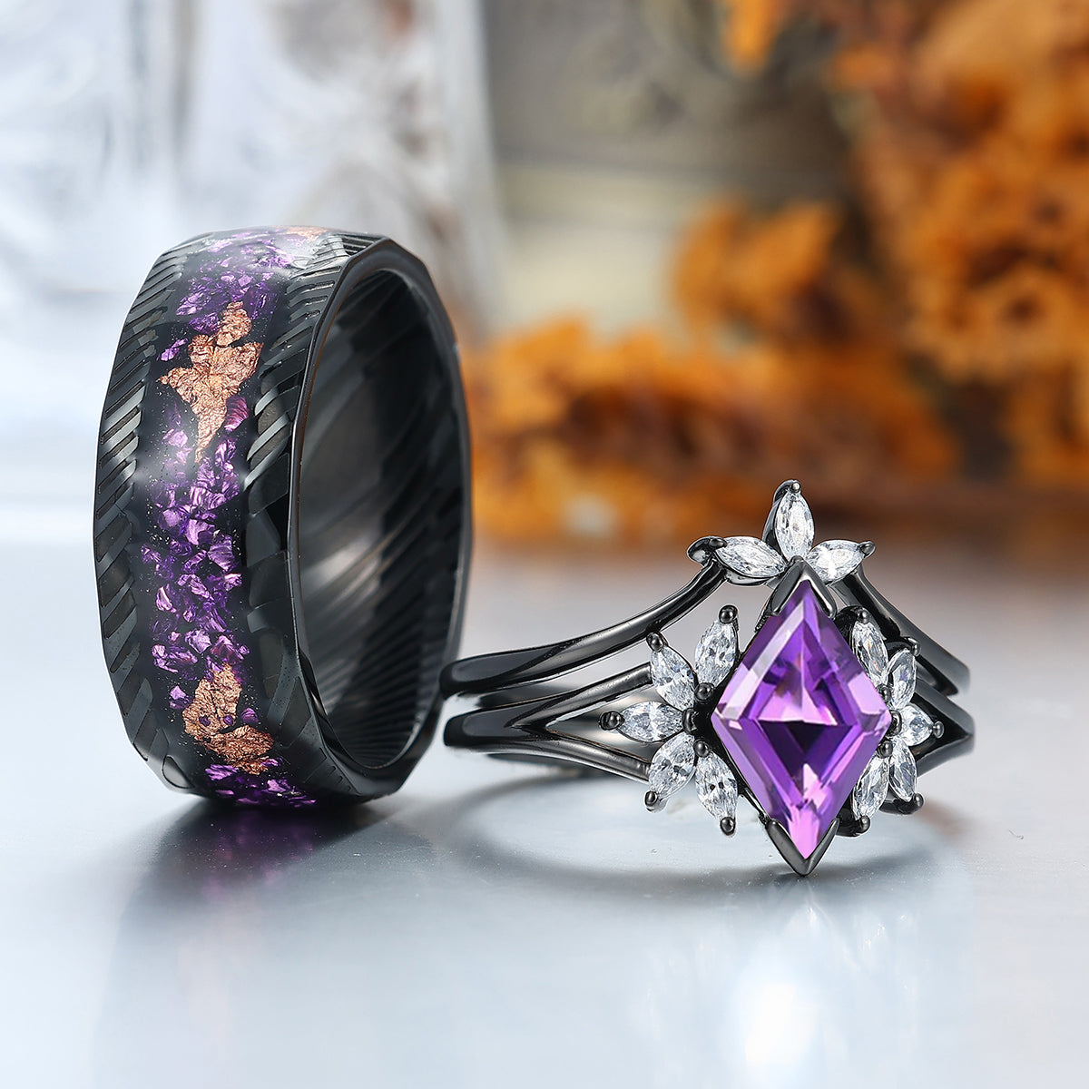 Delicate Amethyst Petal Engagement Couple Rings Set Matching Promise Purple Damascus Steel Wedding Band