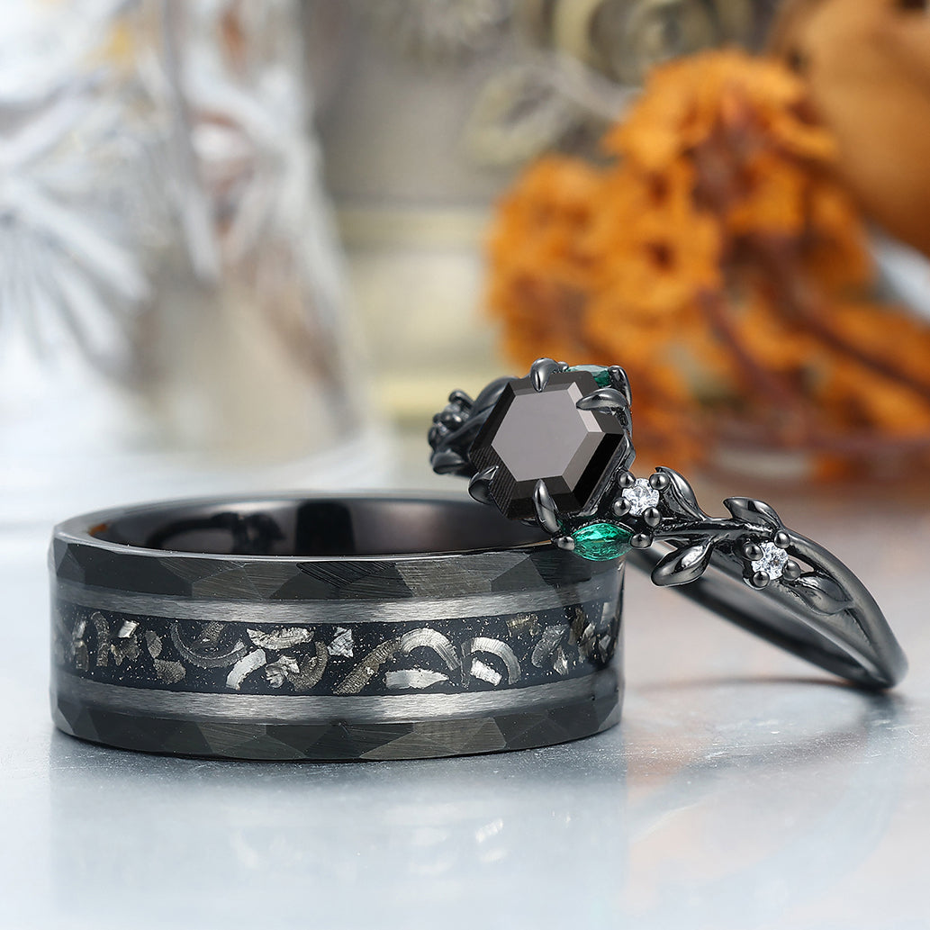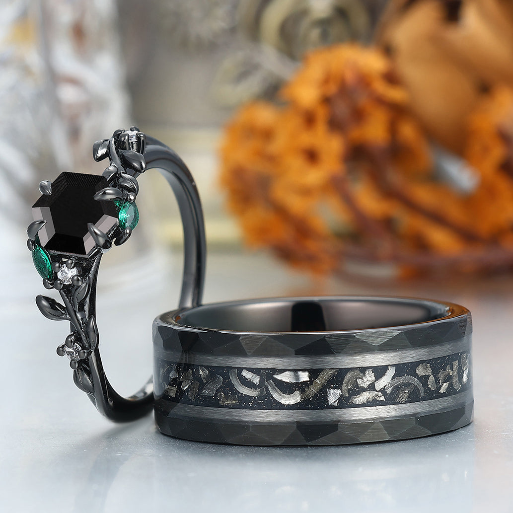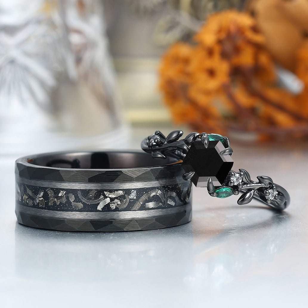 Delicate Black Onyx Leaves Engagement Couple Rings Matching Promise Wedding Bands