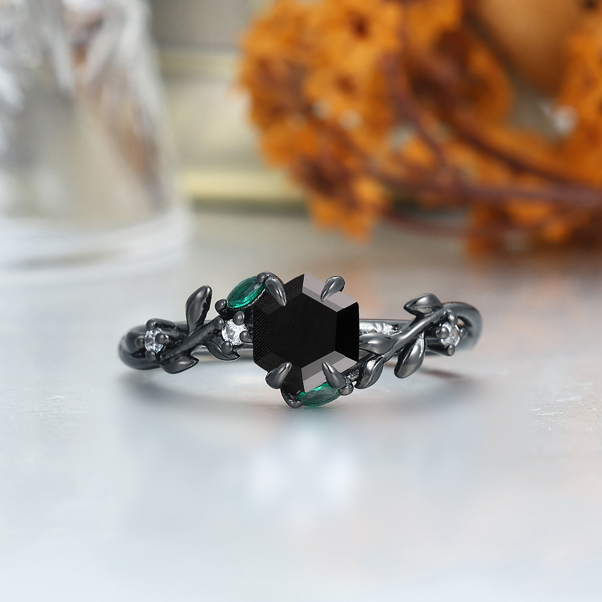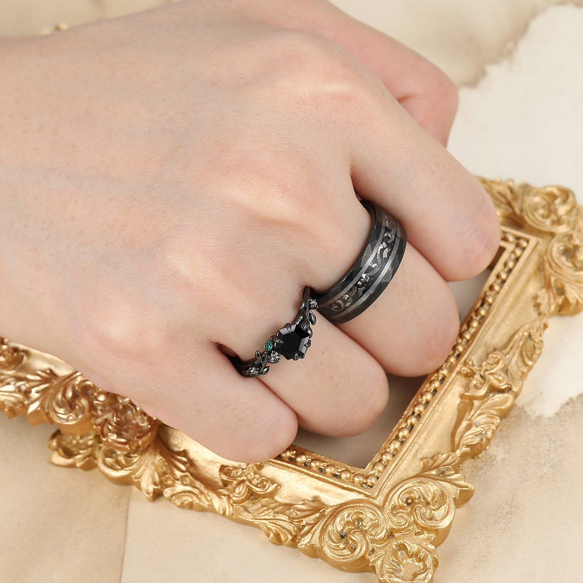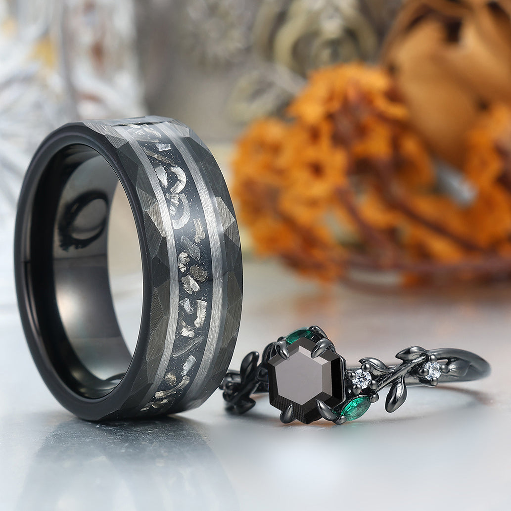 Delicate Black Onyx Leaves Engagement Couple Rings Matching Promise Wedding Bands