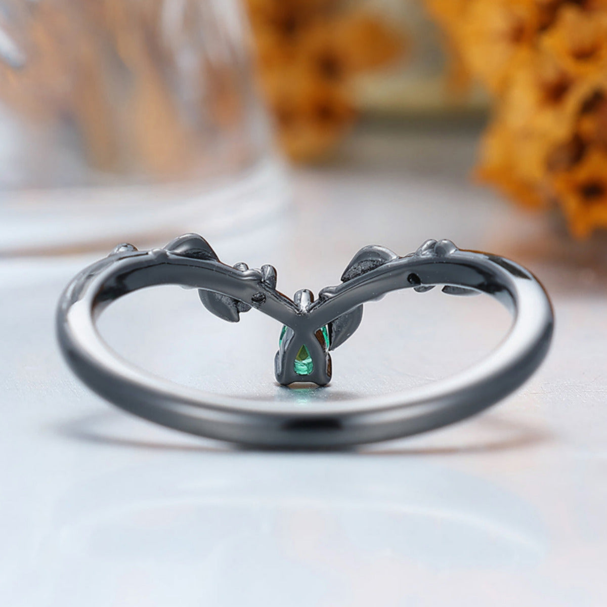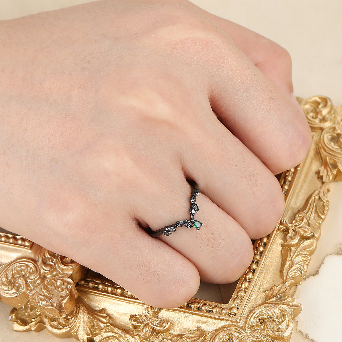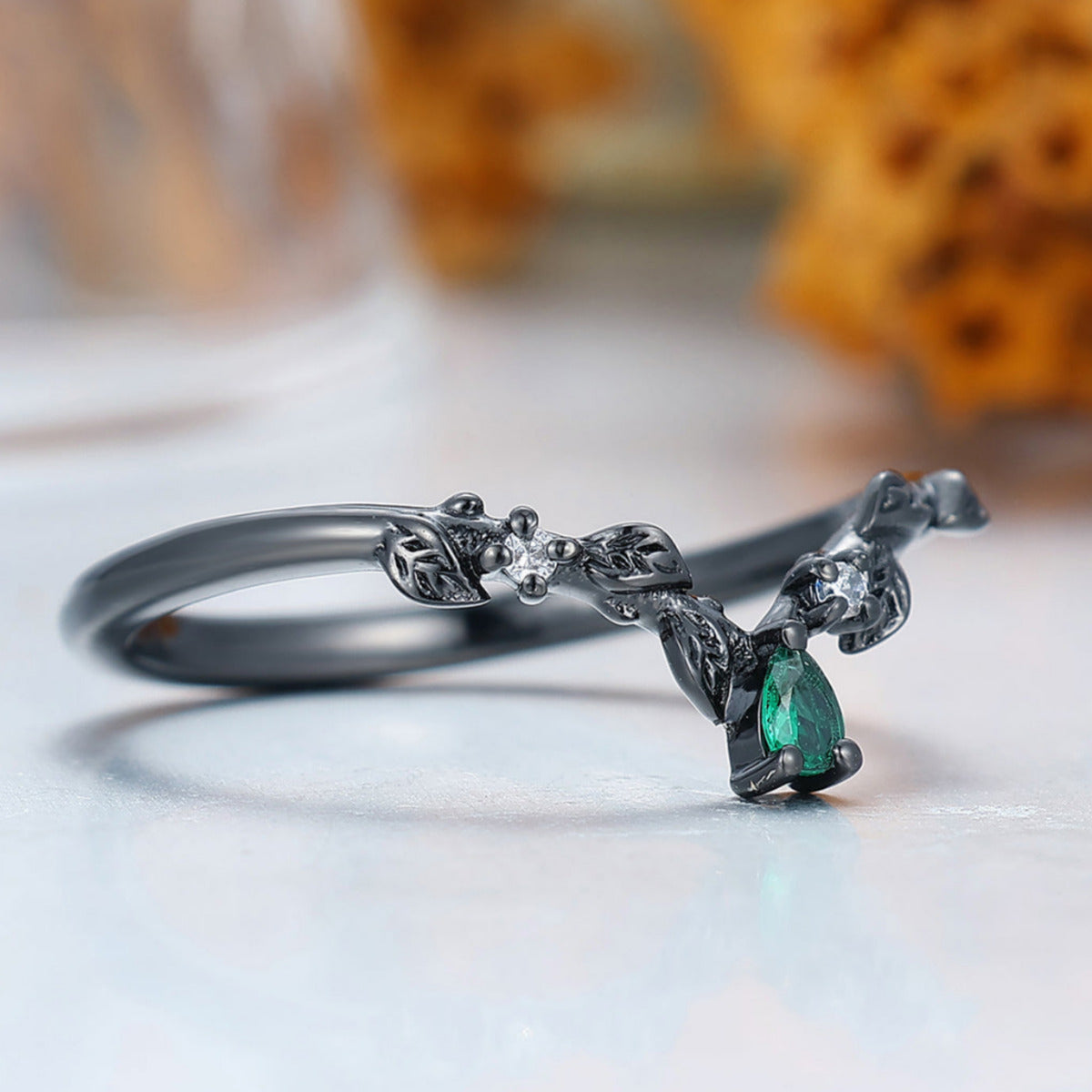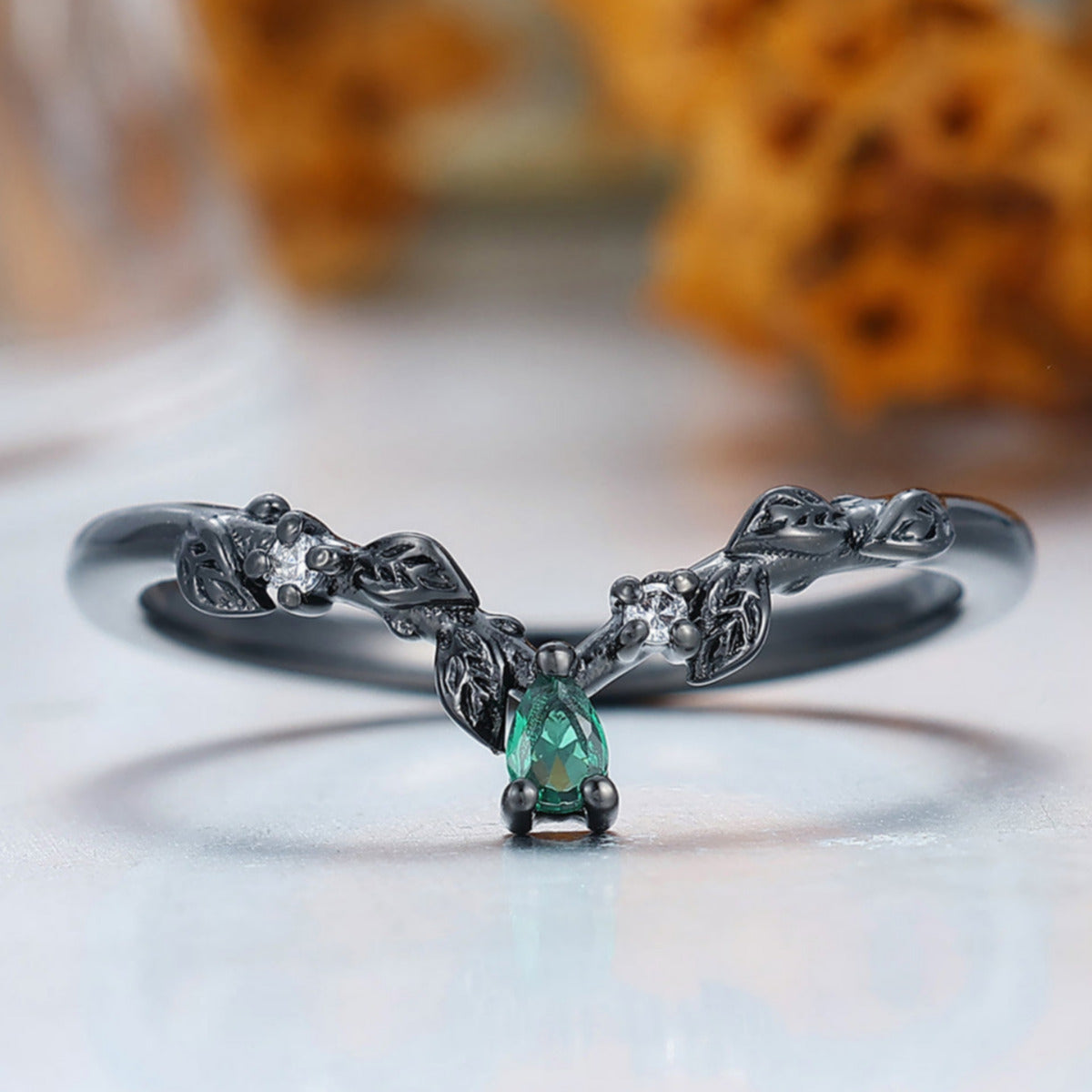 Delicate Leaf Vine Design Ring Curved Green Emerald Leaf Ring in Black Gold
