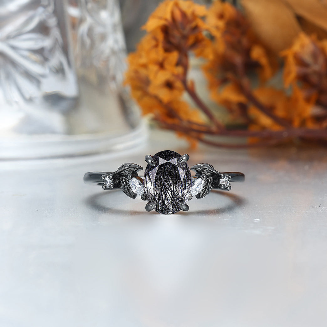 Elegant Black Rutilated Quartz Leaf Accents Engagement Rings For Couples Hammered Black Tungsten Bands