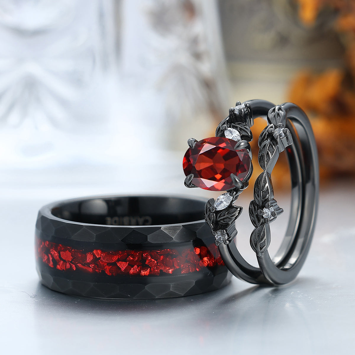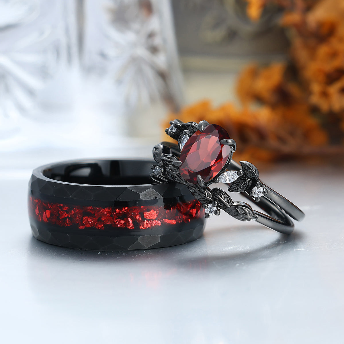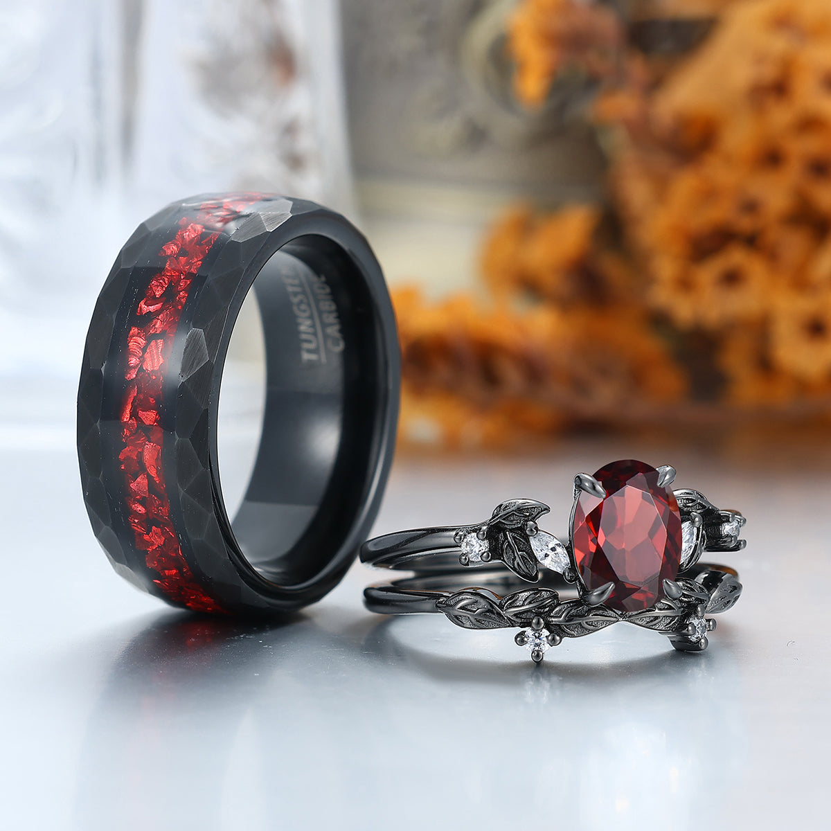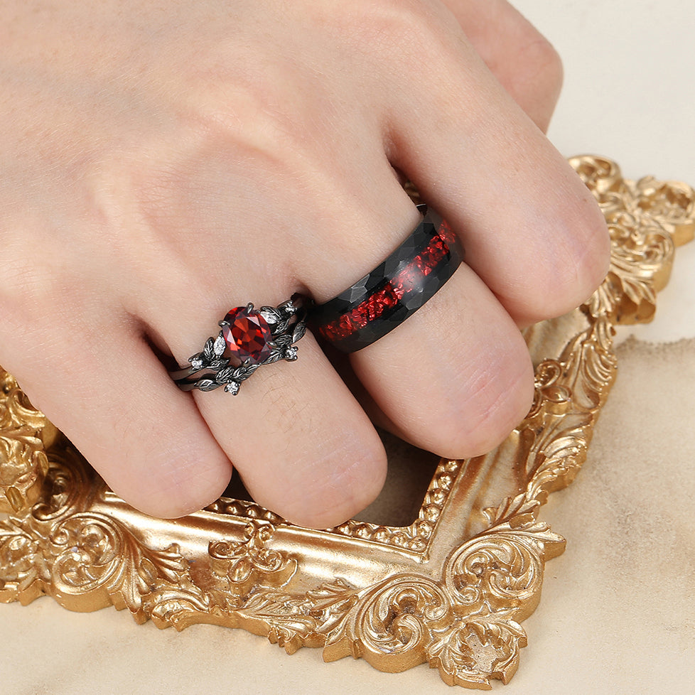 Elegant Red Garnet Leaf Accents Engagement Rings For Couples Hammered Ruby Tungsten Bands