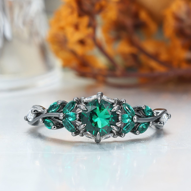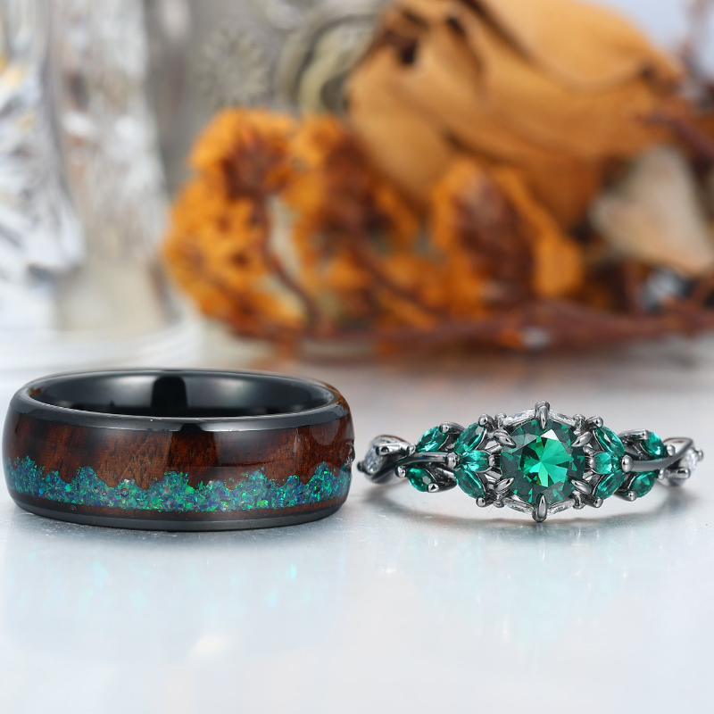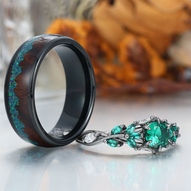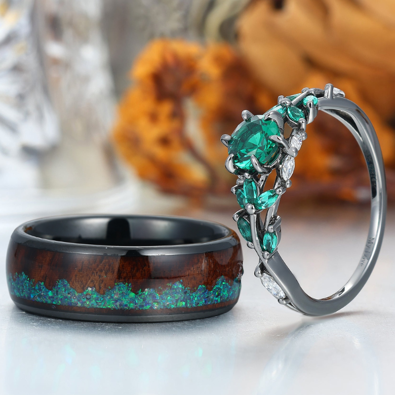 Emerald Engagement Couples Ring Set And Wood Inlay Tungsten Matching Ring His and Hers Ring Set