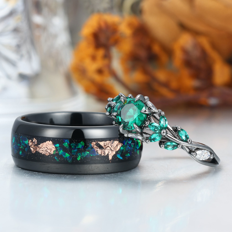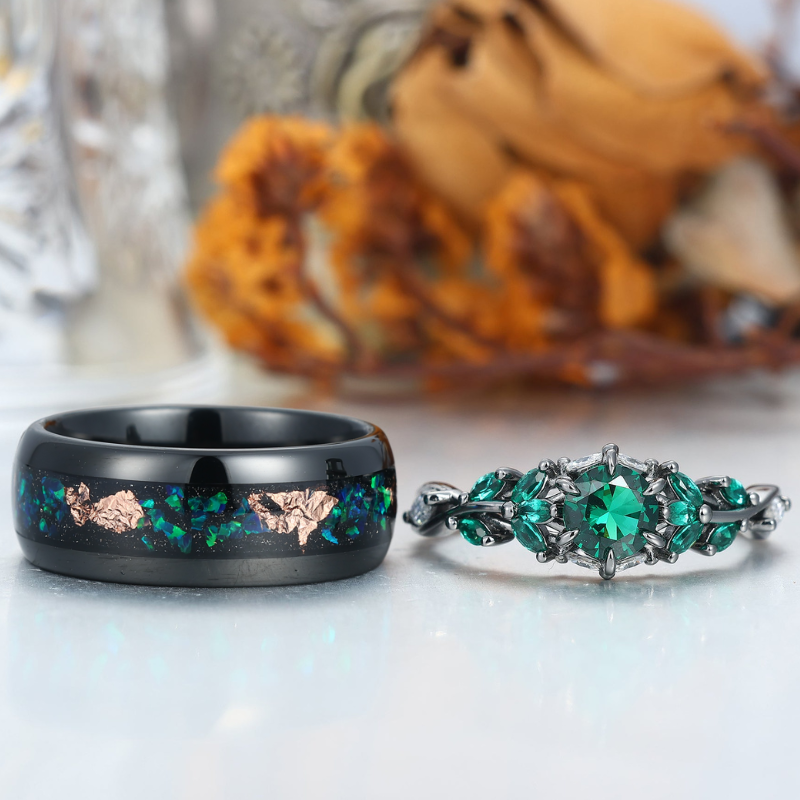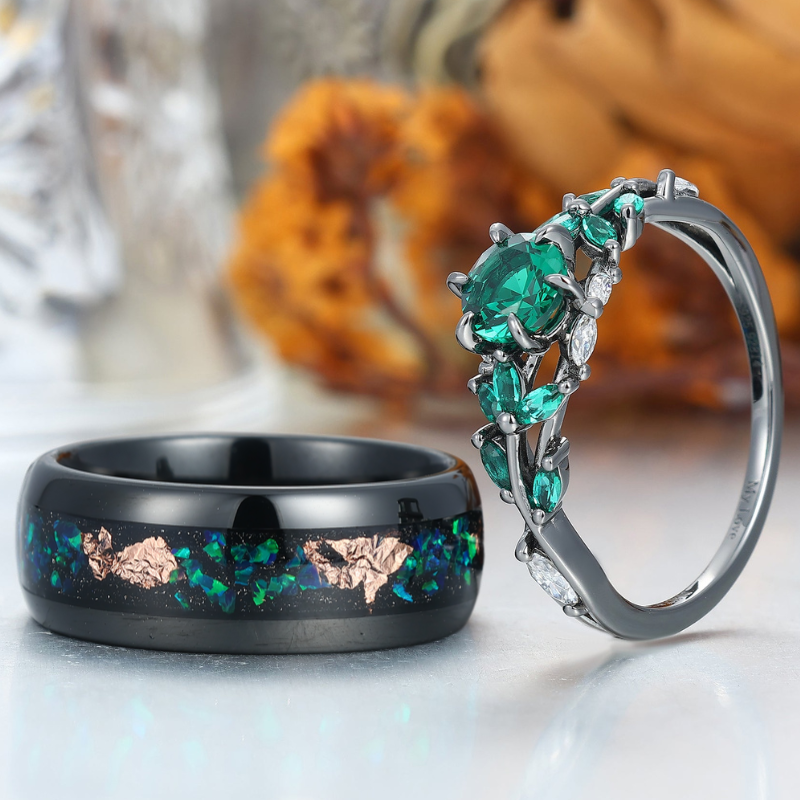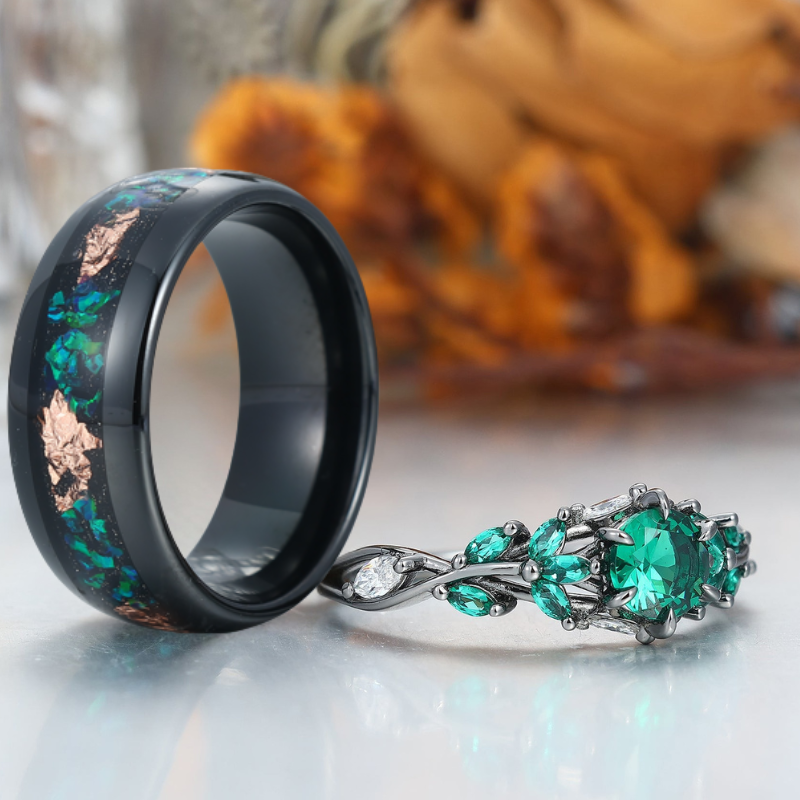 Emerald Engagement Couples Ring Set And Green Tungsten Matching Ring His and Hers Ring Set