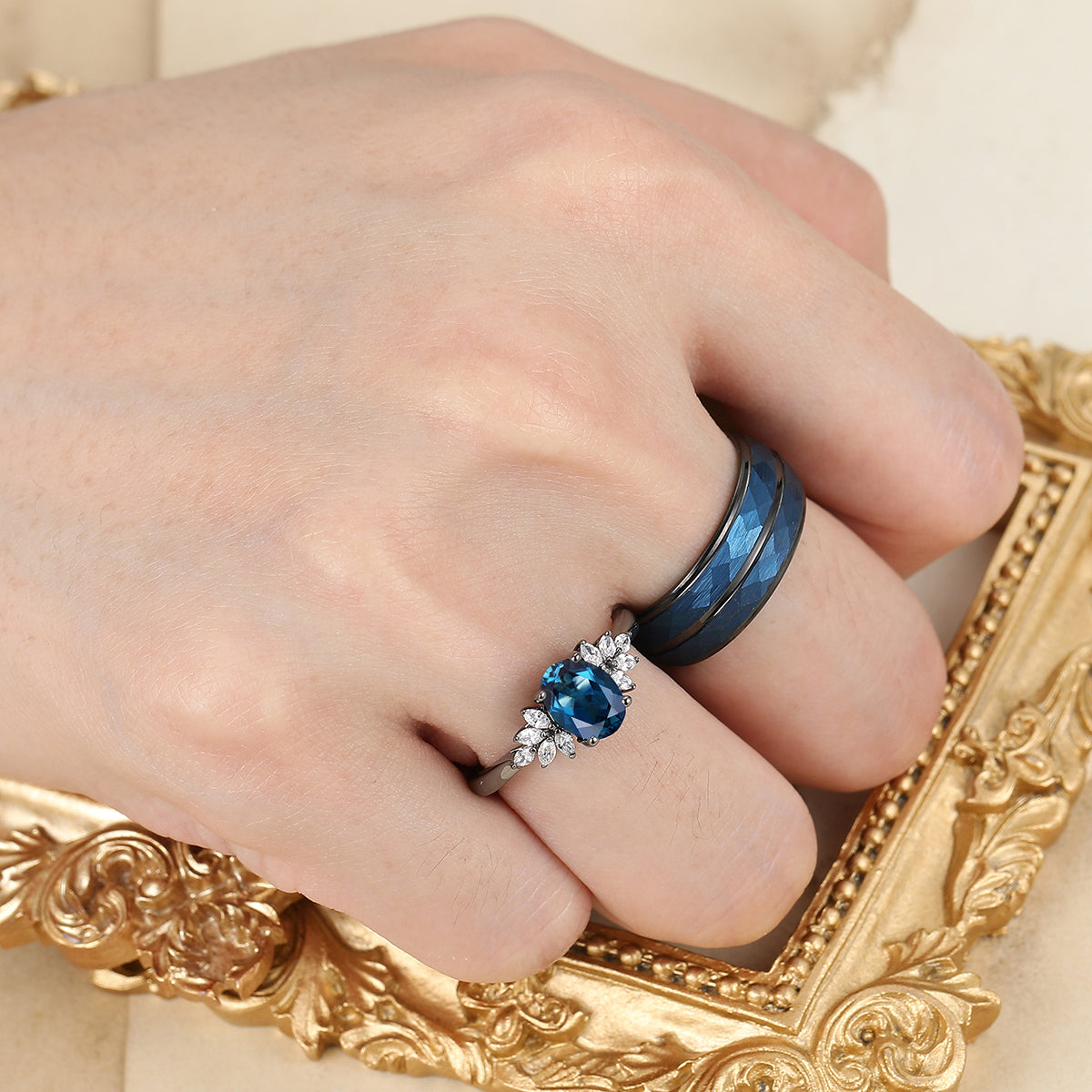 Exquisite London Blue Topaz Engagement Couple Rings Modern Blue Tungsten Hammered Wedding Band