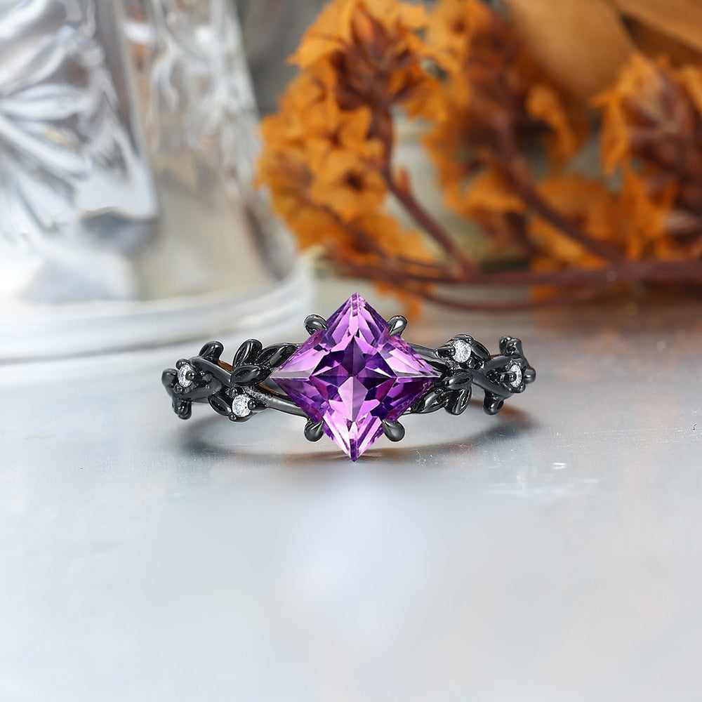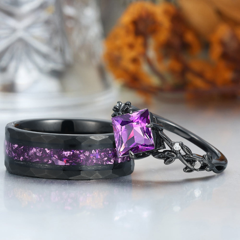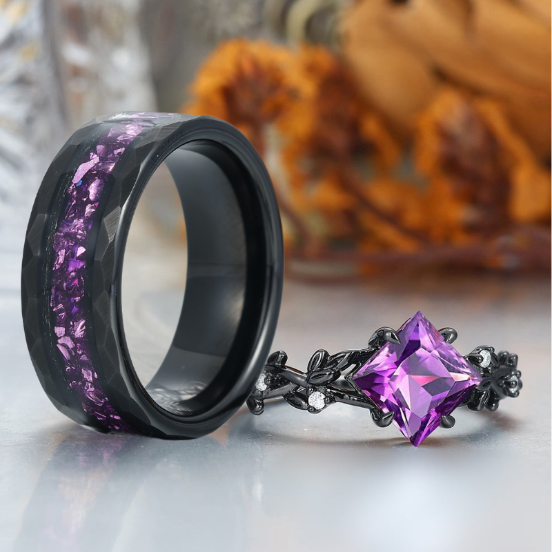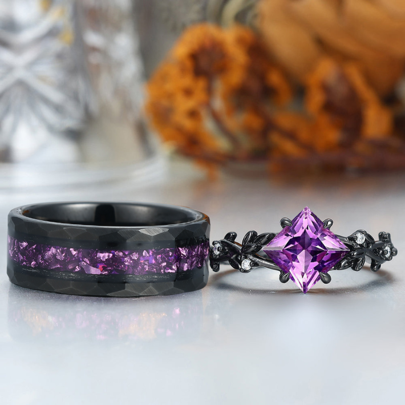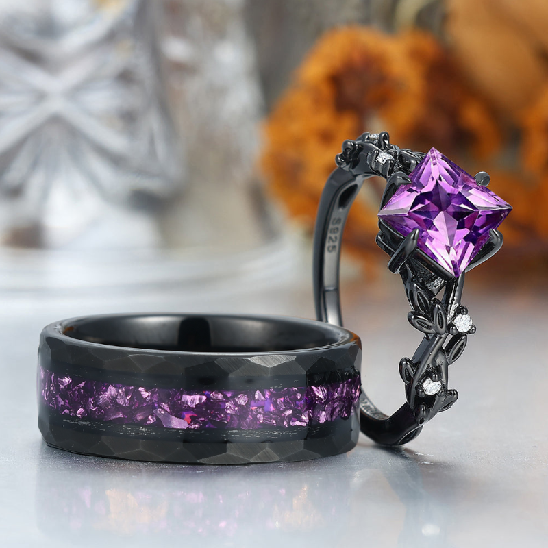 Exquisite Natural Amethyst Leaves Engagement Couple Rings S925 And Tungsten Wedding Bands