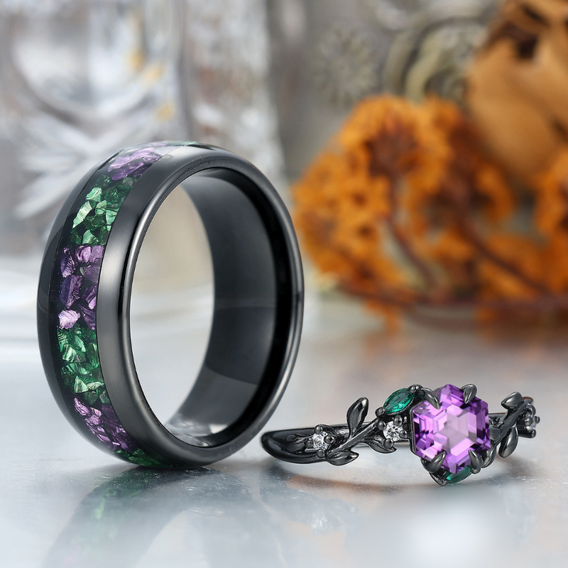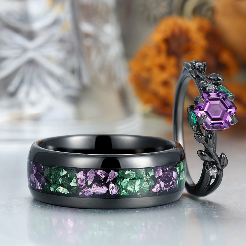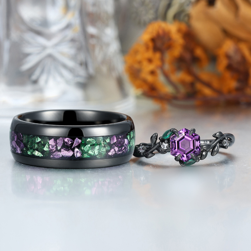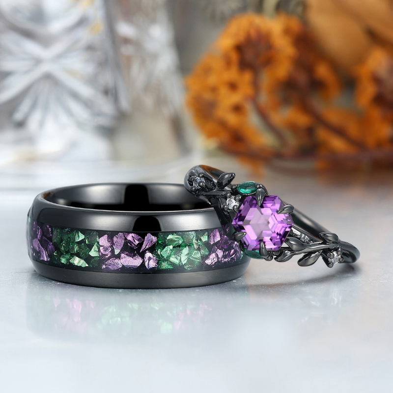 Fascinating Amethyst Leaf Engagement Couple Rings Matching Tungsten His and Hers Wedding Band