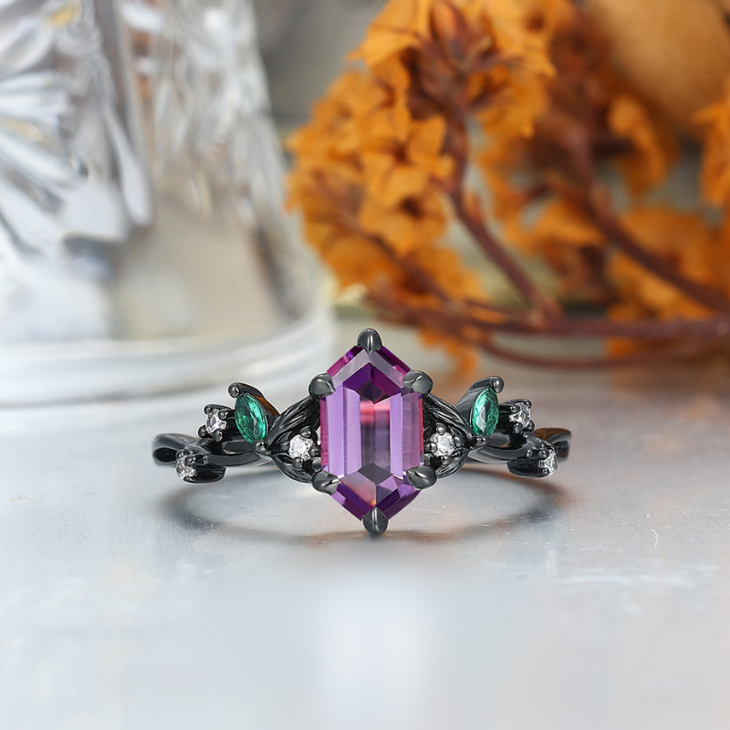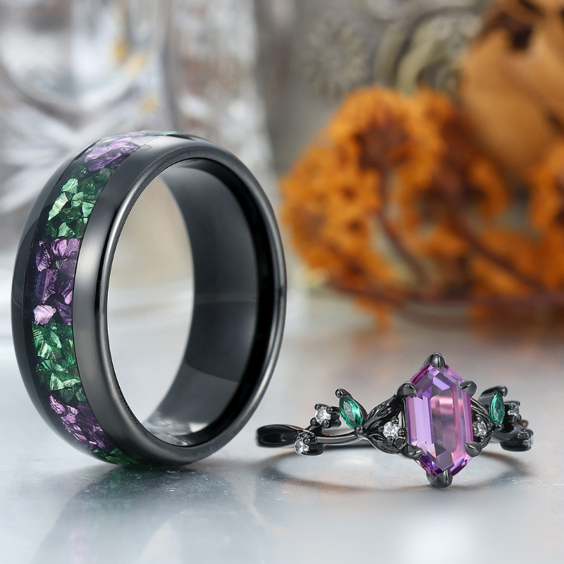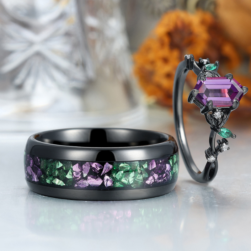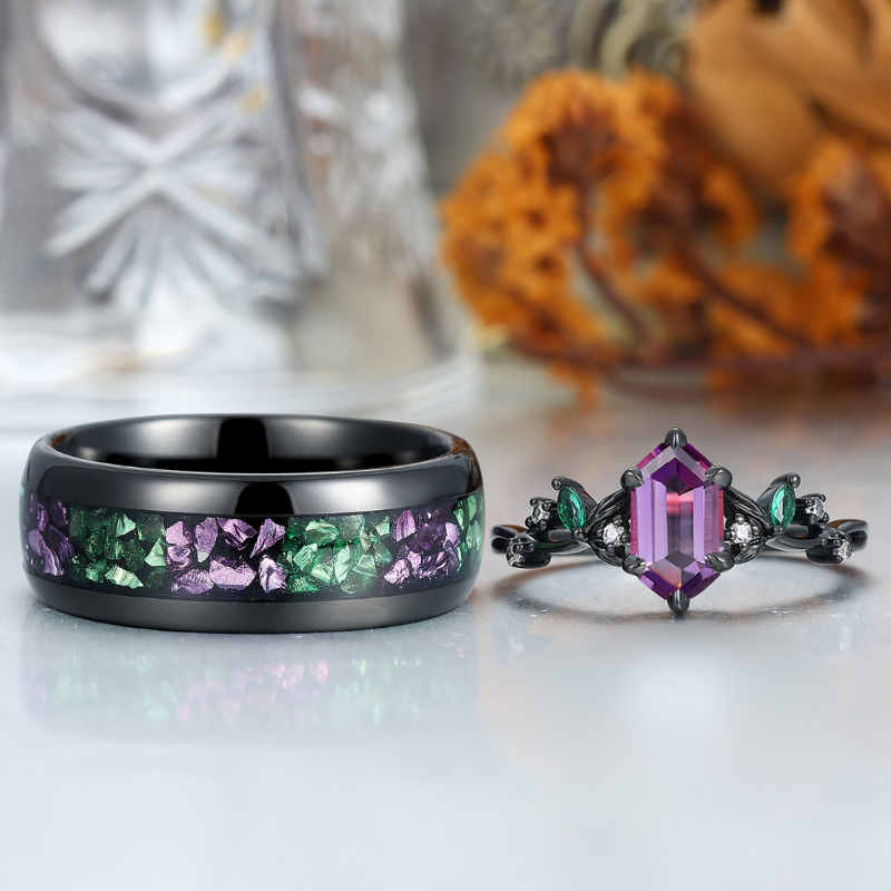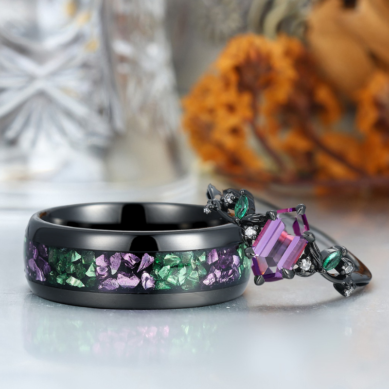 Fascinating Long Hexagon Amethyst Leaf Engagement Couple Rings Matching Tungsten His and Hers Wedding Band