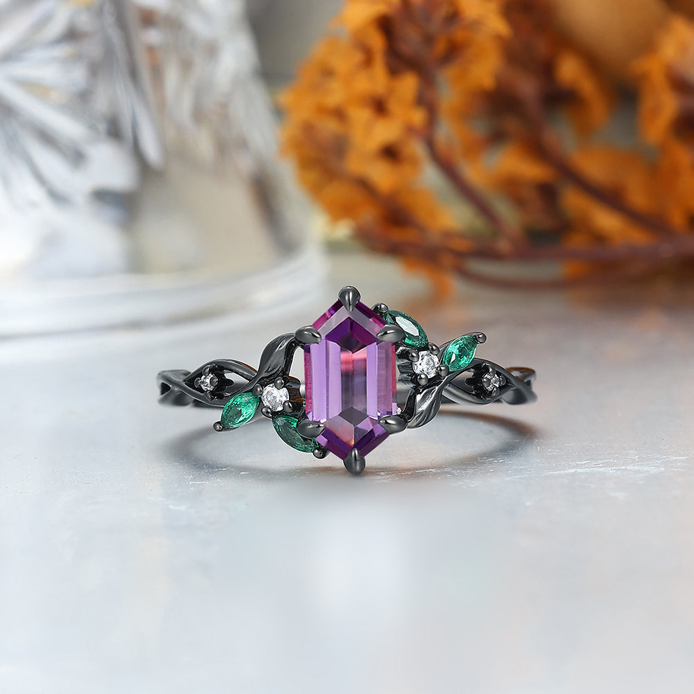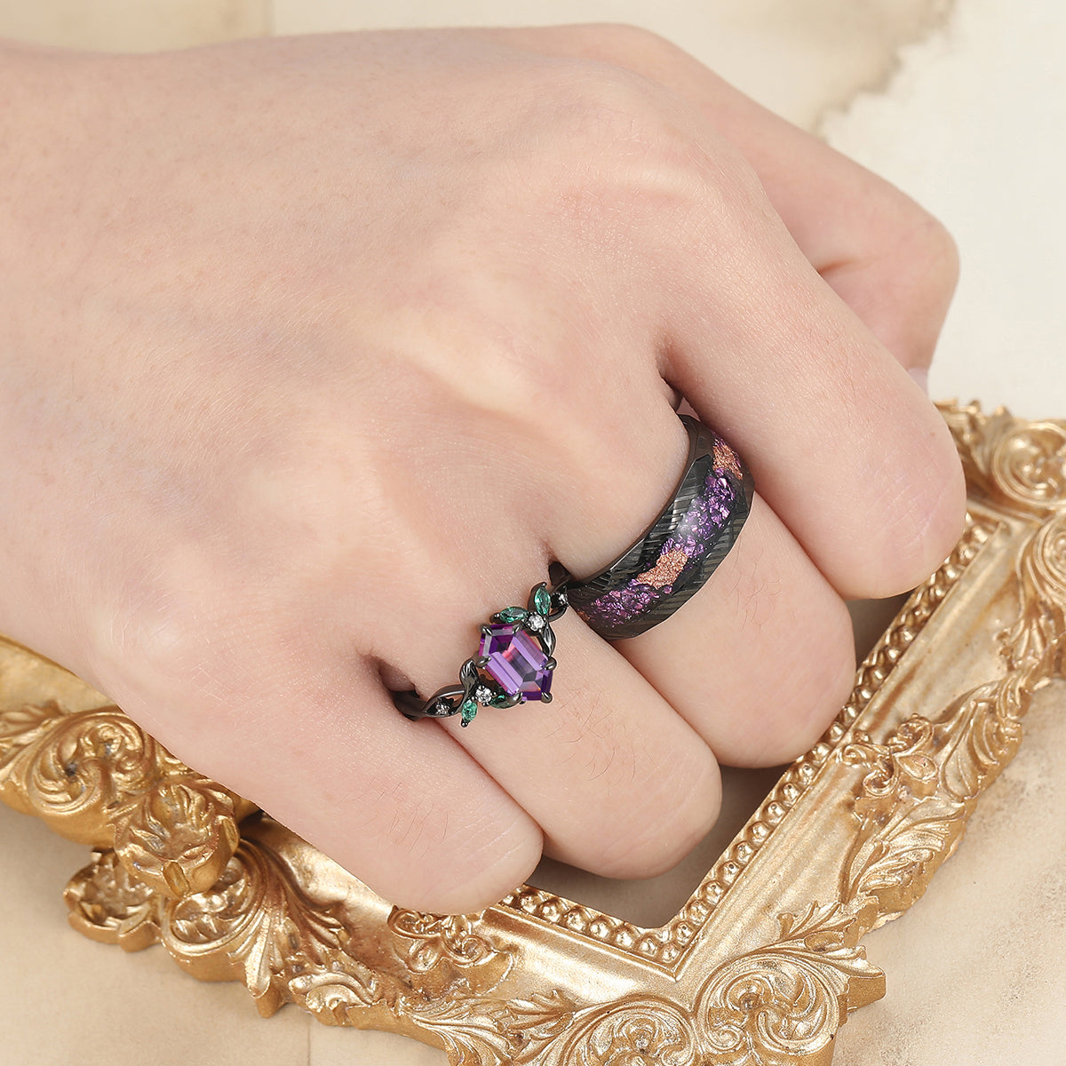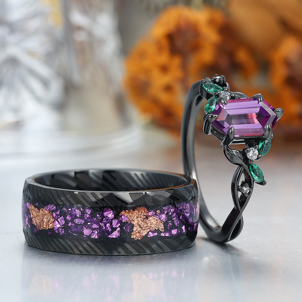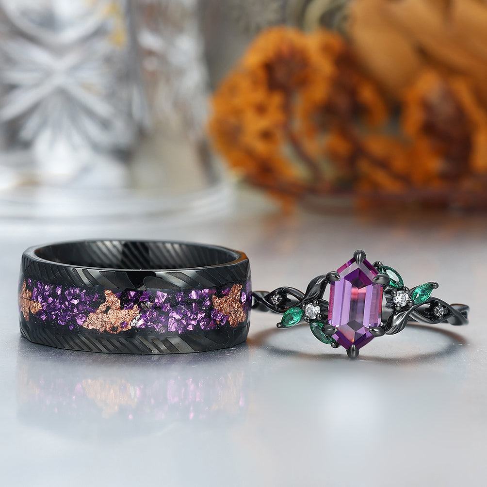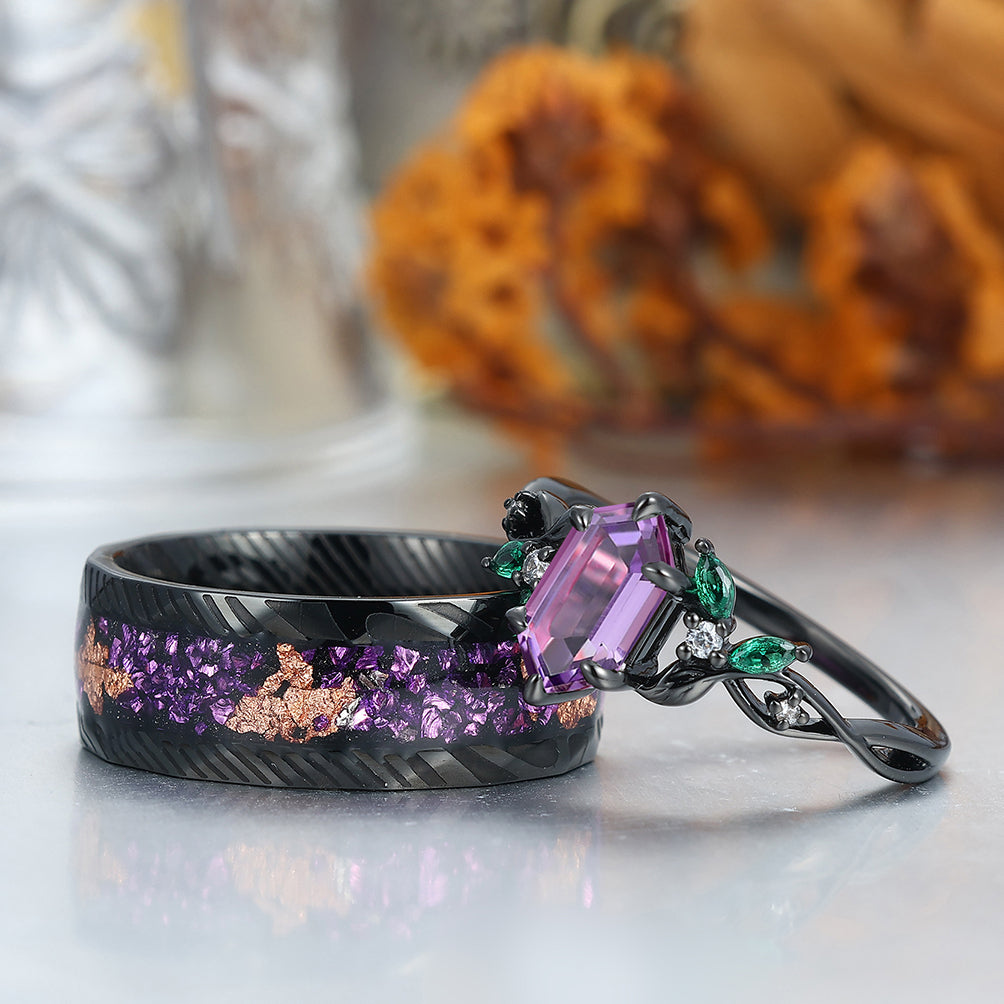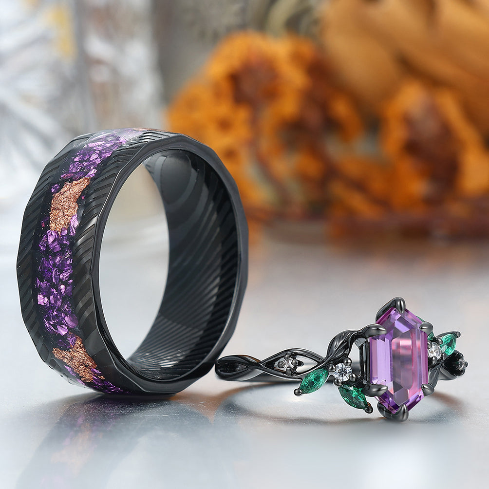 Gorgeous Natural Amethyst Curved Leaf Motifs Couple Rings S925 And Hammered Green Damascus Steel Couples' Set