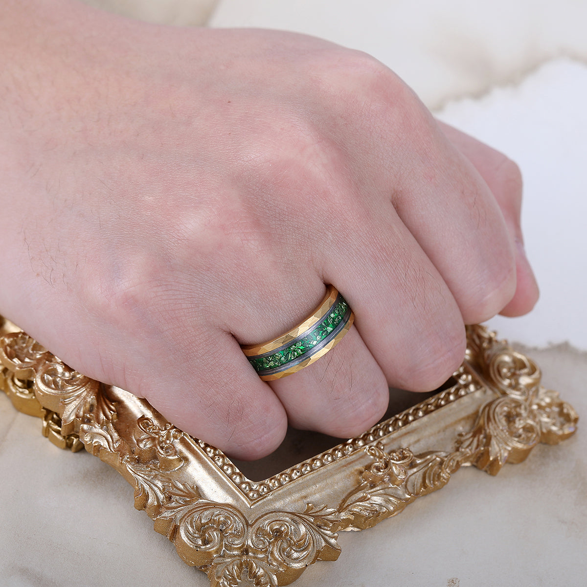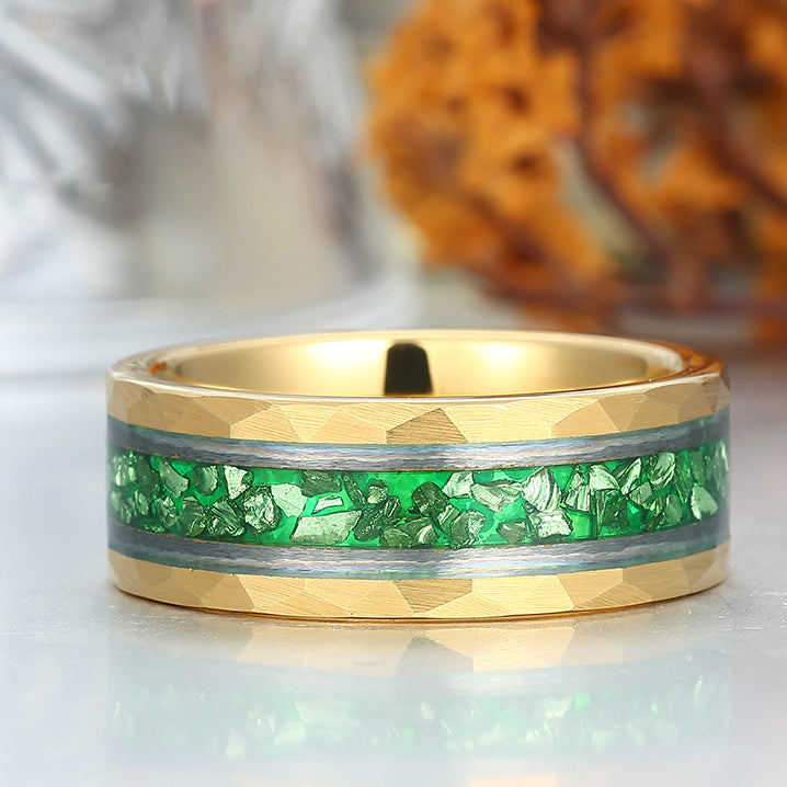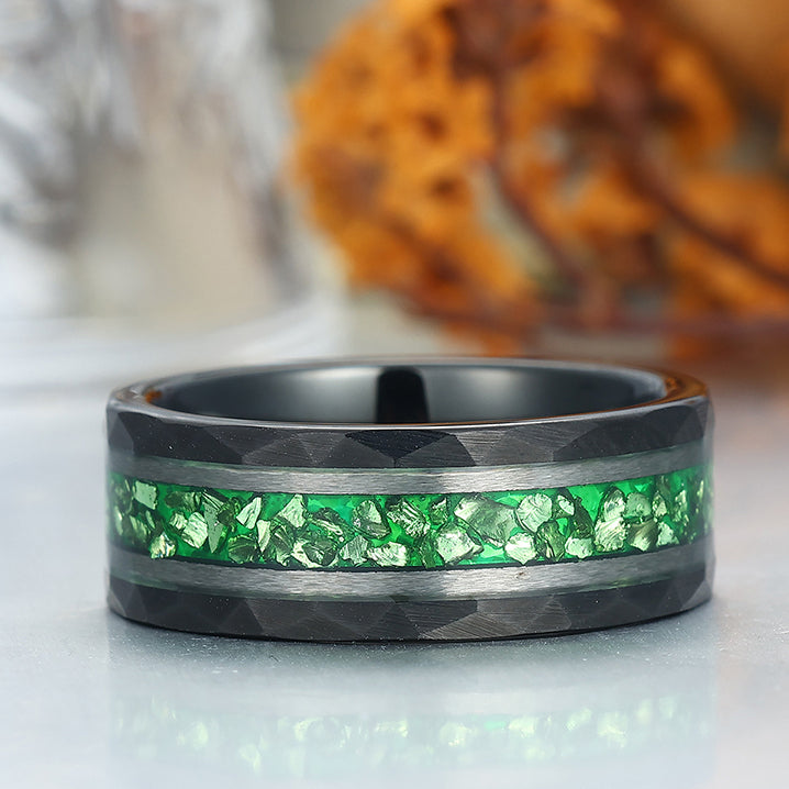 Green Emerald Men' s Tungsten Ring Hammered Unisex Anniversary Birthday Wedding Band