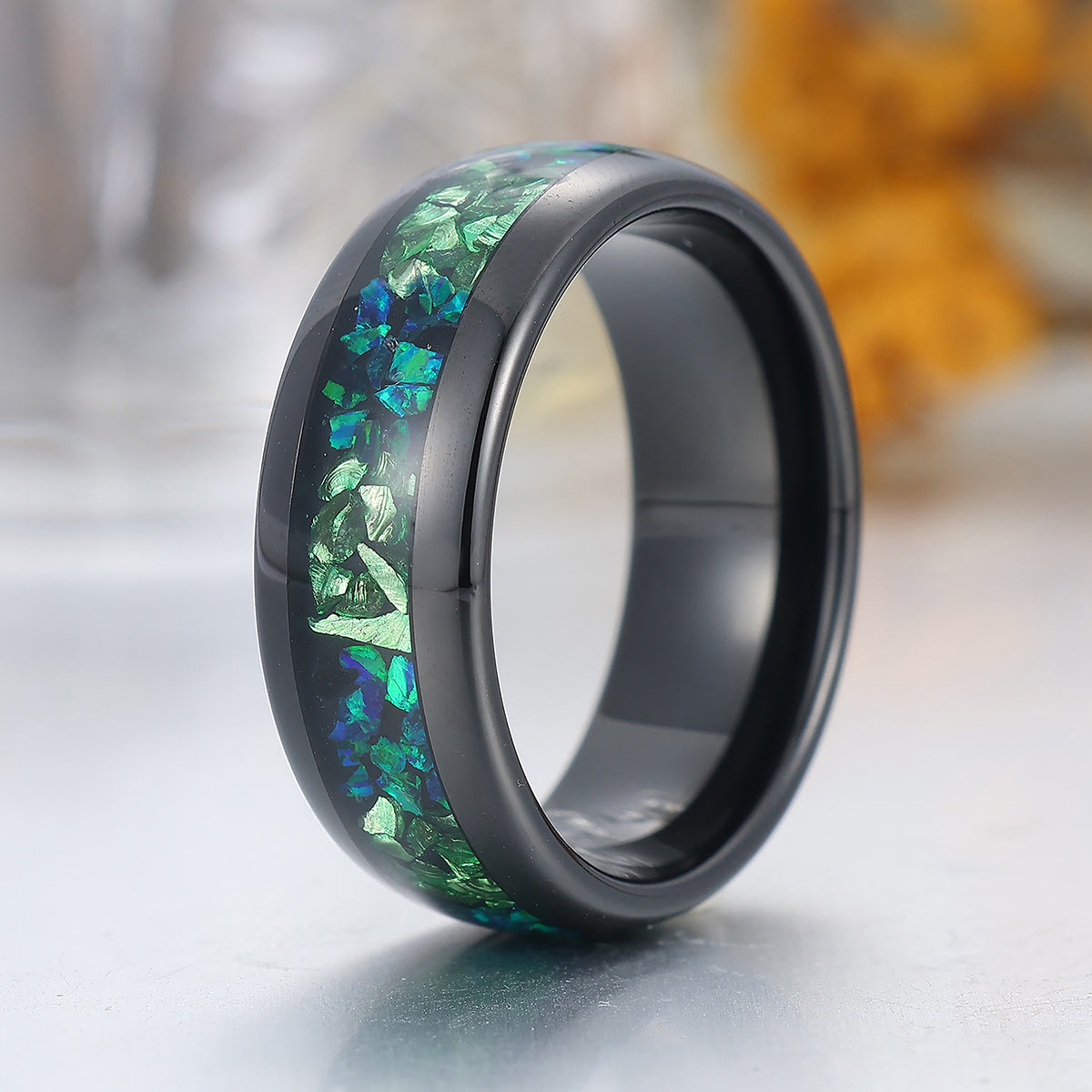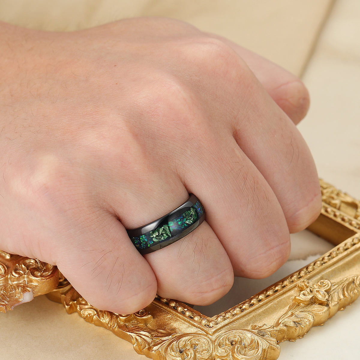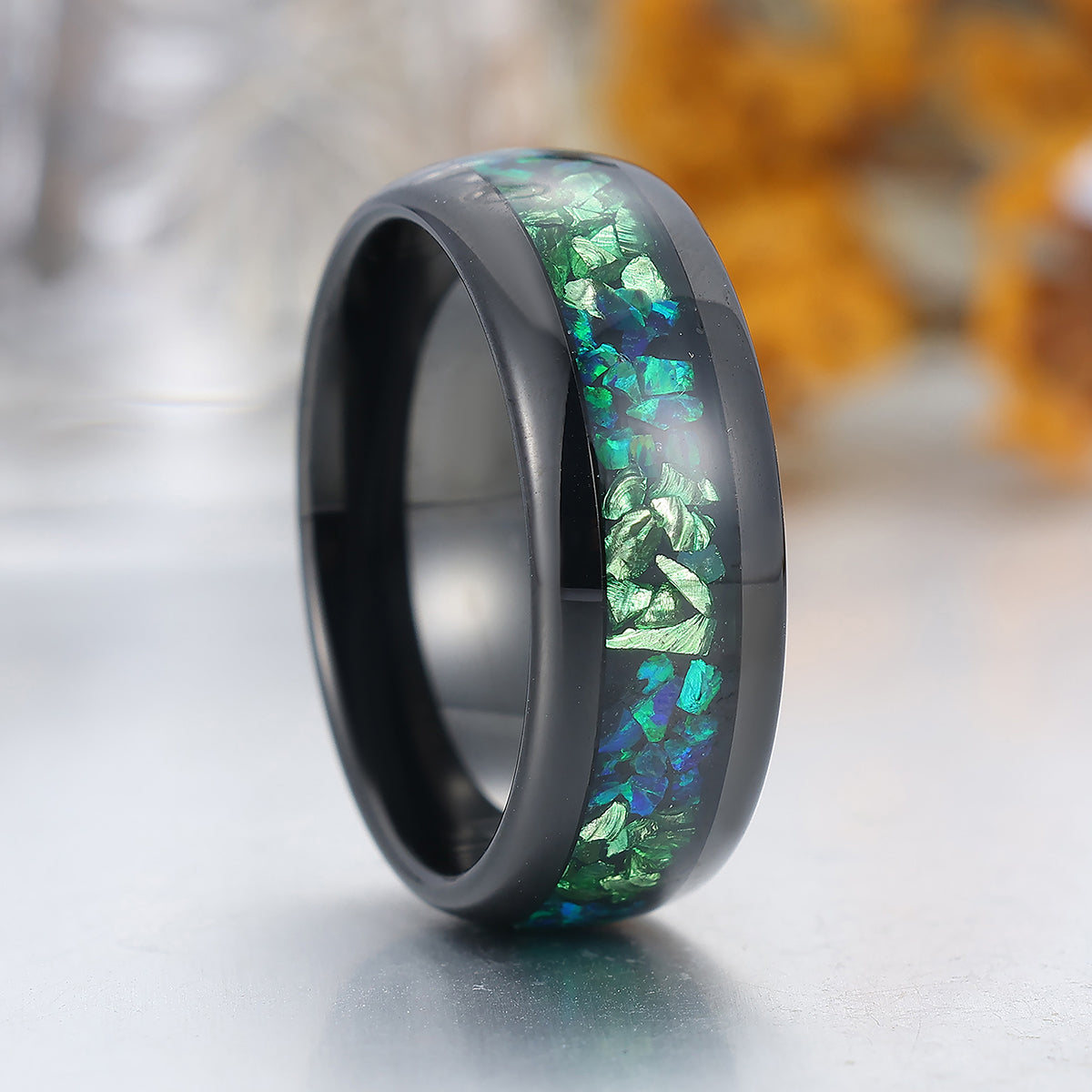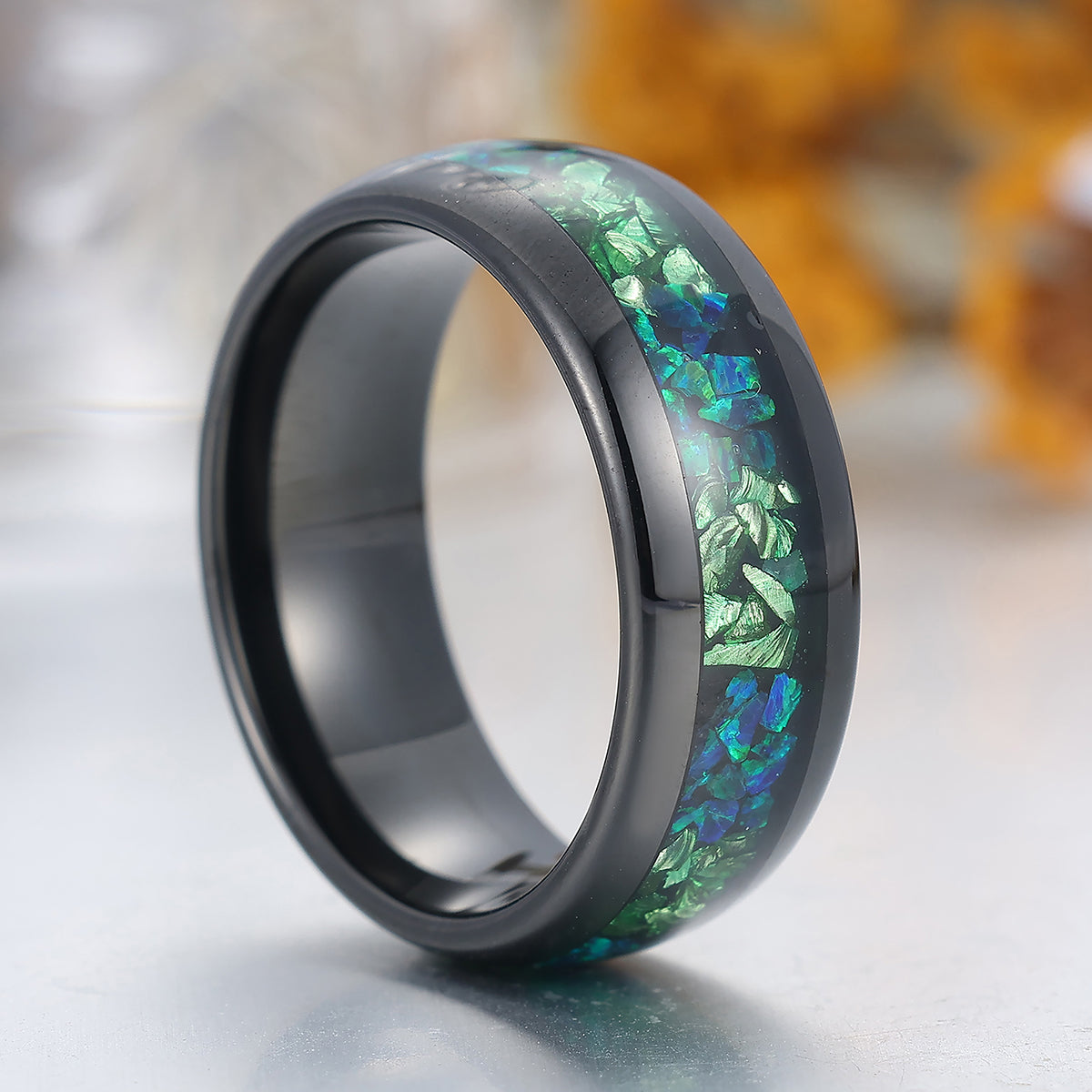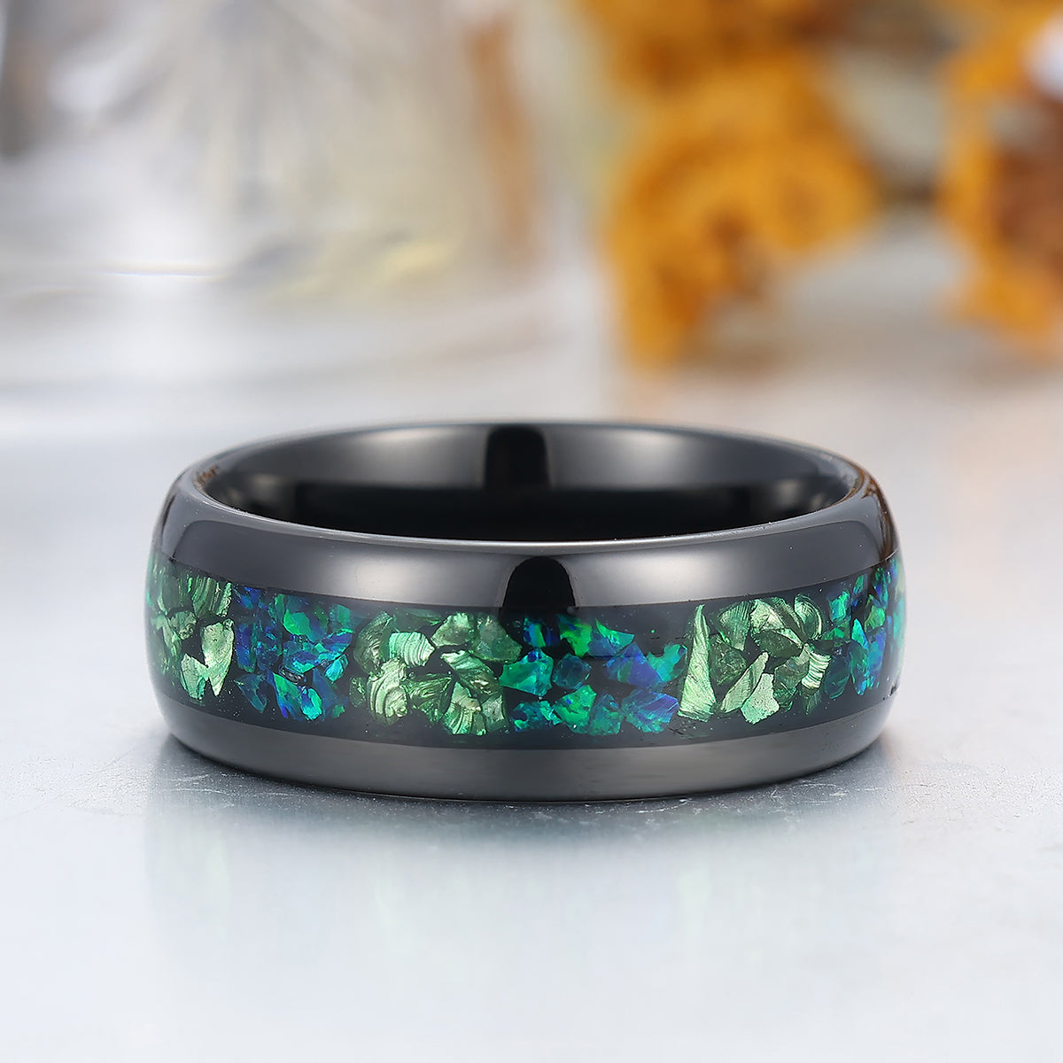Green Emerald Peacock Green Opal Inlay Mens Tungsten Ring 8mm Black Unisex Ring Wedding Band