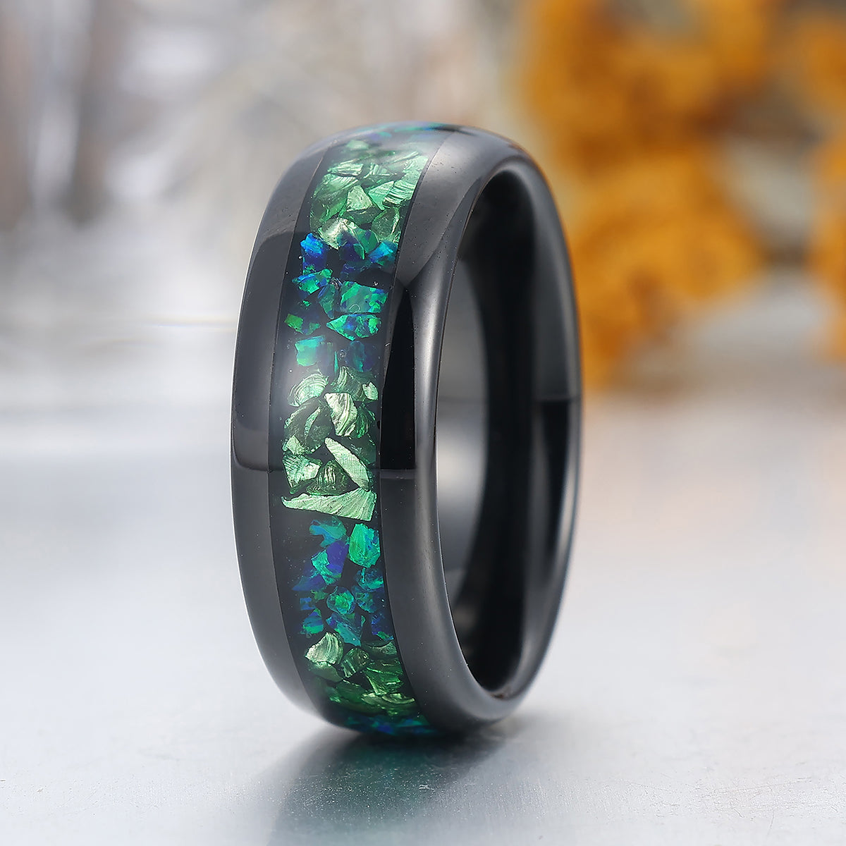 Metal Type: Tungsten Carbide - Crushed Lab Emerald and Peacock Green Opal Inlay - Hypoallergenic