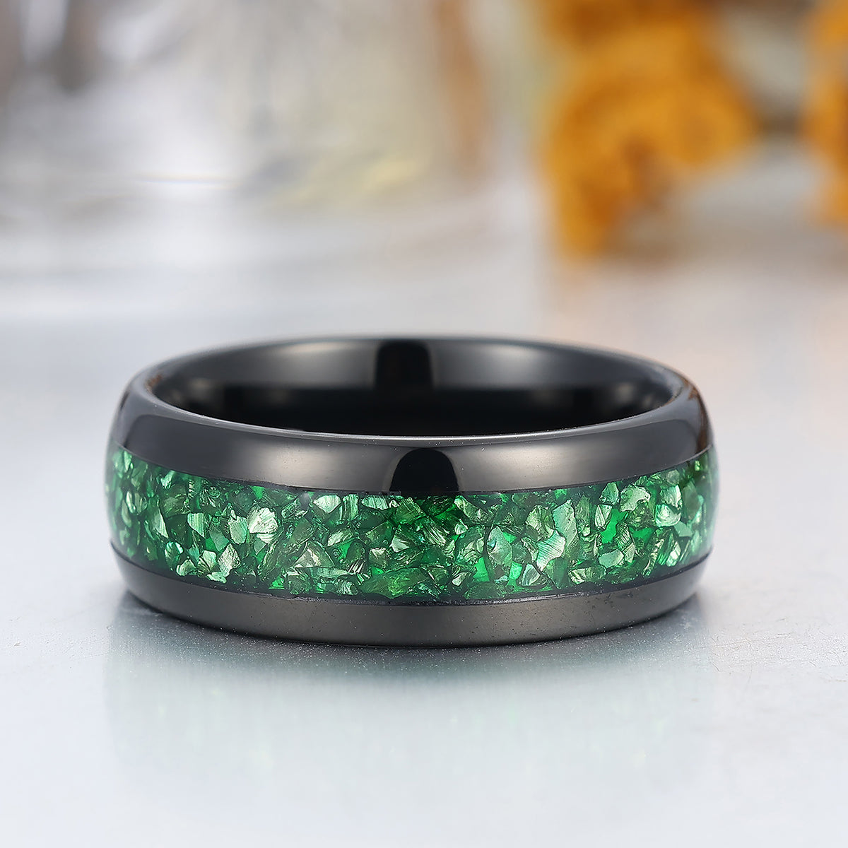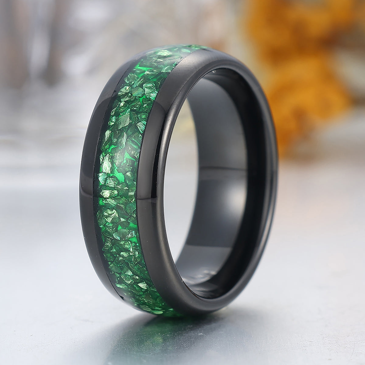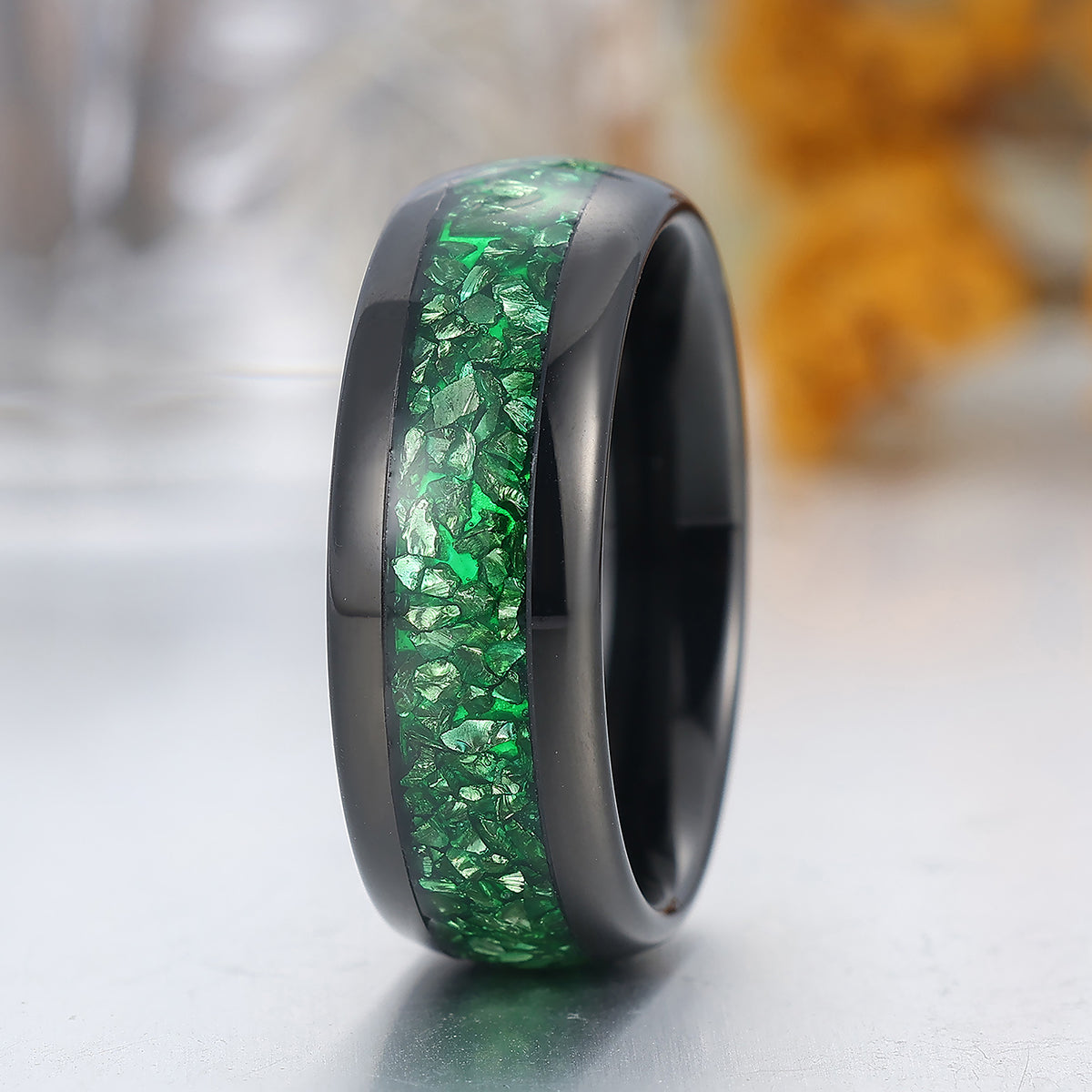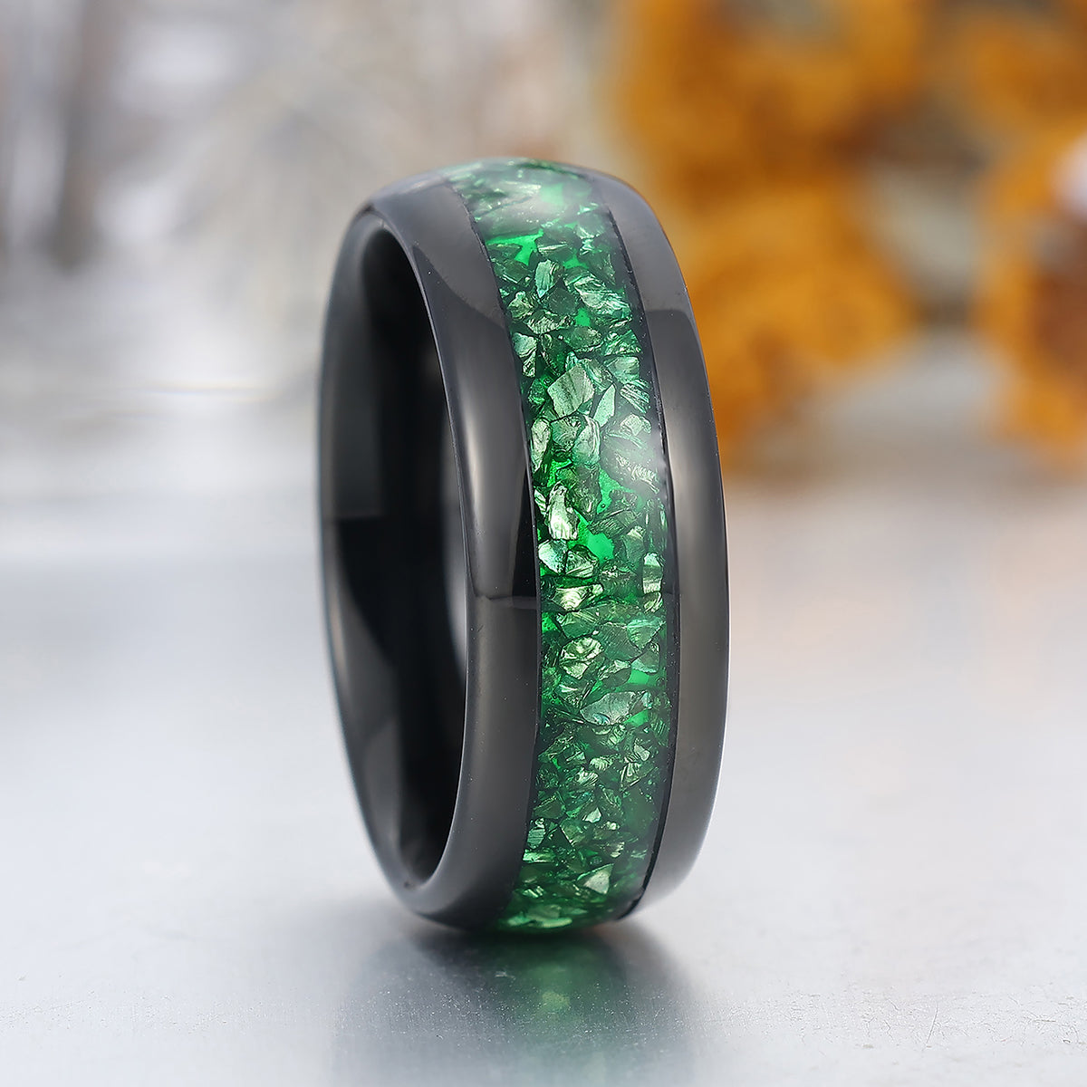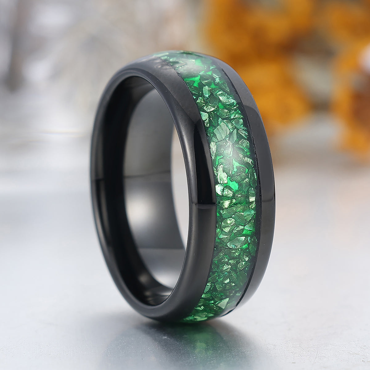 Green Emerald Tungsten Carbide Ring Polished Dome Black Men's Wedding Band 8mm Green Ring