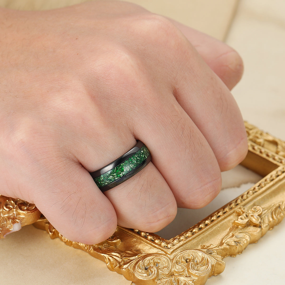 Metal Type: Tungsten Carbide - Crushed Lab Emerald Inlay - Hypoallergenic
